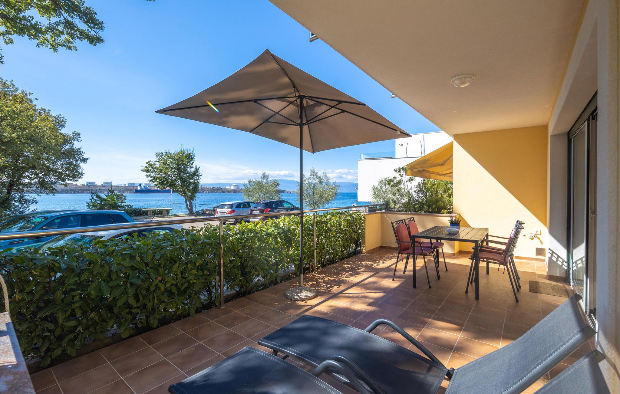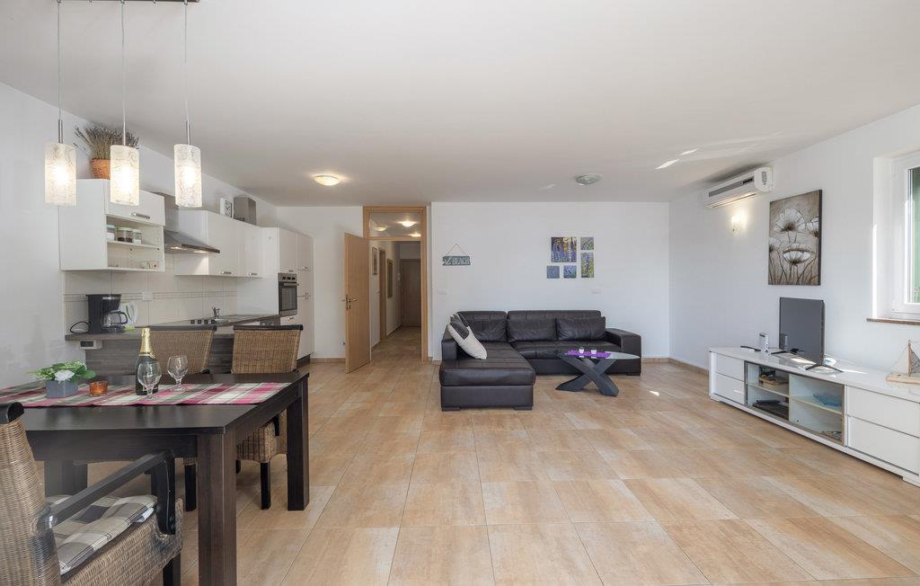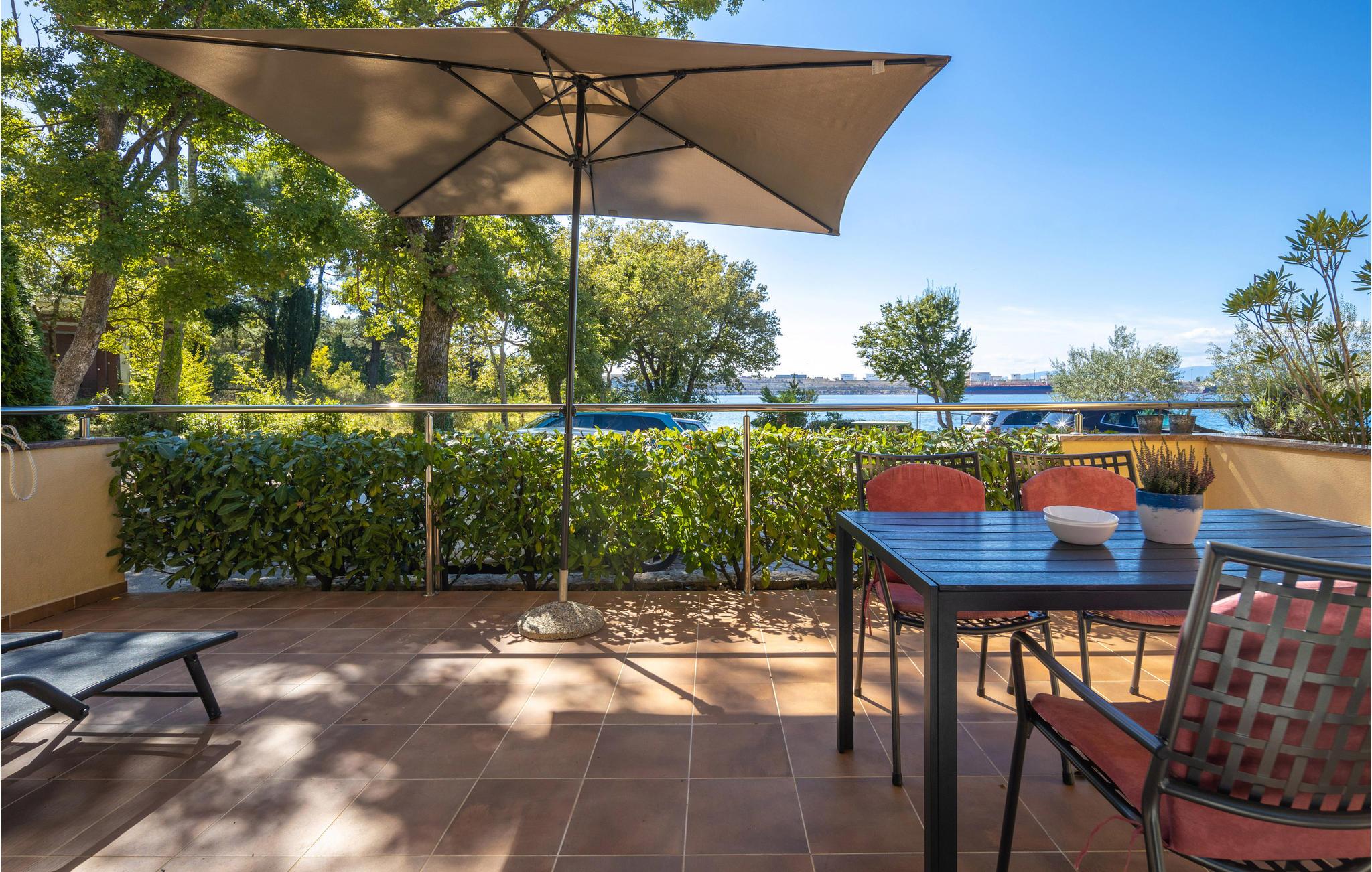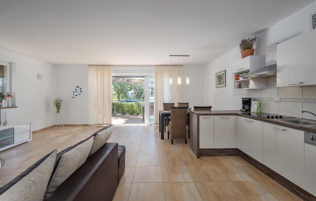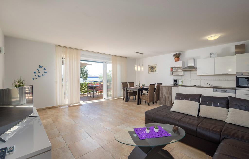 Im Erdgeschoß eines Apartmenthauses in unmittelbarer Nähe zum Meer, befindet sich diese geräumige und modern eingerichtete Ferienwohnung. Das Haus liegt in einer ruhigen Gegend und ist von Pflanzen umgeben, was Ihnen einen angenehmen Aufenthalt auf Ihrer privaten Terrasse ermöglicht. Hier können Sie es sich mit Ihrer Familie in heimeliger heller Atmosphäre gemütlich machen, gemeinsam Ihre Mahlzeiten verspeisen und den Blick über die Bucht schweifen lassen, während Sie an Ihrem Kaffee schlürfen.
