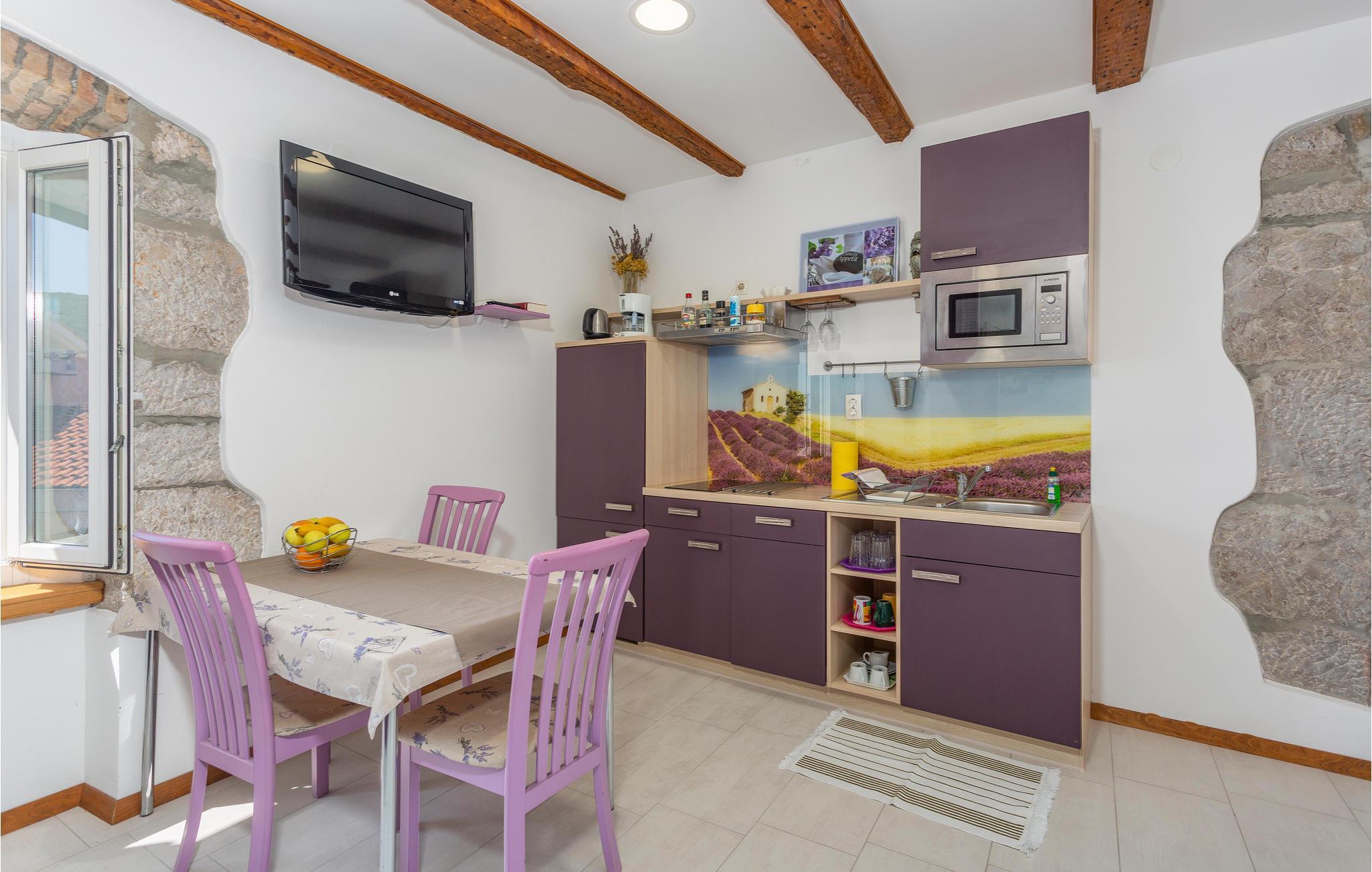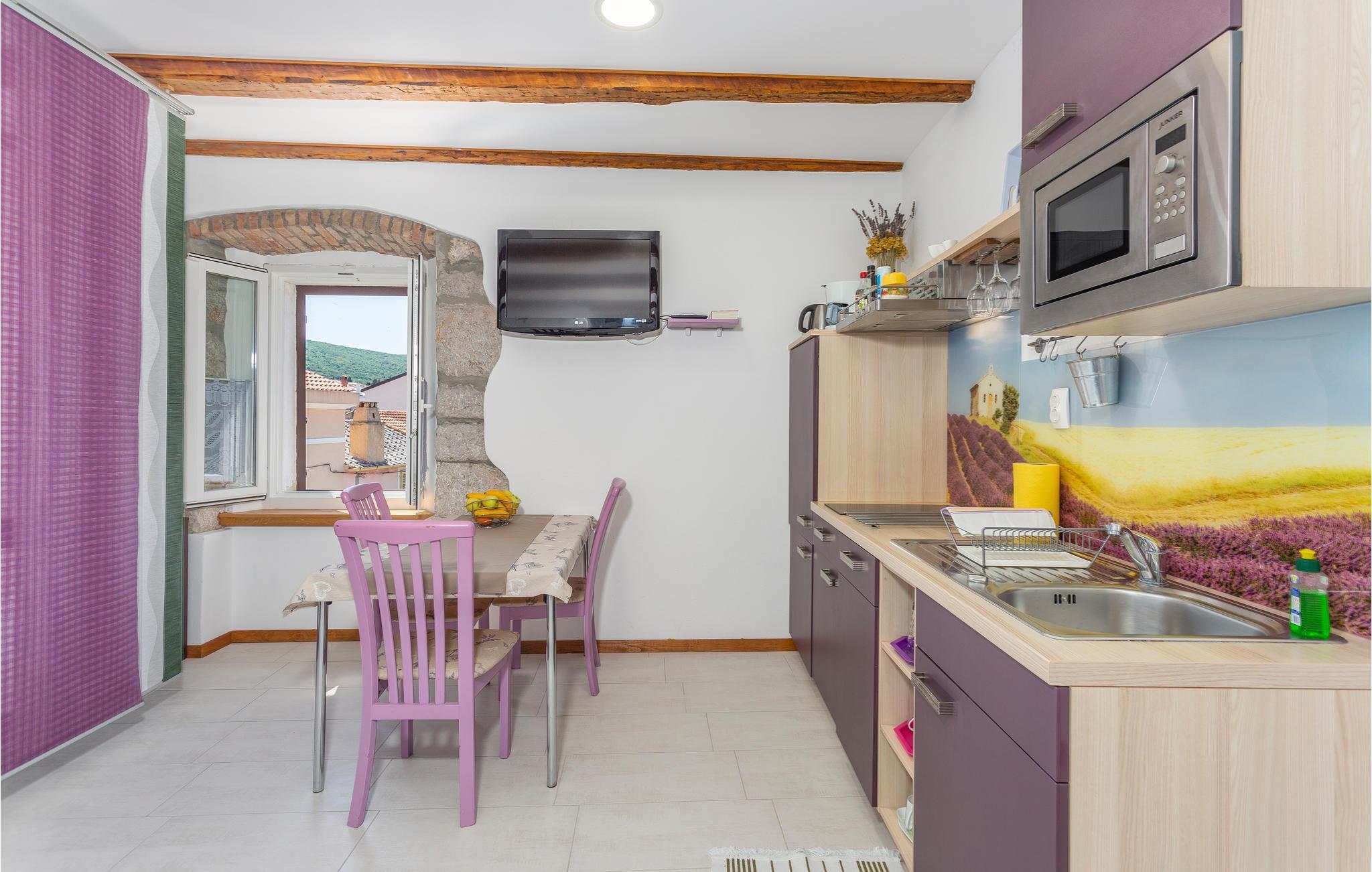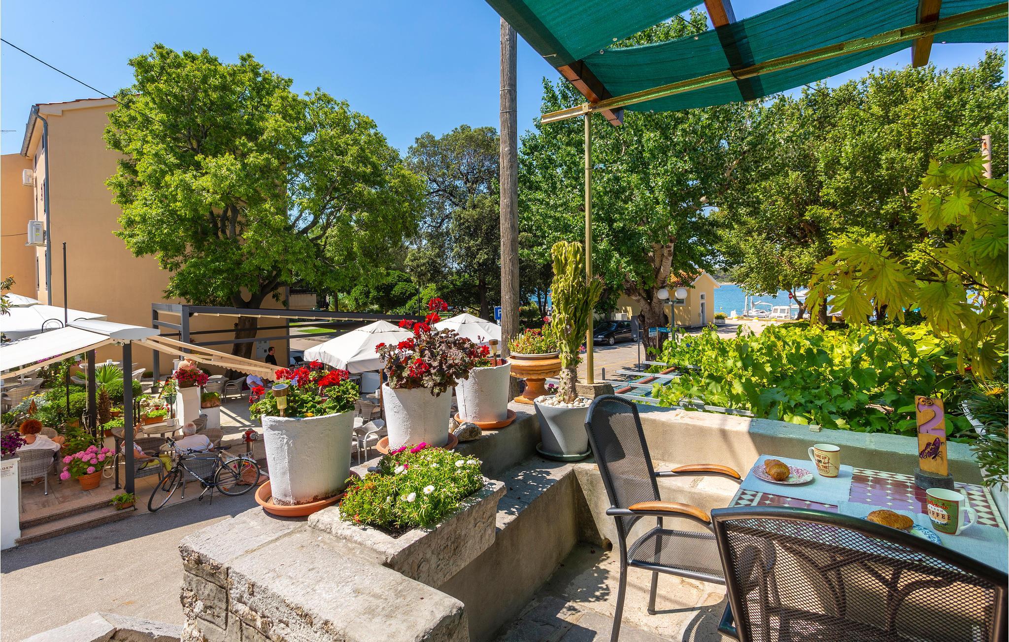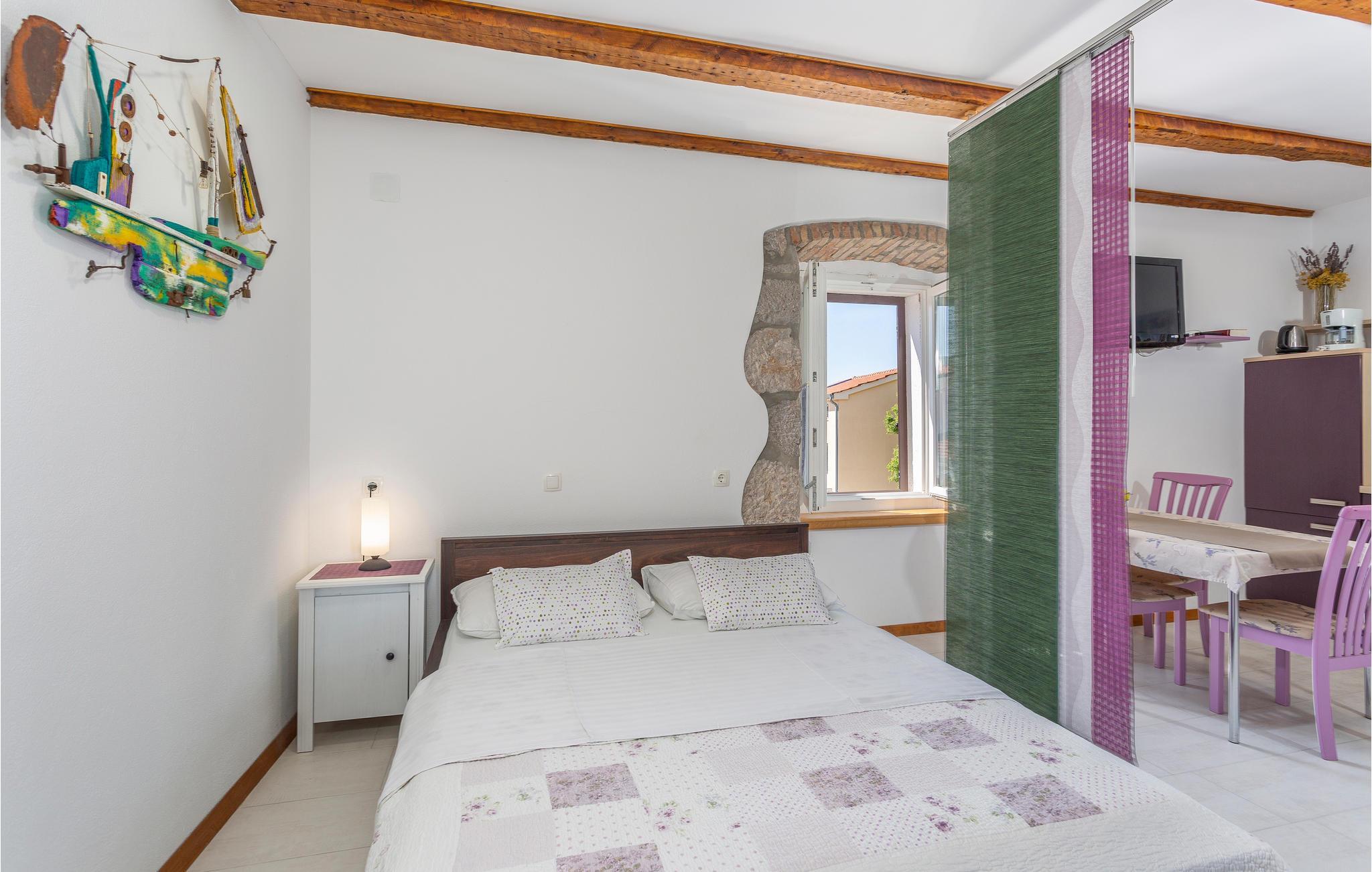 Tilbring en vidunderlig ferie i den smukke by Punat på den gyldne ø Krk. Dette omhyggeligt renoverede stenhus med tre mindre lejligheder ligger i centrum af byen. Jeres lejlighed ligger på anden sal og er smagfuldt og romantisk indrettet. Lejligheden har sin egen lille terrasse, som er bevokset med vinstokke, og hvorfra man kan se havet, som ligger kun 50 meter væk. Herfra kan I også betragte travlheden i caféerne og restauranterne.