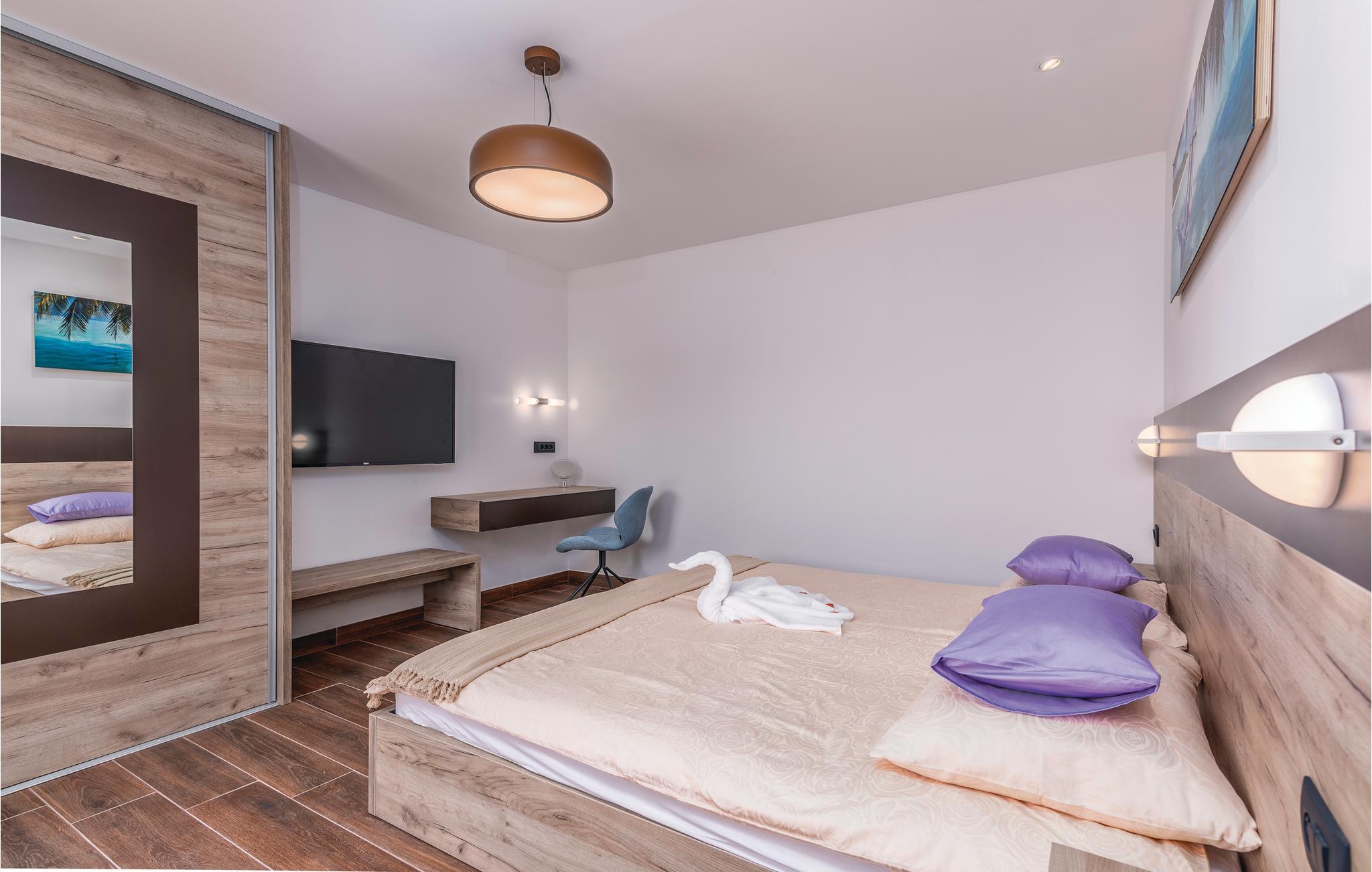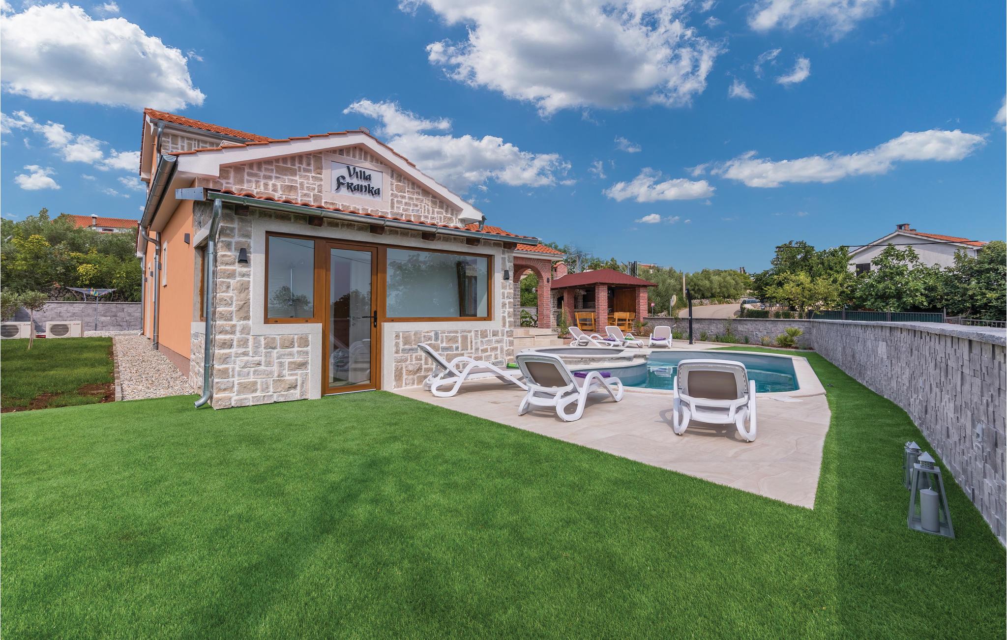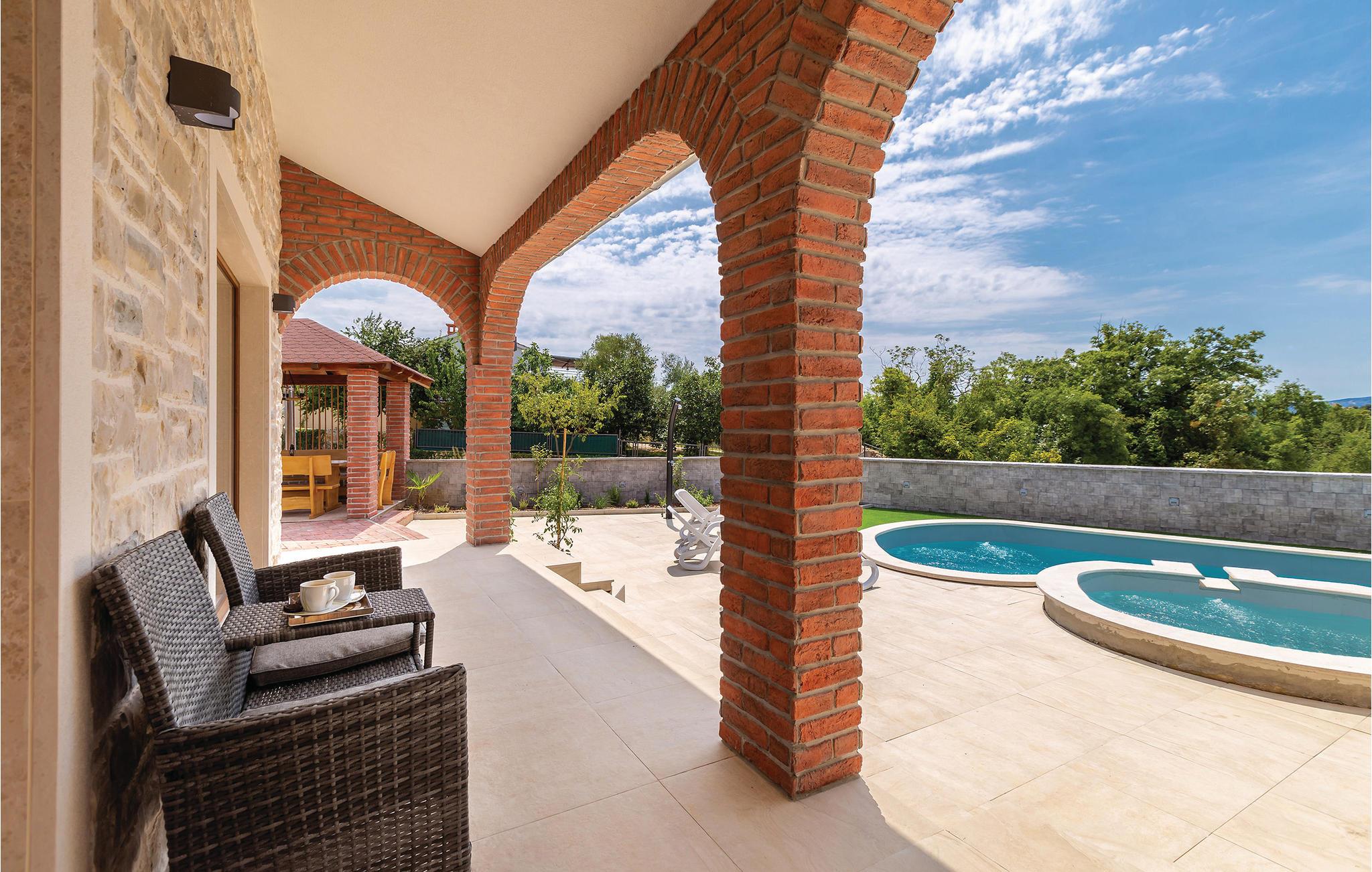 Dette skønne feriehus med pool ligger i Skrpcici, en lille by der ligger på den vestlige del af øen Krk. Det er fordelt på to etager, med en rummelig stue i åben forbindelse med køkken og udgang til poolen og den overdækkede terrasse med grill i stueplan. Fra huset er der ikke langt til Pinezicis strande eller til større byer som Malinska, Krk og Baška. Øens historie strækker sig helt tilbage til antikke, så her kan I fordybe jer i mange interessante historiske seværdigheder. Hver eneste af de små byer på øen, har noget særligt at byde på. Til en aktiv ferie er der markerede vandre- og cykelstier, der er dykker- og wakeboardkurser i Punta.