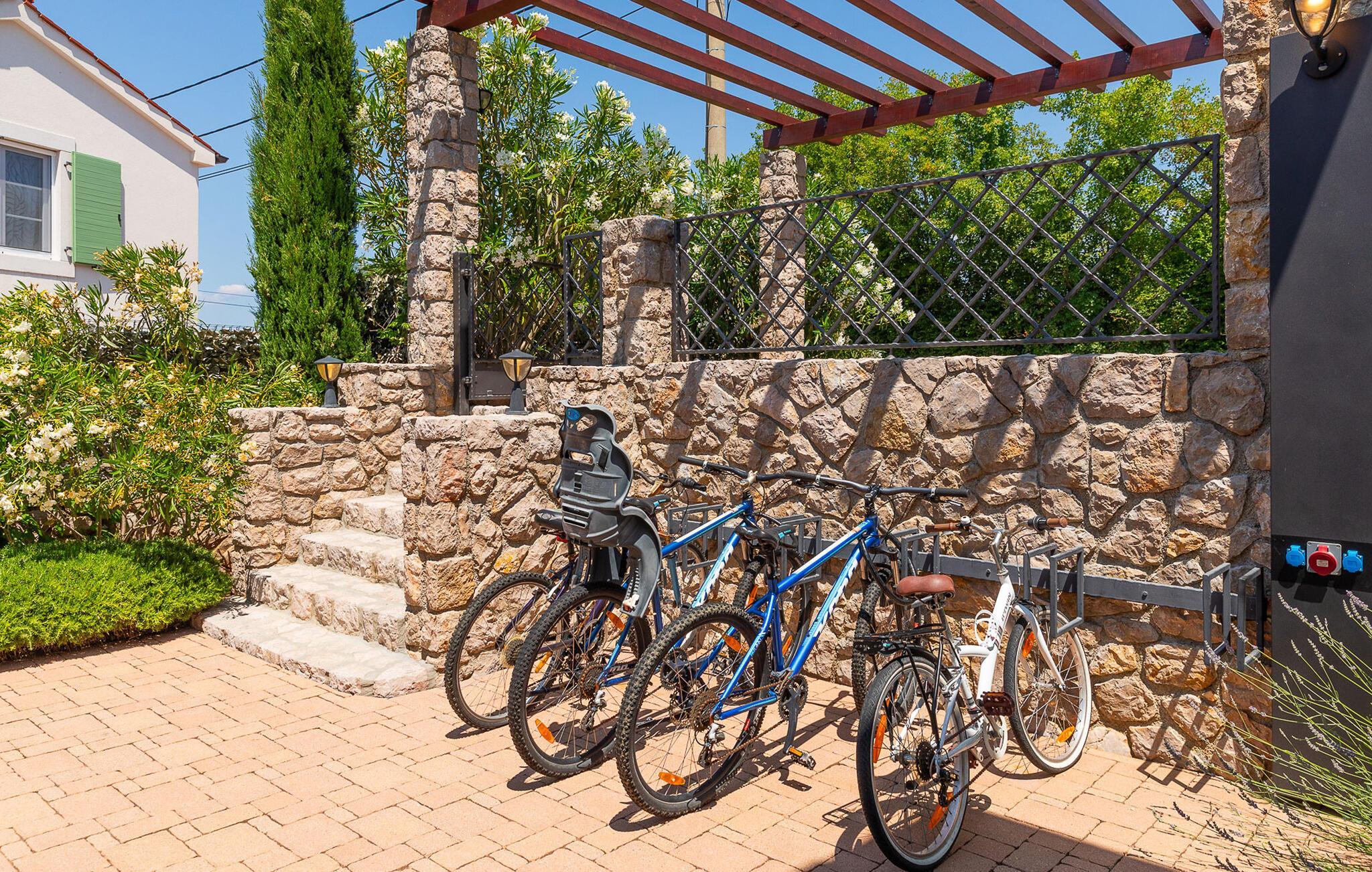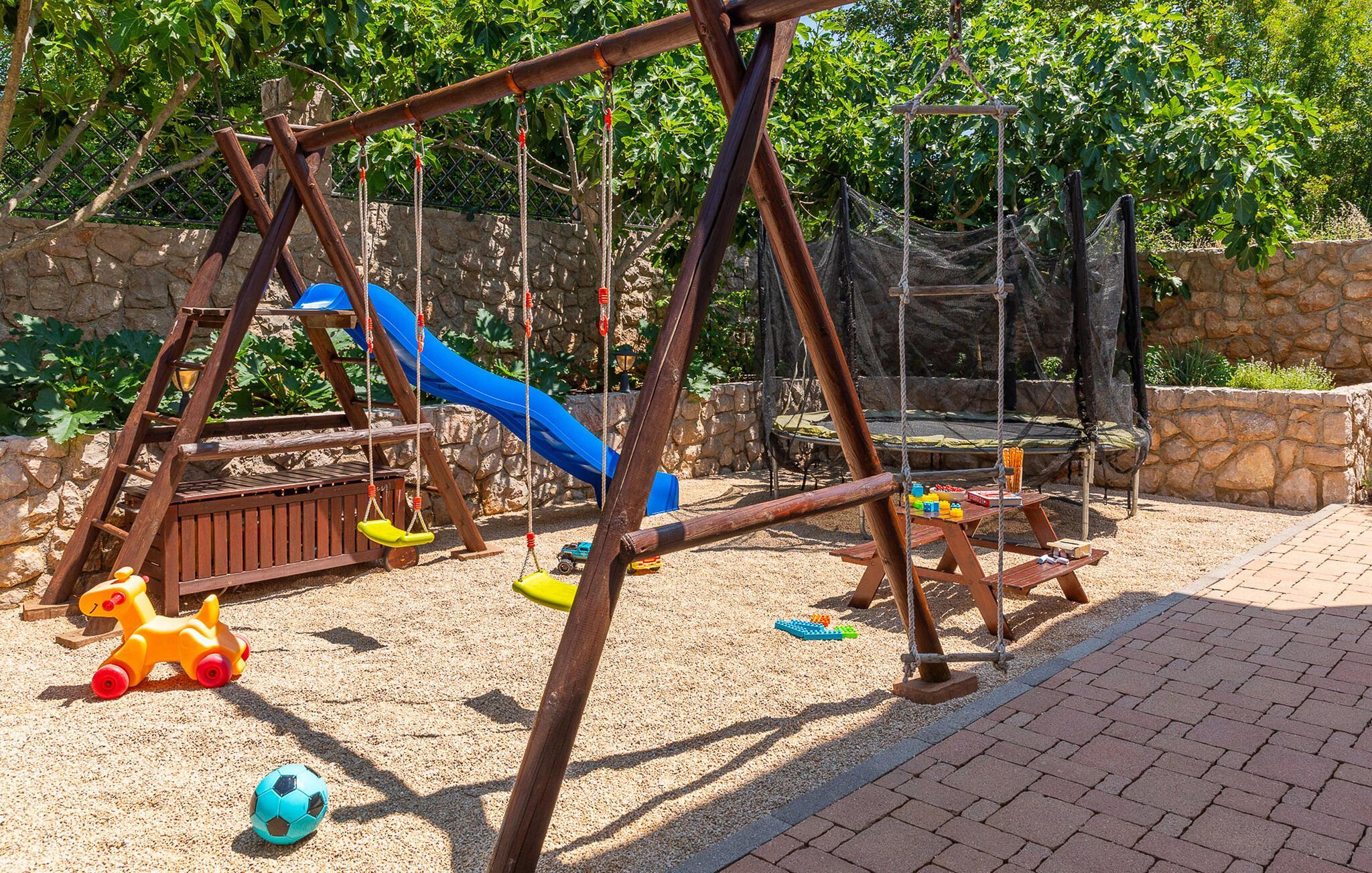 Den luksuriøse Villa Mia er det perfekte valg for ægte afslapning og naturelskere. Beliggenheden taget i betragtning giver det jer mulighed for at slappe af langt fra hverdagens stress og jag og nyde det vidunderlige landskab i traditionel middelhavsarkitektur. Villaen er fremragende møbleret og, endnu vigtigere, tilbyder jer fuldstændig privatliv. Villa Mia ligger på den smukke ø Krk, kendt for sine smukke strande, fremragende vin og traditionelle retter. Sørg for at udforske det smukke landskab i dette område og besøg byerne Krk, Vrbnik og Baska for at nyde fantastiske gastronomiske tilbud og rige historiske seværdigheder. Villaen består af 3 flot indrettede soveværelser og 3 badeværelser plus et separat toilet. Soveværelserne er rummelige og har tv og aircondition. Villaen kan komfortabelt rumme 6 personer (+2 ekstra personer på sofaen i stuen). Villaen har et fuldt udstyret moderne køkken til at imødekomme alle jeres behov. Køkkenet åbner ud til spisepladsen og den hyggelige stue. Dette lyse værelse har åbent plan og giver gæsterne en vidunderlig udsigt over haven og den opvarmede swimmingpool. Hele villaen har central gulvvarme, hvilket gør den til det perfekte valg selv for ophold uden for sæsonen. Villaen er fuldstændig indhegnet og omgivet af grønne områder, hvilket giver jer fuldstændig frihed til privatliv og afslapning. Udendørsområdet byder også på en storslået swimmingpool med liggestole. Den opvarmede pool er på 35 m². Området omkring swimmingpoolen er direkte forbundet med den udendørs spise- og grillplads, også udstyret med køleskab og gaskomfur, hvor I kan nyde frisklavede måltider med jeres familie og venner. I den fuldt indhegnede gård er der en legeplads udstyret med rutsjebane, gynge og trampolin. Fire gratis mountainbikes er tilgængelige for at udforske øen. I nærheden af villaen er der en lokal produktion af ost, æg og kød til at smage og nyde. For gæster, der ankommer med en elbil, tilbyder villaen en ellader på den rummelige parkeringsplads. I villaens helt indhegnede have er der også sikre parkeringspladser og ladefaciliteter til jeres elcykler. Når I ankommer til Villa Mia, vil jeres familie og venner have en ideel middelhavsferie, som den engang var. Bemærk venligst, at denne ejendom ikke accepterer ungdomsgrupper eller polterabends. En ungdomsgruppe i denne ejendom består af personer under 30 år. Book ikke denne ejendom, hvis I er en ungdomsgruppe eller polterabend, da jeres reservation vil blive afvist efter reservationen, hvilket også kan være tilfældet ved ankomst til overnatningsstedet eller under jeres ophold, og I vil ikke modtage en refusion.