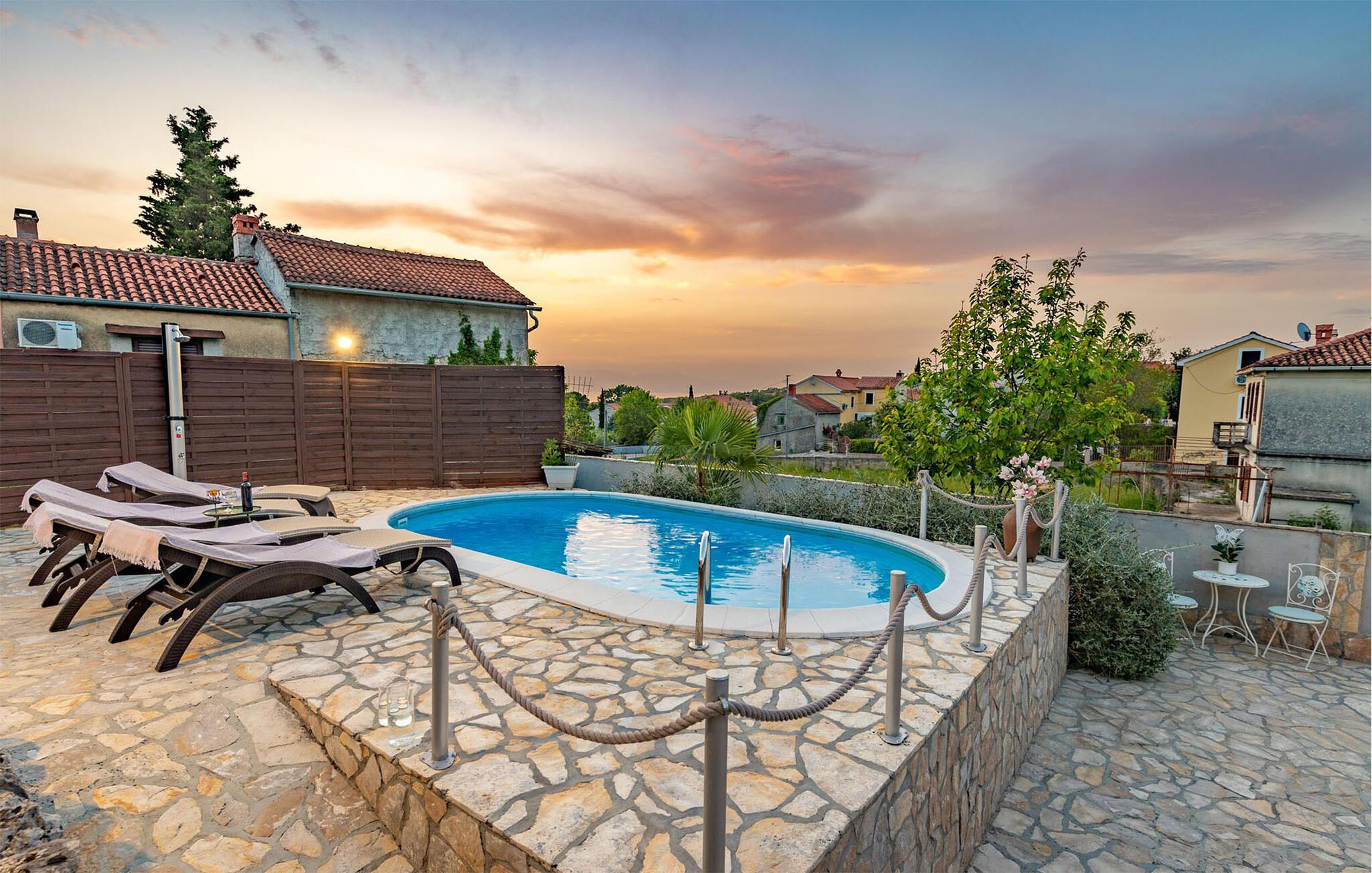 I den lille by Sveti Vid Miholjice, tæt på Malinska og på øen Krk, ligger denne moderne og funktionelt indrettede halvdel af et dobbelthus. I stueetagen ligger den rummelige dagligstue med køkken og spiseområde, mens de to soveværelser ligger ovenpå. Boligen er et ideelt feriemål til familieferie. På den smukke grund har I en terrasse med grill til rådighed, hvor I kan tilbringe de lange sommerdage og –aftener. I byen Malinska, der ligger i nærheden, kan I finde de nærmeste badestrande, mens hele øen bugner kulturelle, sportslige og underholdningstilbud. Prøv de lokale kulinariske specialiteter og regionale vine, der vil runde jeres perfekte ferie af. Poolen ligger på en del af grunden, der er adskilt fra huset af en lille gangsti. Her kan I nyde de varme sommerdage.