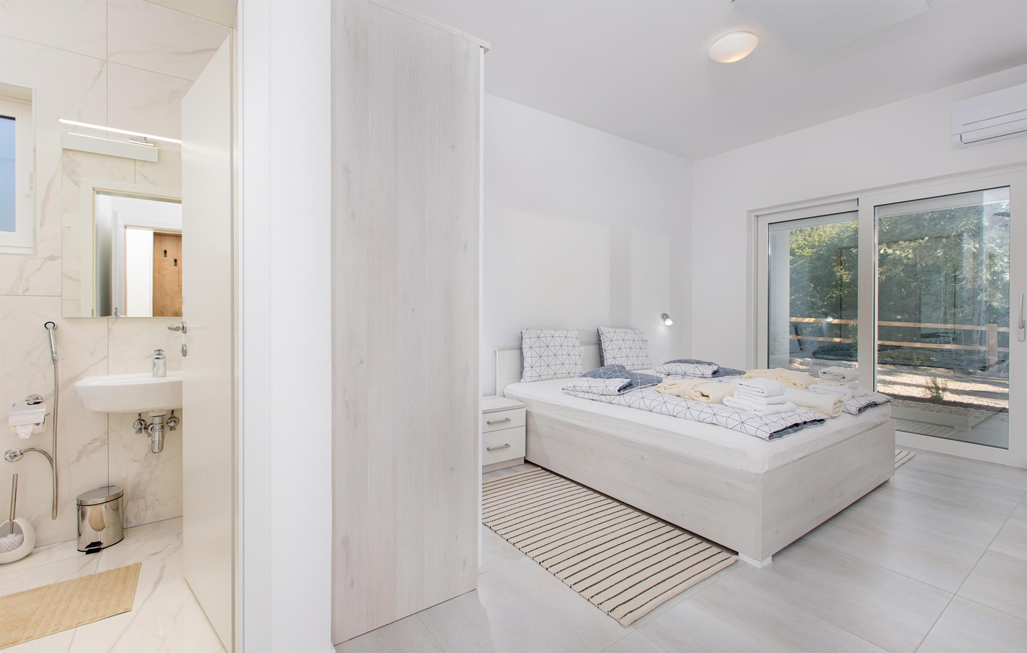 Interiøret er fint og rummeligt, og stuen og køkkenet er fuldt udstyret med alt, hvad du har brug for. Soveværelserne har eget badeværelse. Huset ligger i et meget roligt område omgivet af smuk natur, men alligevel er der butikker, restauranter og smukke strande i nærheden.