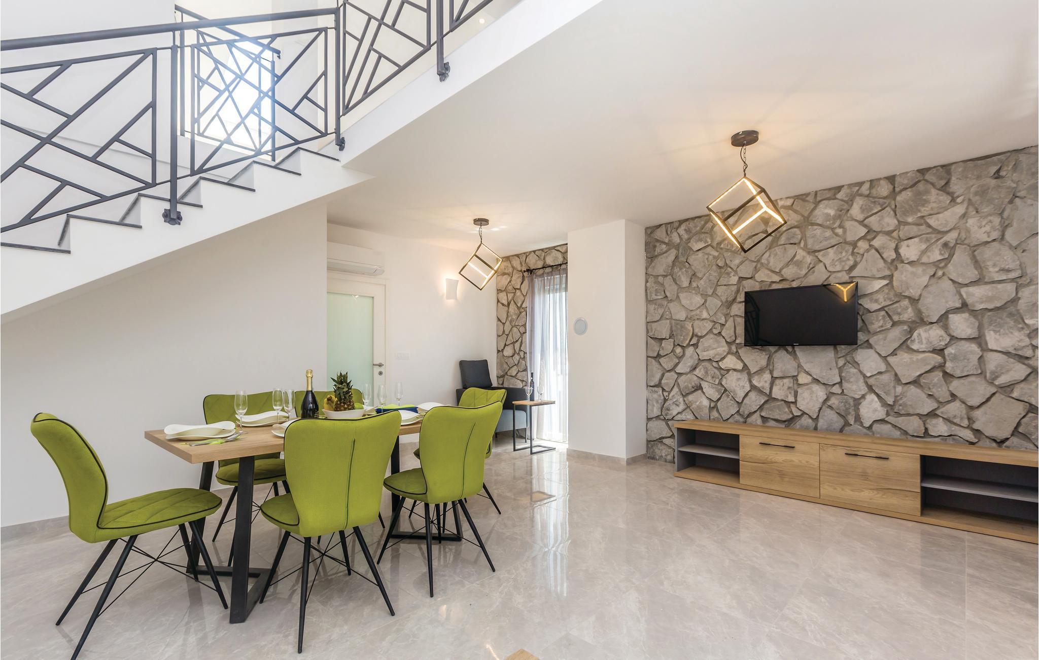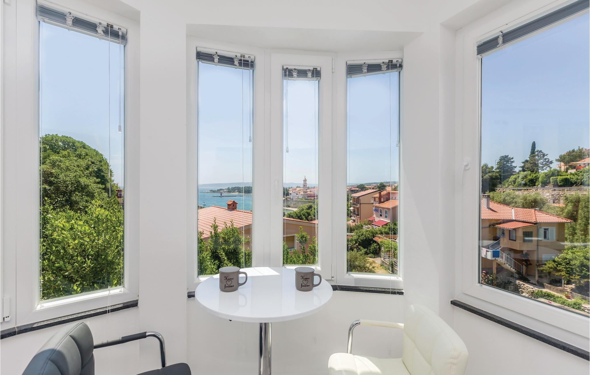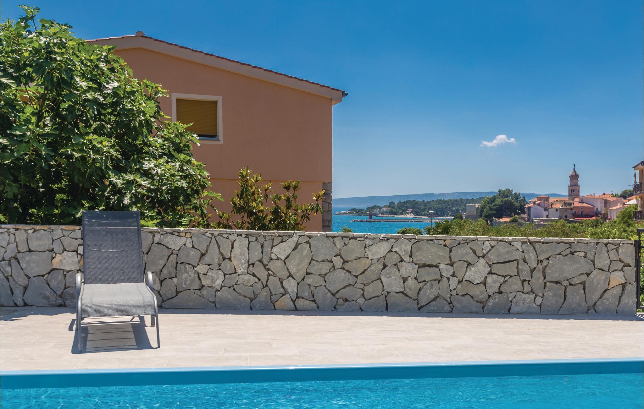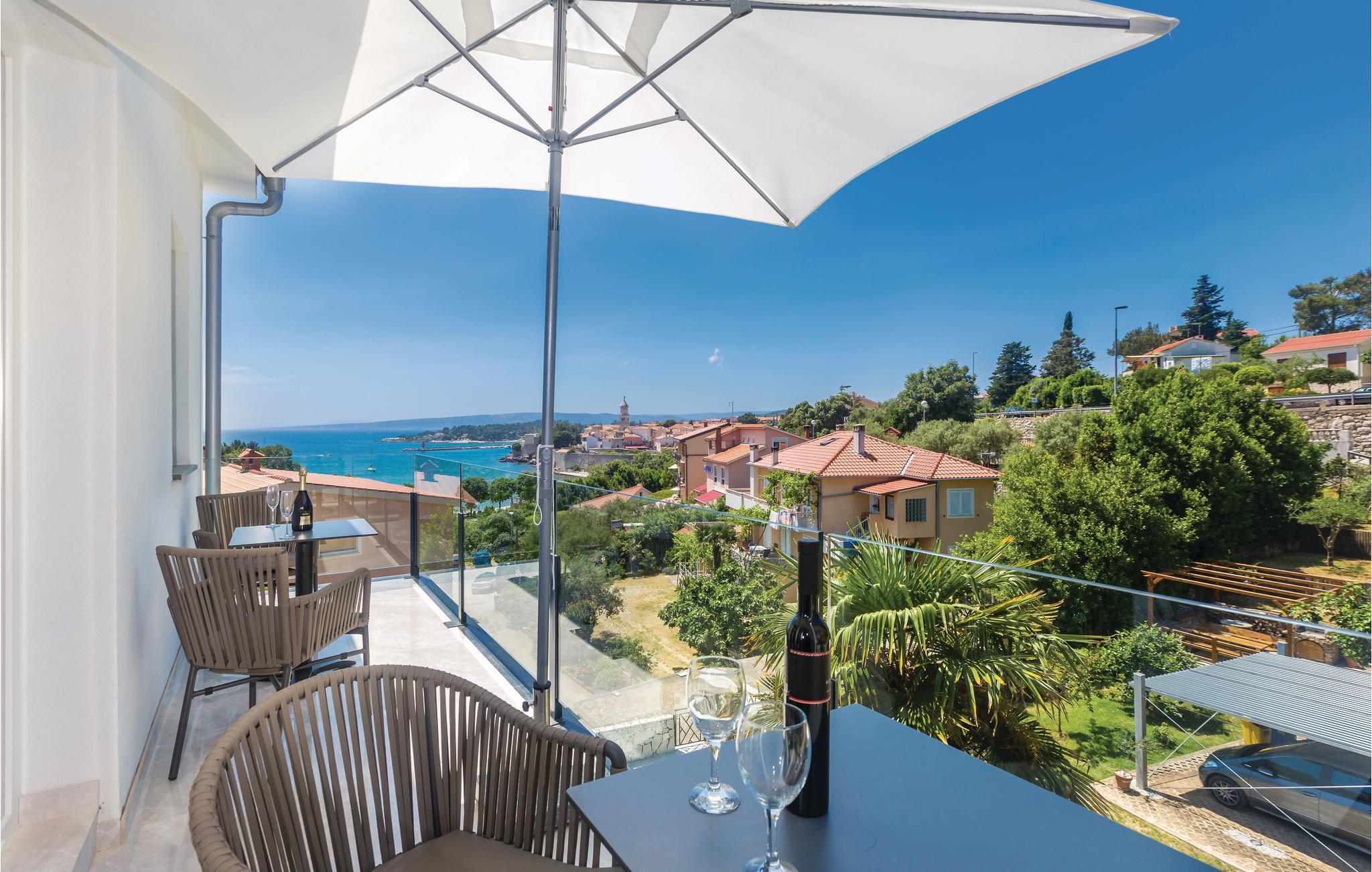 Fra denne pragtfulde ferielejlighed er der en skøn udsigt over bugten og Krks smukke gamle bydel. Lejligheden ligger i en privat ejendom med egen pool og ejendommen ligger højt over den gamle bydel. Her er en skøn udsigt over havet og byen. Her er også et meget veludstyret køkken og en lys og indbydende indretning. På lejlighedens underste etage der ligger på anden sal, er der et soveværelse, et badeværelse, et køkken og en stue med spisestue. En anden trappe fører op til tredje sal med et soveværelse på en stor hems, der er afgrænset med gelænder. Her er skrå vægge med en laveste loftshøjde i siden på ca. 145 cm og her er badeværelse en suite. I haven er der en pool og en solskinsterrasse og vil I svømme i havet, så er der kun få minutters gang til strande og I er i samme afstand af centrum af byen. Ejer har en restaurant og hvor I får særlige priser på både frokost og aftensmad efter forudgående aftale.