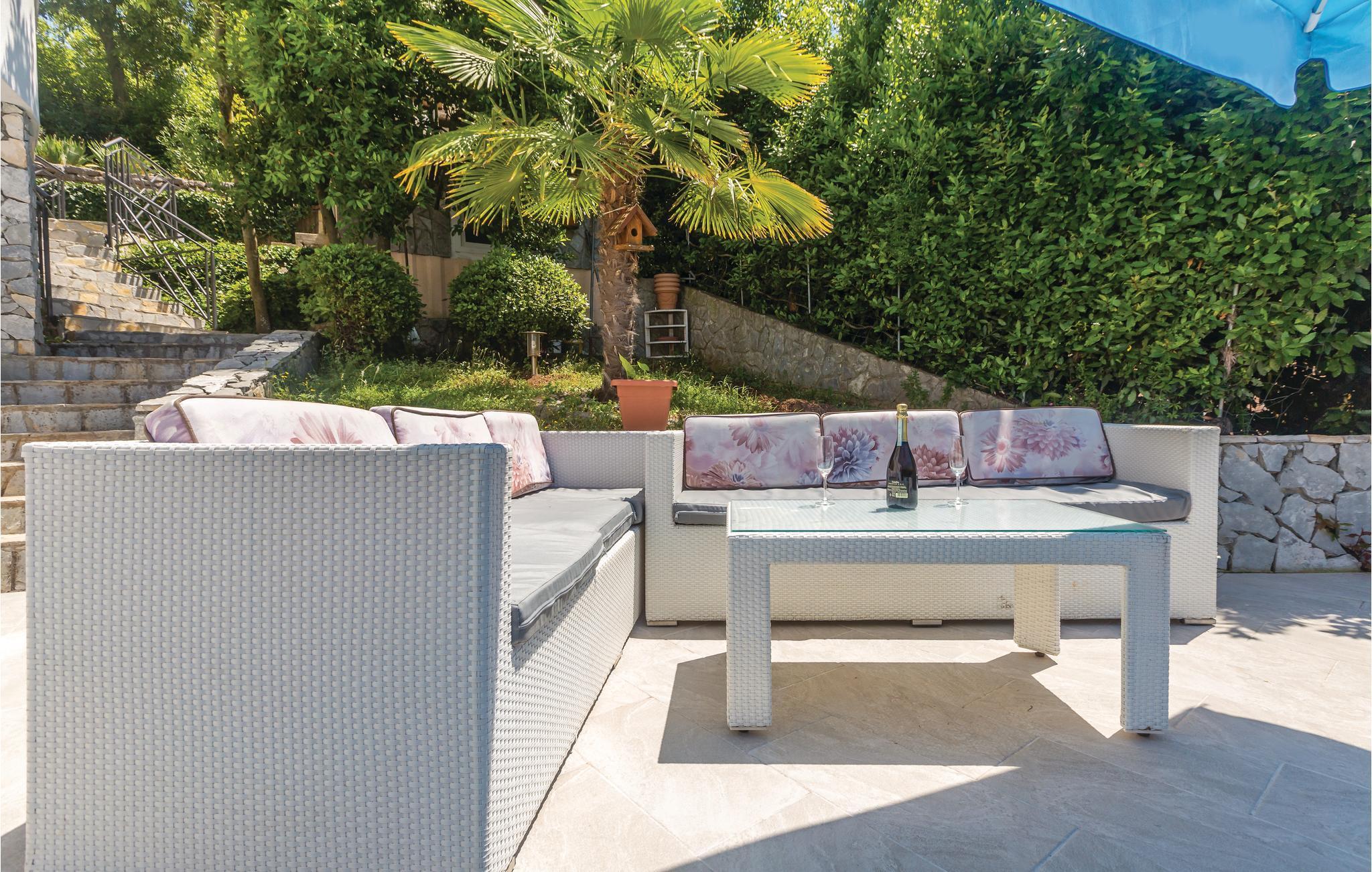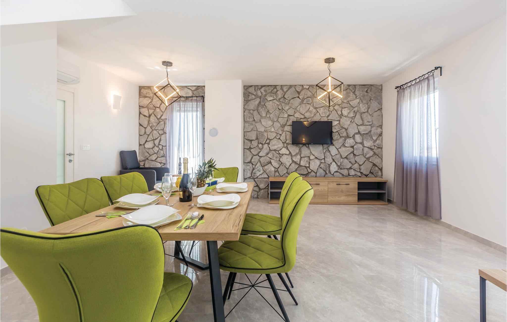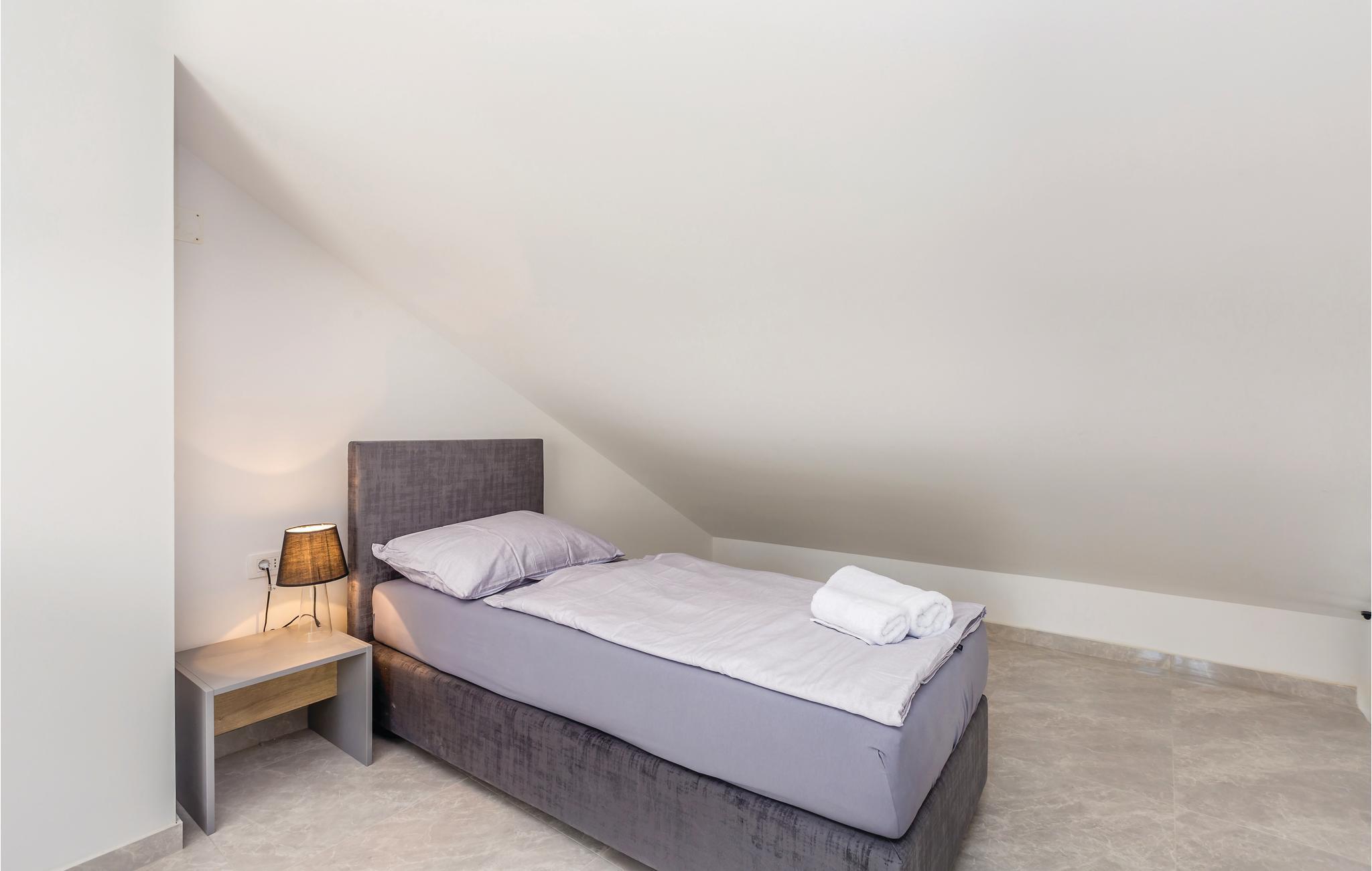 Fra denne pragtfulde ferielejlighed er der en skøn udsigt over bugten og Krks smukke gamle bydel. Lejligheden ligger i en privat ejendom med egen pool og ejendommen ligger højt over den gamle bydel. Her er en skøn udsigt over havet og byen. Her er også et meget veludstyret køkken og en lys og indbydende indretning. På lejlighedens underste etage der ligger på anden sal, er der et soveværelse, et badeværelse, et køkken og en stue med spisestue. En anden trappe fører op til tredje sal med et soveværelse på en stor hems, der er afgrænset med gelænder. Her er skrå vægge med en laveste loftshøjde i siden på ca. 145 cm og her er badeværelse en suite. I haven er der en pool og en solskinsterrasse og vil I svømme i havet, så er der kun få minutters gang til strande og I er i samme afstand af centrum af byen. Ejer har en restaurant og hvor I får særlige priser på både frokost og aftensmad efter forudgående aftale.