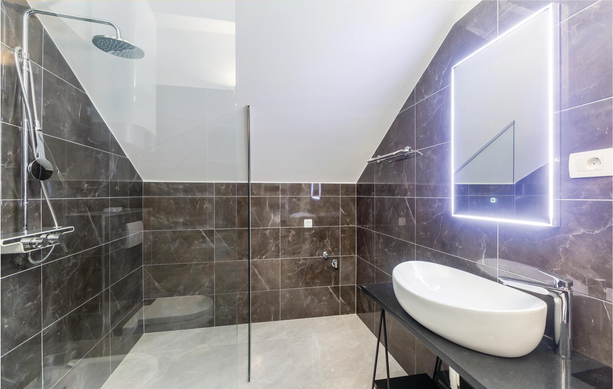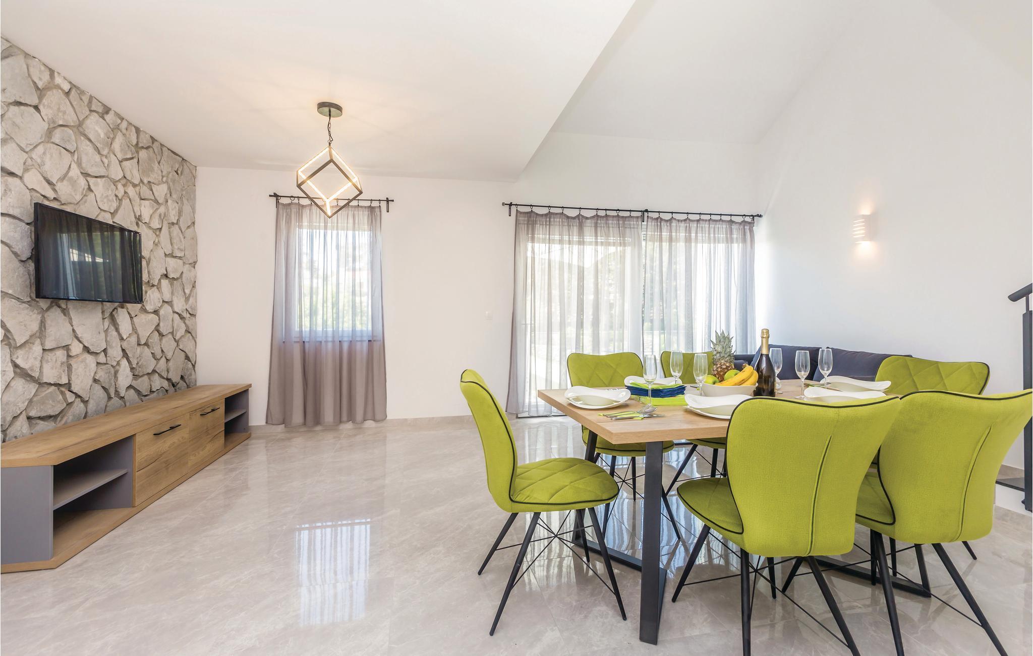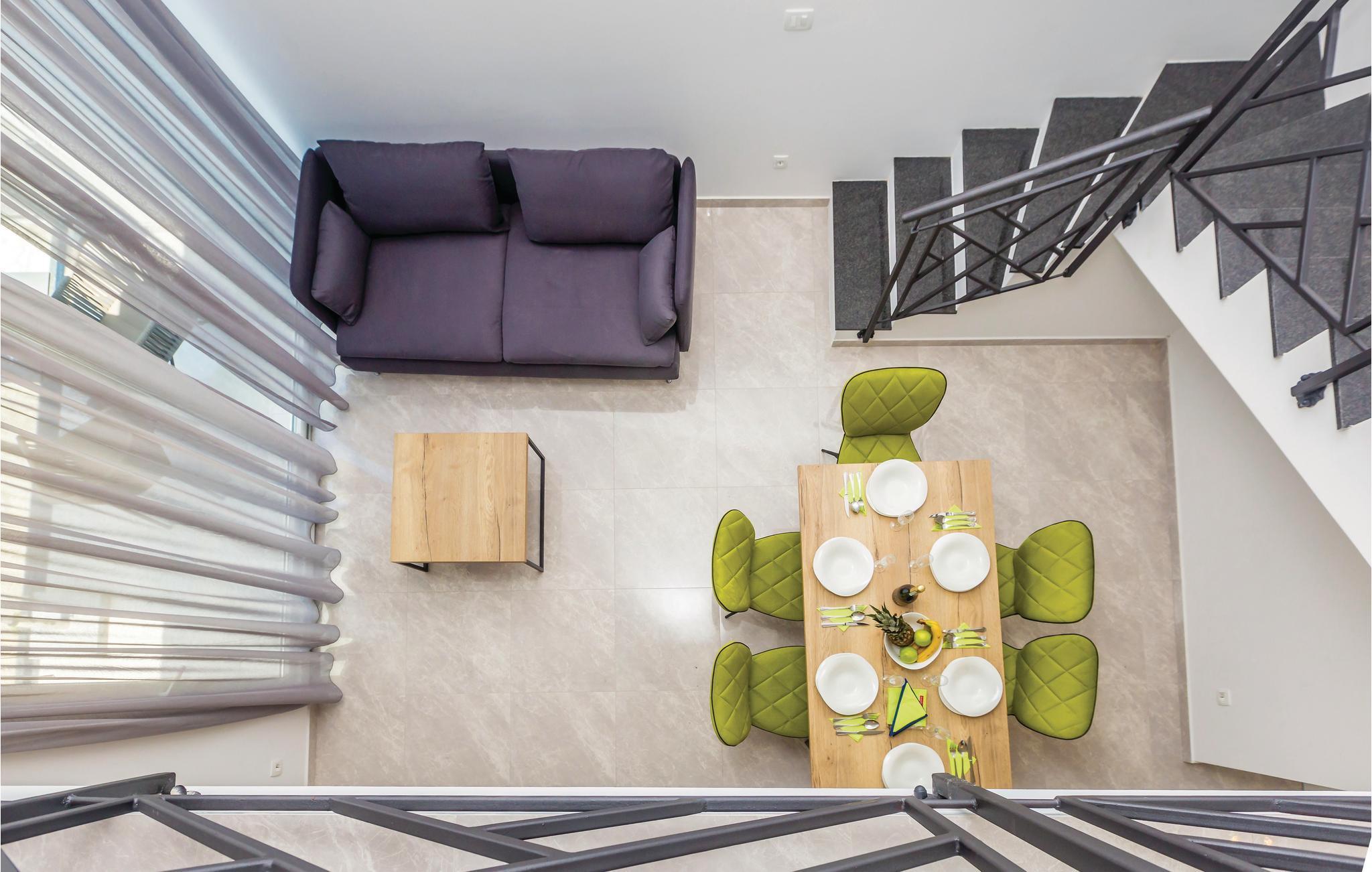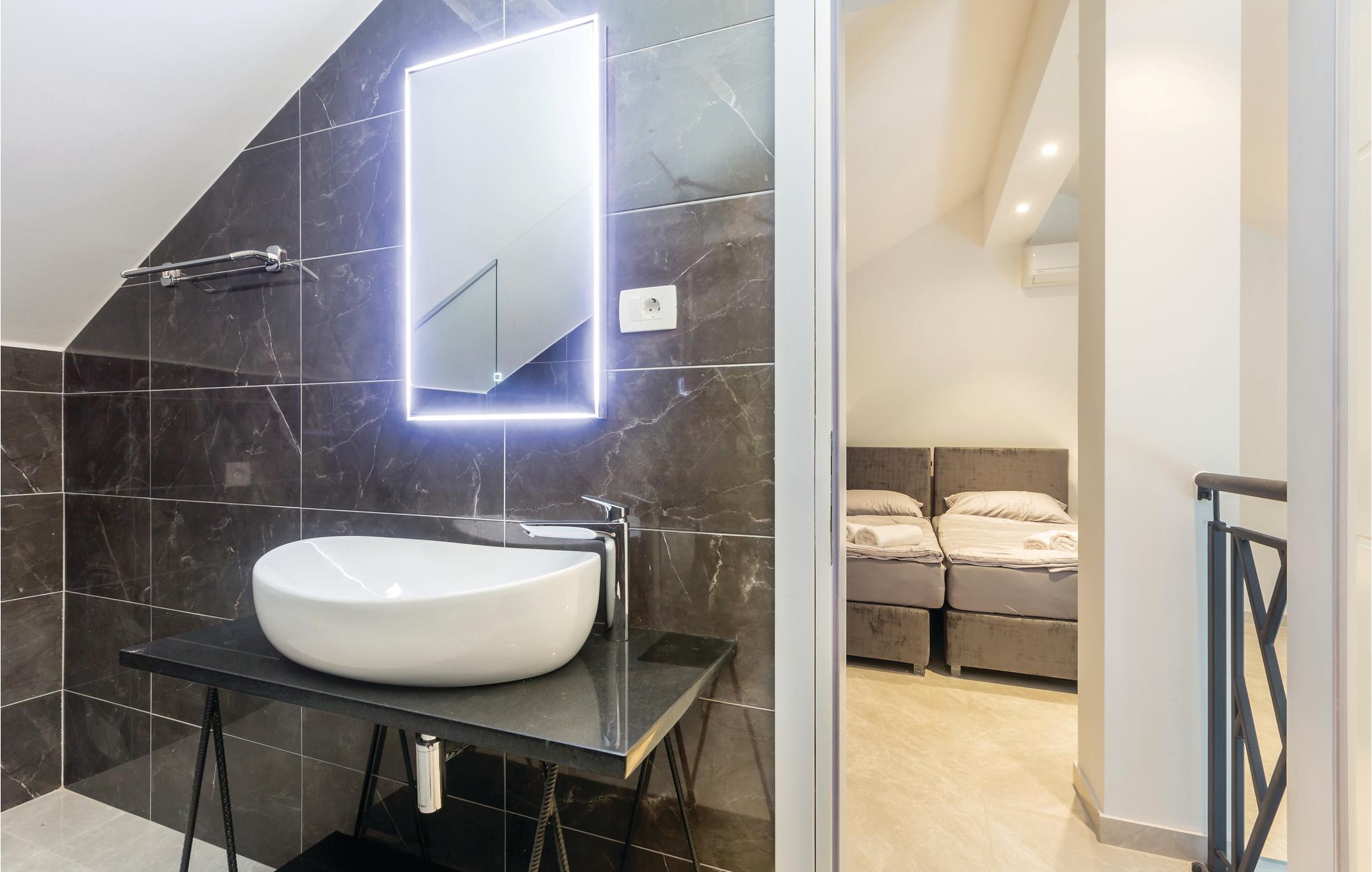 Fra denne pragtfulde ferielejlighed er der en skøn udsigt over bugten og Krks smukke gamle bydel. Lejligheden ligger i en privat ejendom med egen pool og ejendommen ligger højt over den gamle bydel. Her er en skøn udsigt over havet og byen. Her er også et meget veludstyret køkken og en lys og indbydende indretning. På lejlighedens underste etage der ligger på anden sal, er der et soveværelse, et badeværelse, et køkken og en stue med spisestue. En anden trappe fører op til tredje sal med et soveværelse på en stor hems, der er afgrænset med gelænder. Her er skrå vægge med en laveste loftshøjde i siden på ca. 145 cm og her er badeværelse en suite. I haven er der en pool og en solskinsterrasse og vil I svømme i havet, så er der kun få minutters gang til strande og I er i samme afstand af centrum af byen. Ejer har en restaurant og hvor I får særlige priser på både frokost og aftensmad efter forudgående aftale.