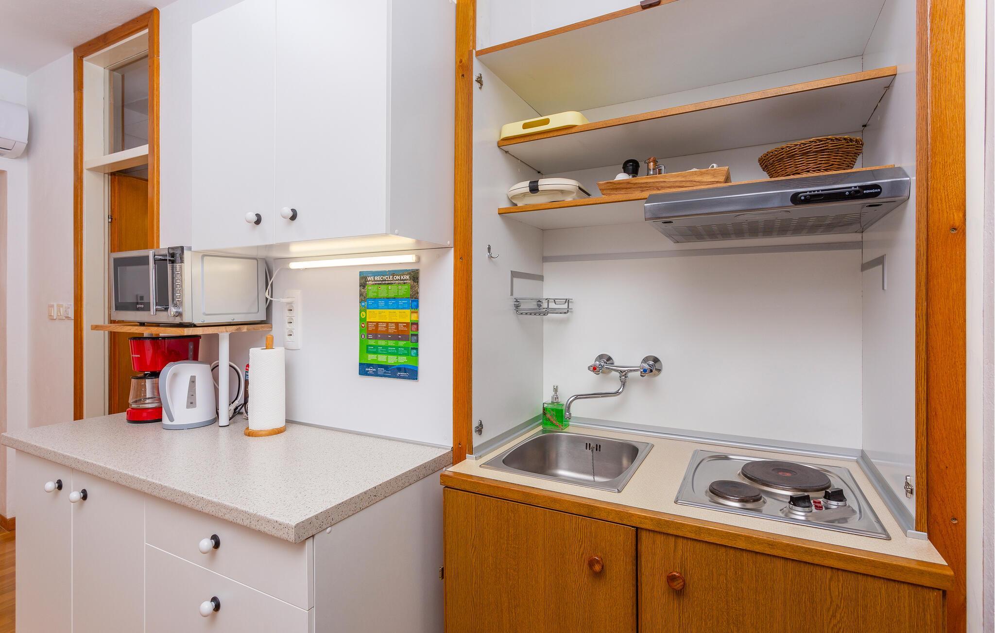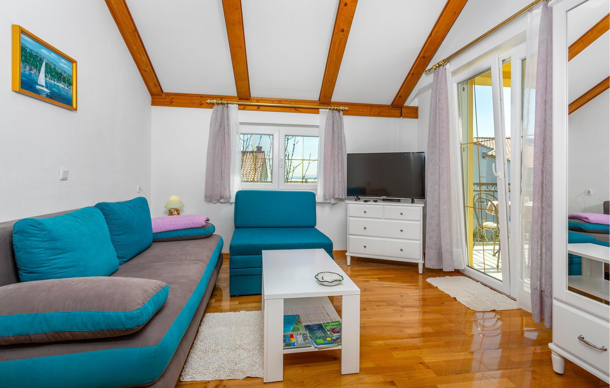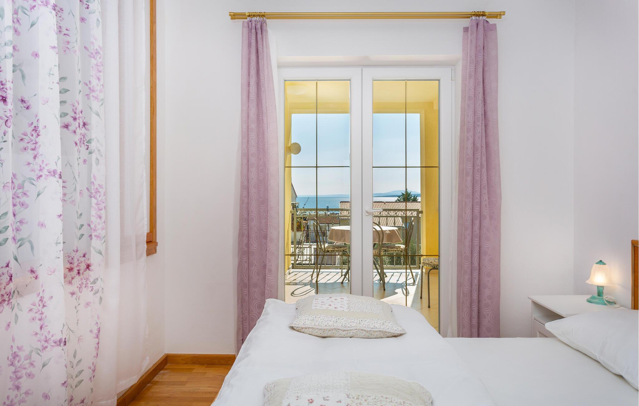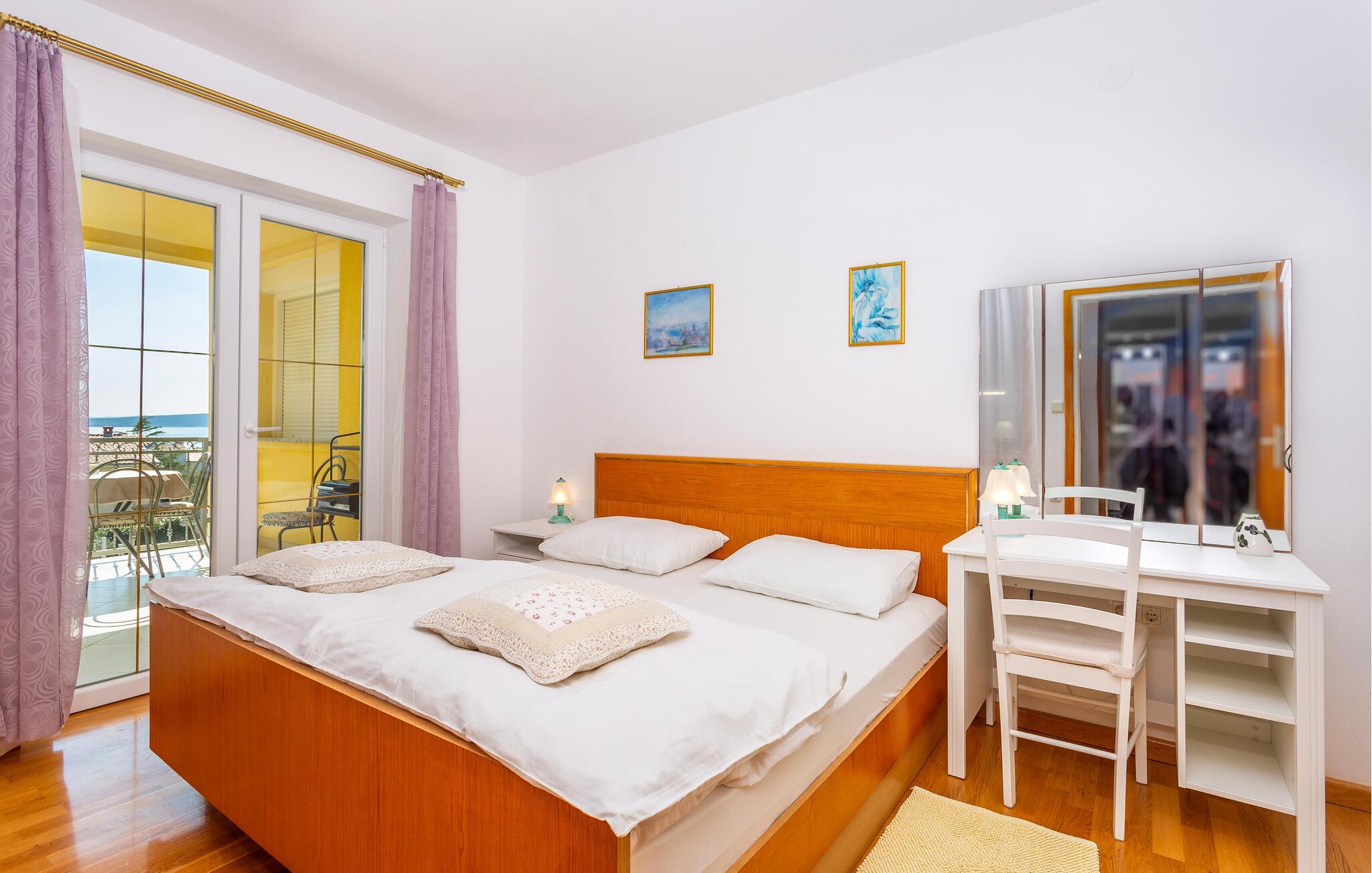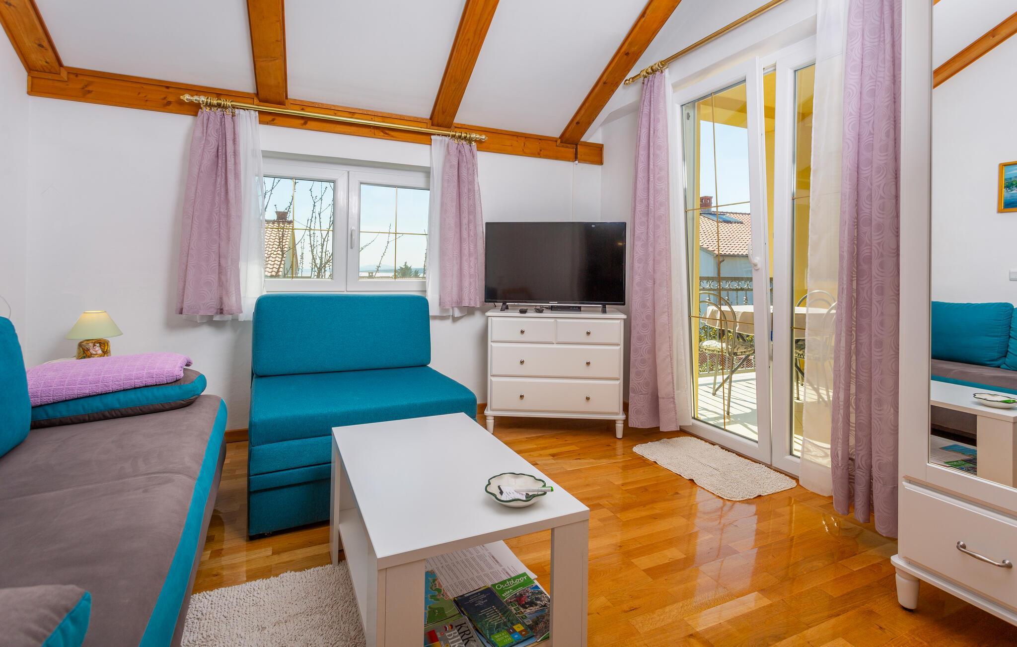 I en af de mest rolige bydele i byen Krk, der er den største by på øen af samme navn der ligger i Kvarnerbugten, ligger disse to (CKI186 og CKI187) behageligt indrettede ferielejligheder på første sal, i en privat ejendom. Til hver lejlighed er der balkon, for I kan slappe af i de lune sommeraftener og lade jeg betage af havudsigten og der er kun 250 meter at gå ned til stranden og havet. Den gamle bydel bugner af restauranter, gallerier, souvenirbutikker og mange former for fritidsunderholdning. Her kan I opleve en rig kulturav og wake-boarde i Punat, køre gokart på banen i Krk, cykle eller vandre øen tyndt og smage gode vine i Vrbniks vinkældre.