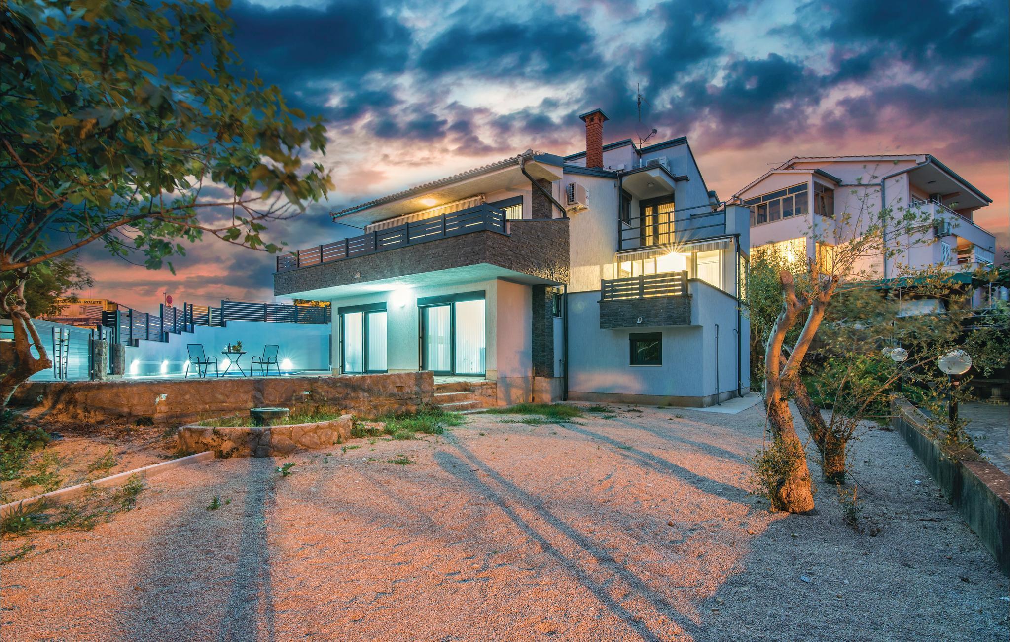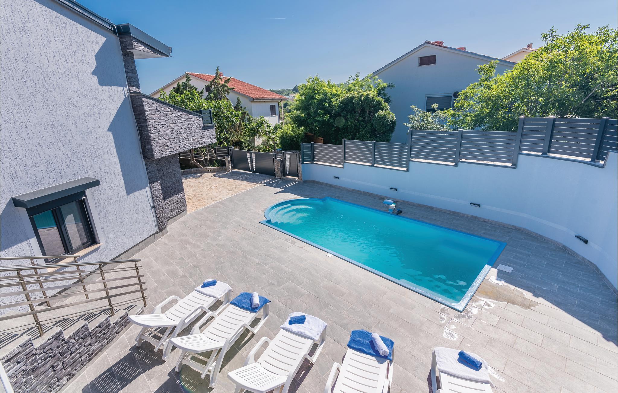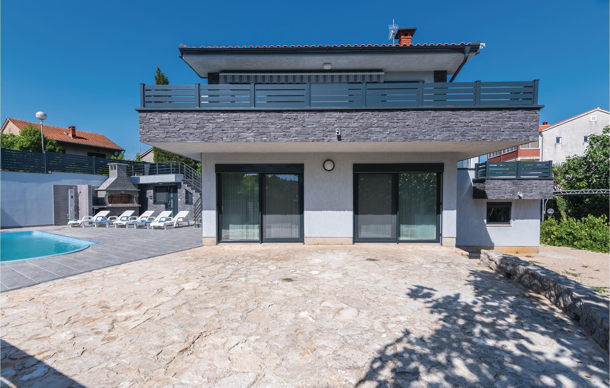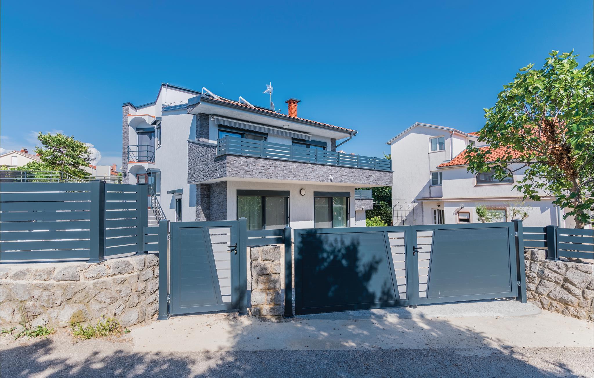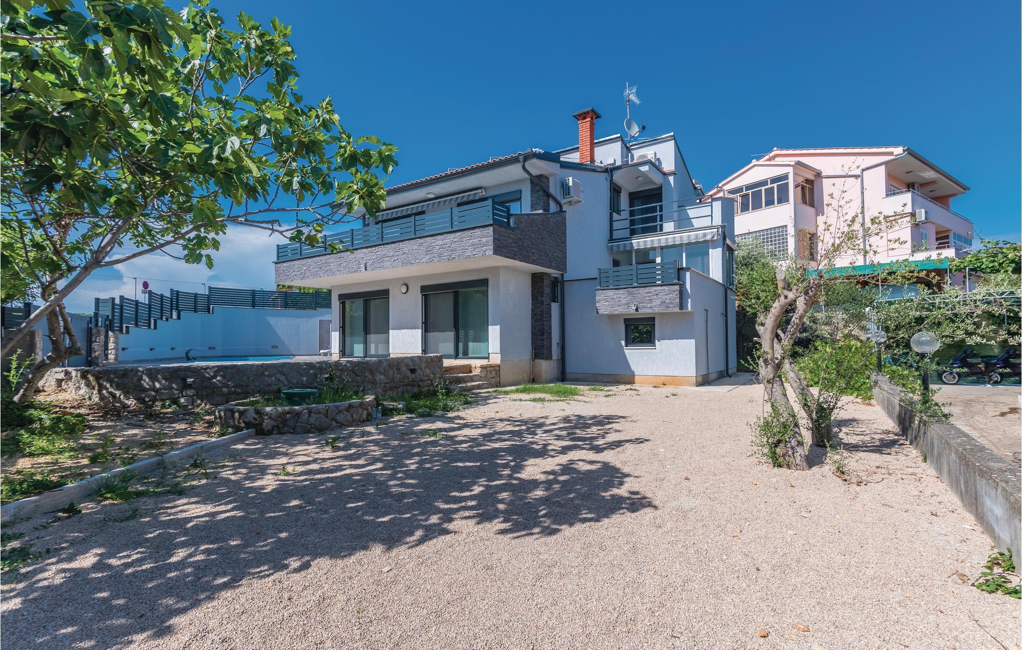 Pragtfuldt feriehus på tre etager, i et roligt boligområde i byen Krk. Rummene fordeler sig med soveværelse i stueplan og på øverste etage, mens den rummelige stue og køkkenet ligger på første sal. I haven kan I glæde jer til en tur i poolen, tage solbad og lave mad i det lille udendørs køkken med stor grill. Dartskive, brusebad og et toilet er med til at gøre udendørslivet endnu bedre. Grunden er indhegnet og ugenert. Byen Krk er øens største med interessant historie, gode restauranter og alle former for butikker.