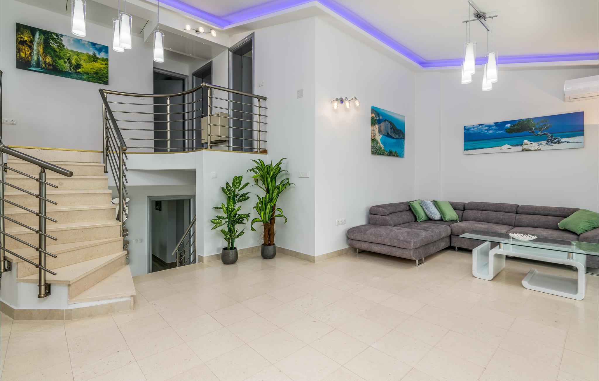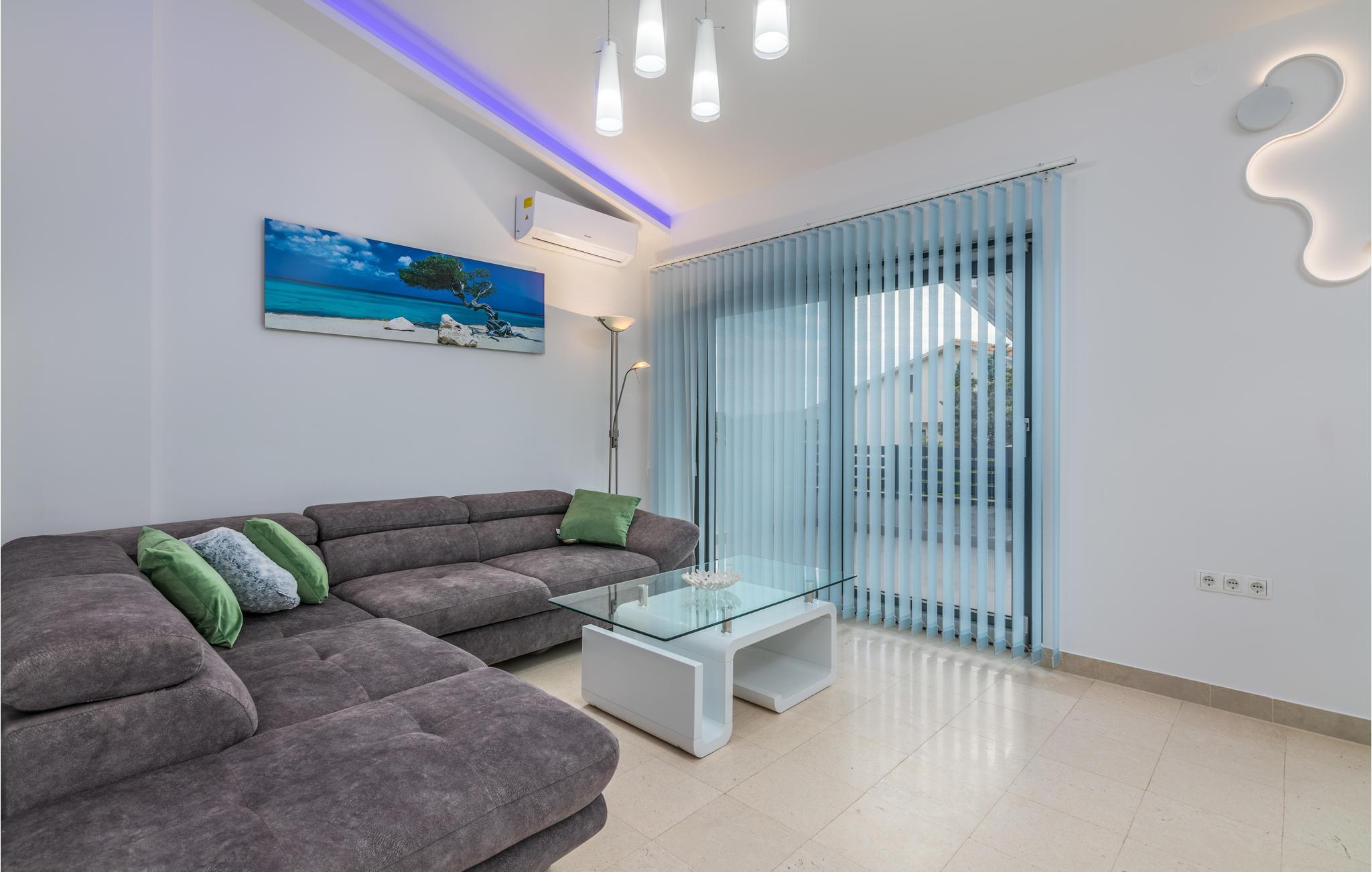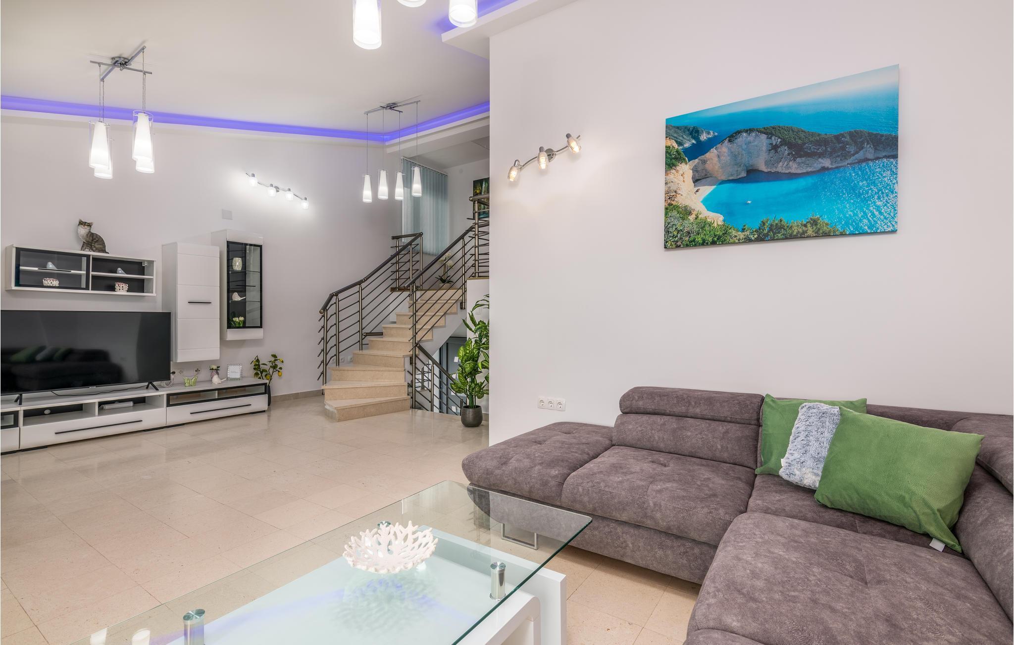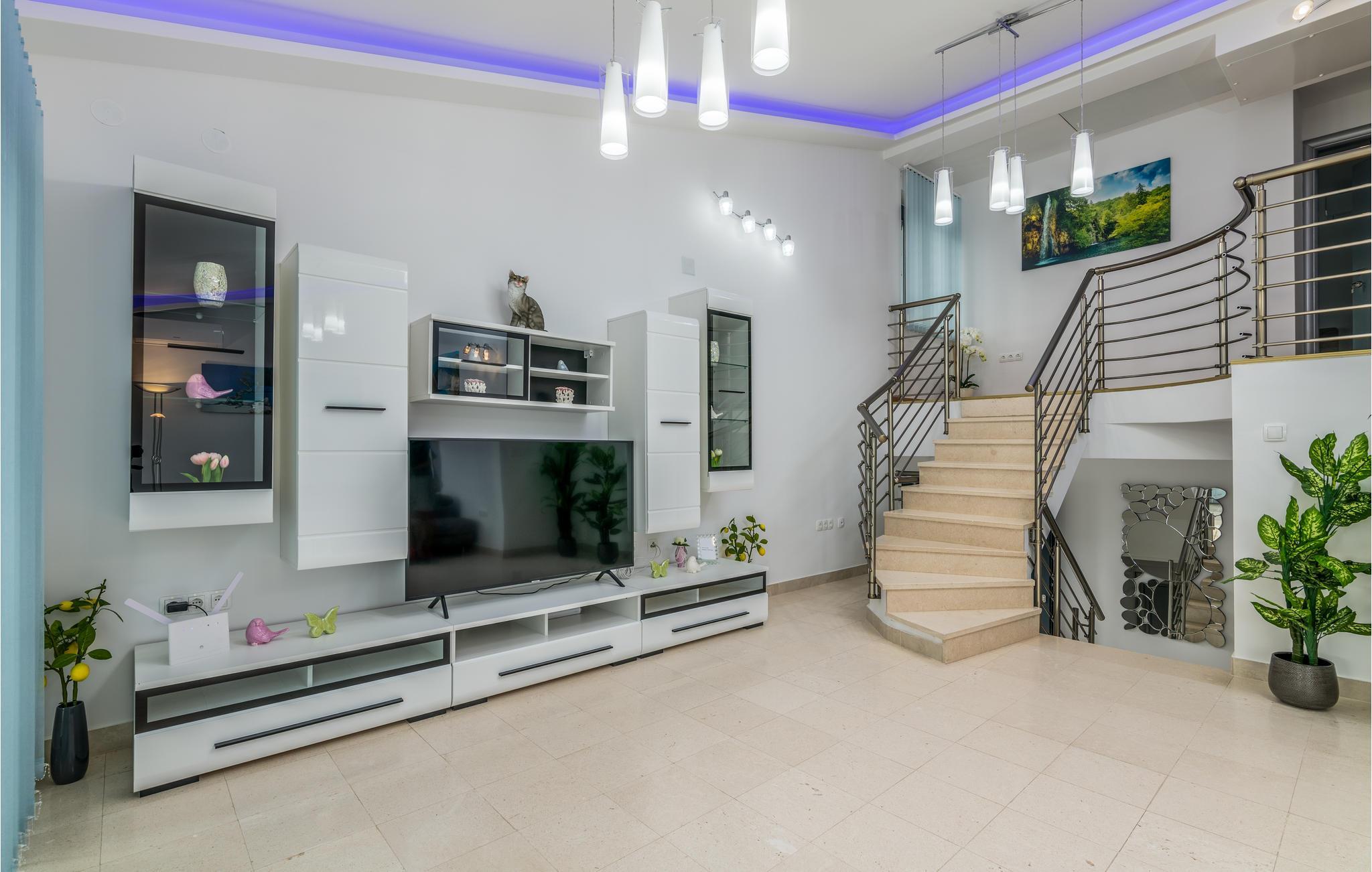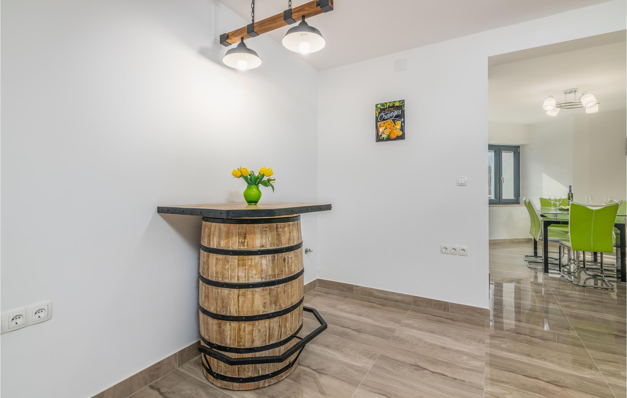 Pragtfuldt feriehus på tre etager, i et roligt boligområde i byen Krk. Rummene fordeler sig med soveværelse i stueplan og på øverste etage, mens den rummelige stue og køkkenet ligger på første sal. I haven kan I glæde jer til en tur i poolen, tage solbad og lave mad i det lille udendørs køkken med stor grill. Dartskive, brusebad og et toilet er med til at gøre udendørslivet endnu bedre. Grunden er indhegnet og ugenert. Byen Krk er øens største med interessant historie, gode restauranter og alle former for butikker.