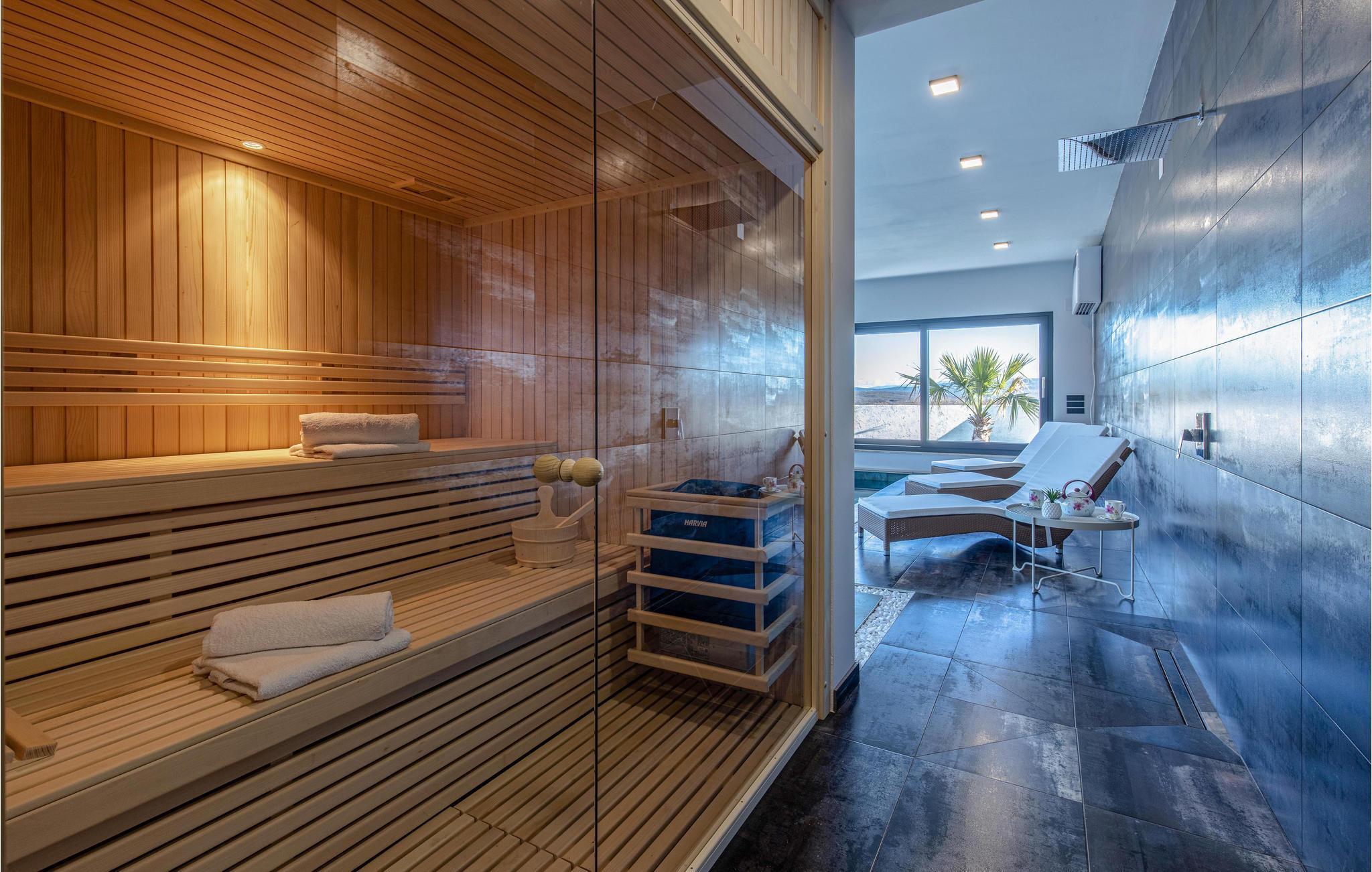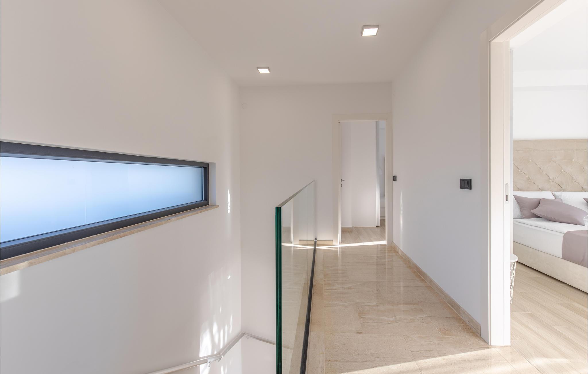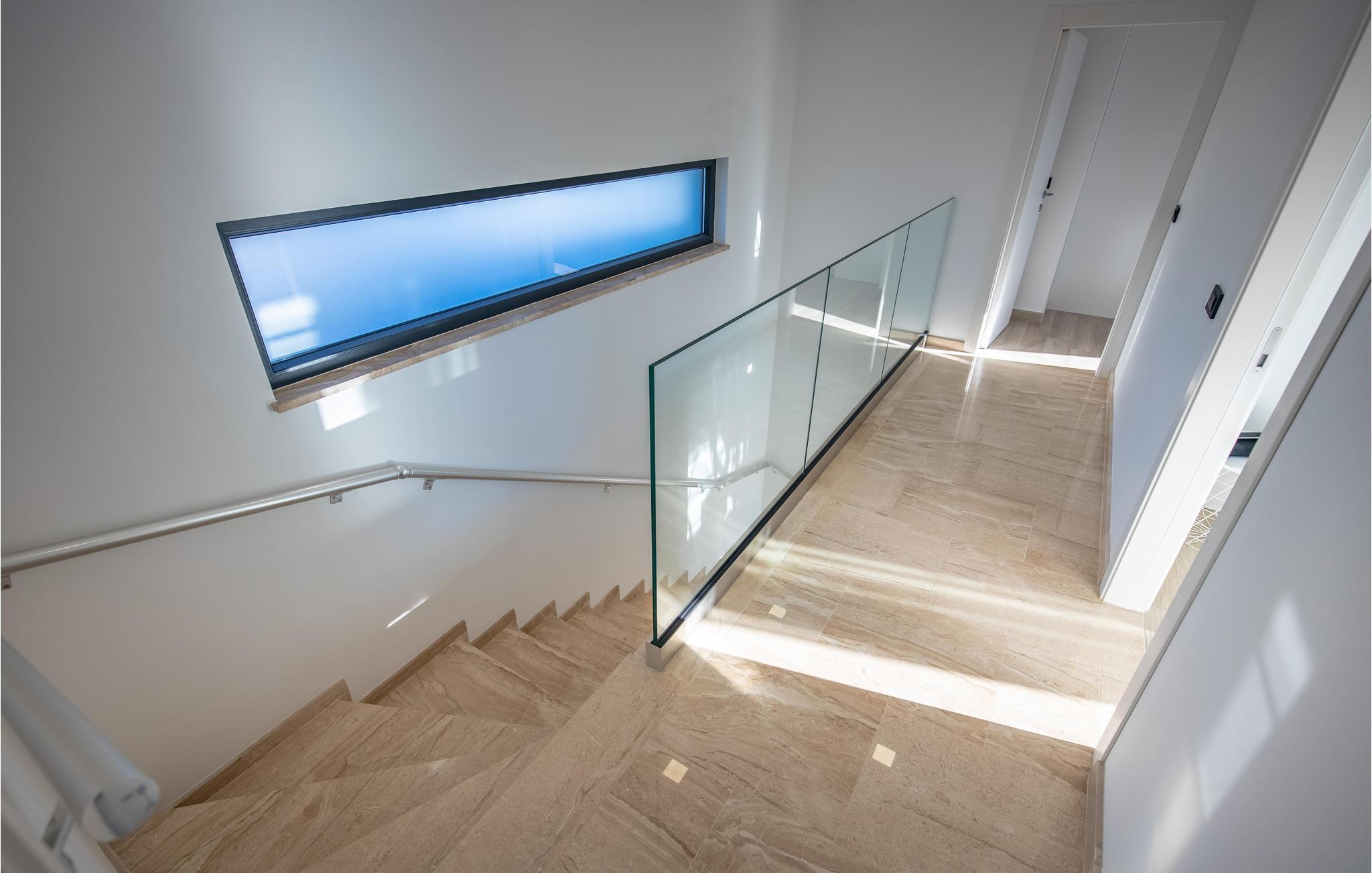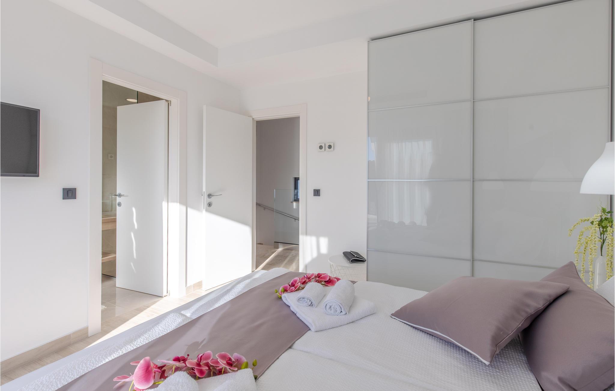 Store vinduespartier fungerer som en fin overgang fra opholds- og køkkenområdet såvel som fra et af soveværelserne til terrassen. I overetagen ligger yderligere tre soveværelser med eget badeværelse. Hvert soveværelse har et Smart-tv, et pengeskab og adgang til balkonen, hvorfra der er en vidunderlig udsigt over havet og landskabet. I stueetagen findes et wellnessområde med en indendørs pool på ca. 22 m² og en sauna. I kælderen ligger en vinkælder og aktiviteter såsom billard og bordfodbold. I huset findes et varme- og kølesystem, der gør ophold til en særlig fornøjelse hele året rundt.