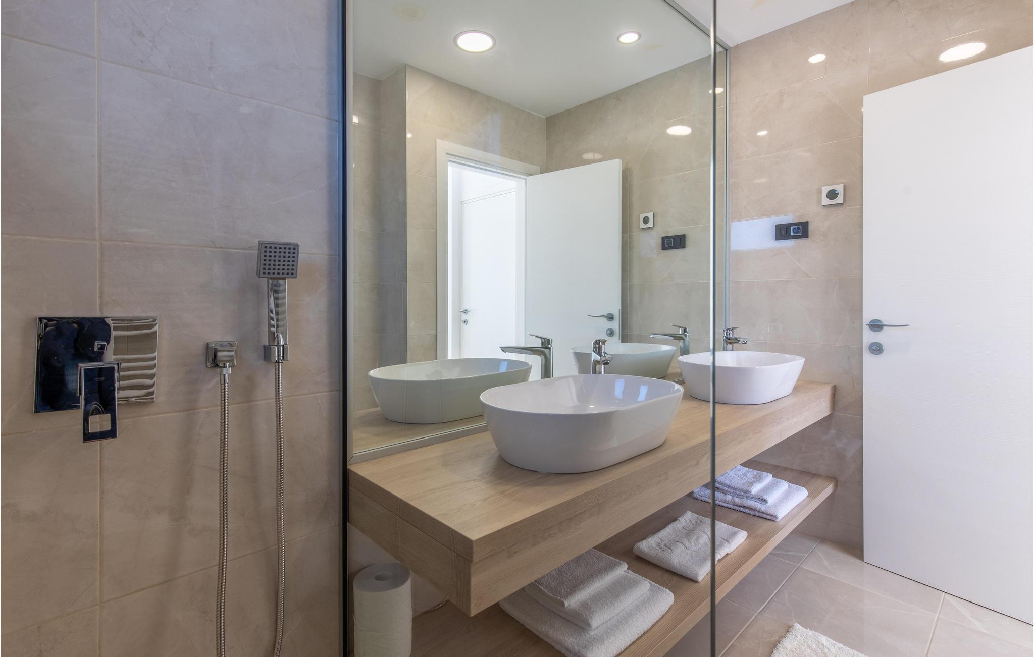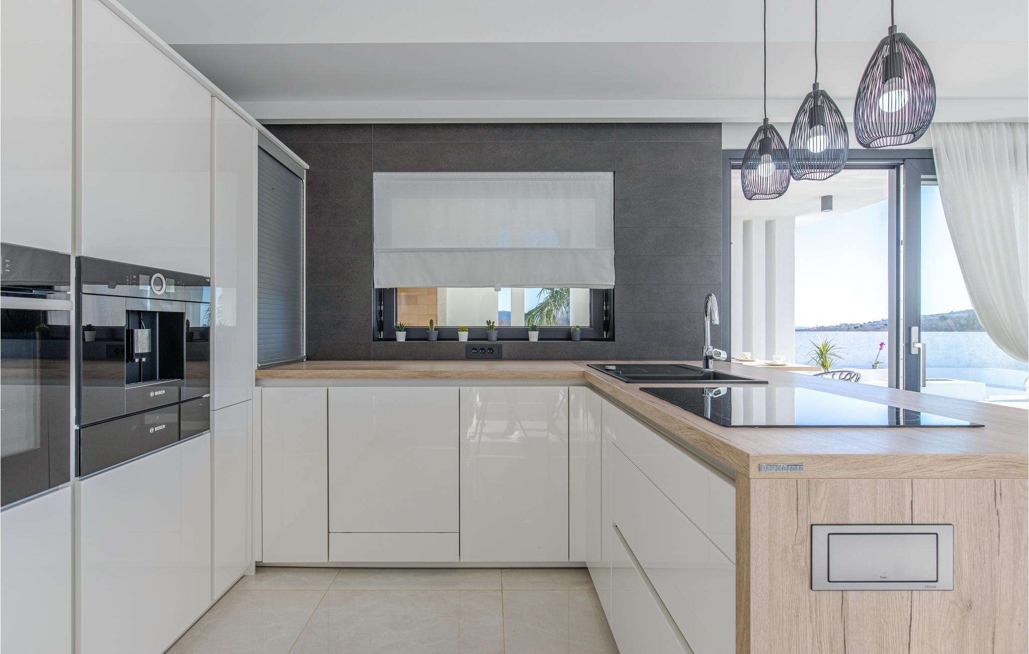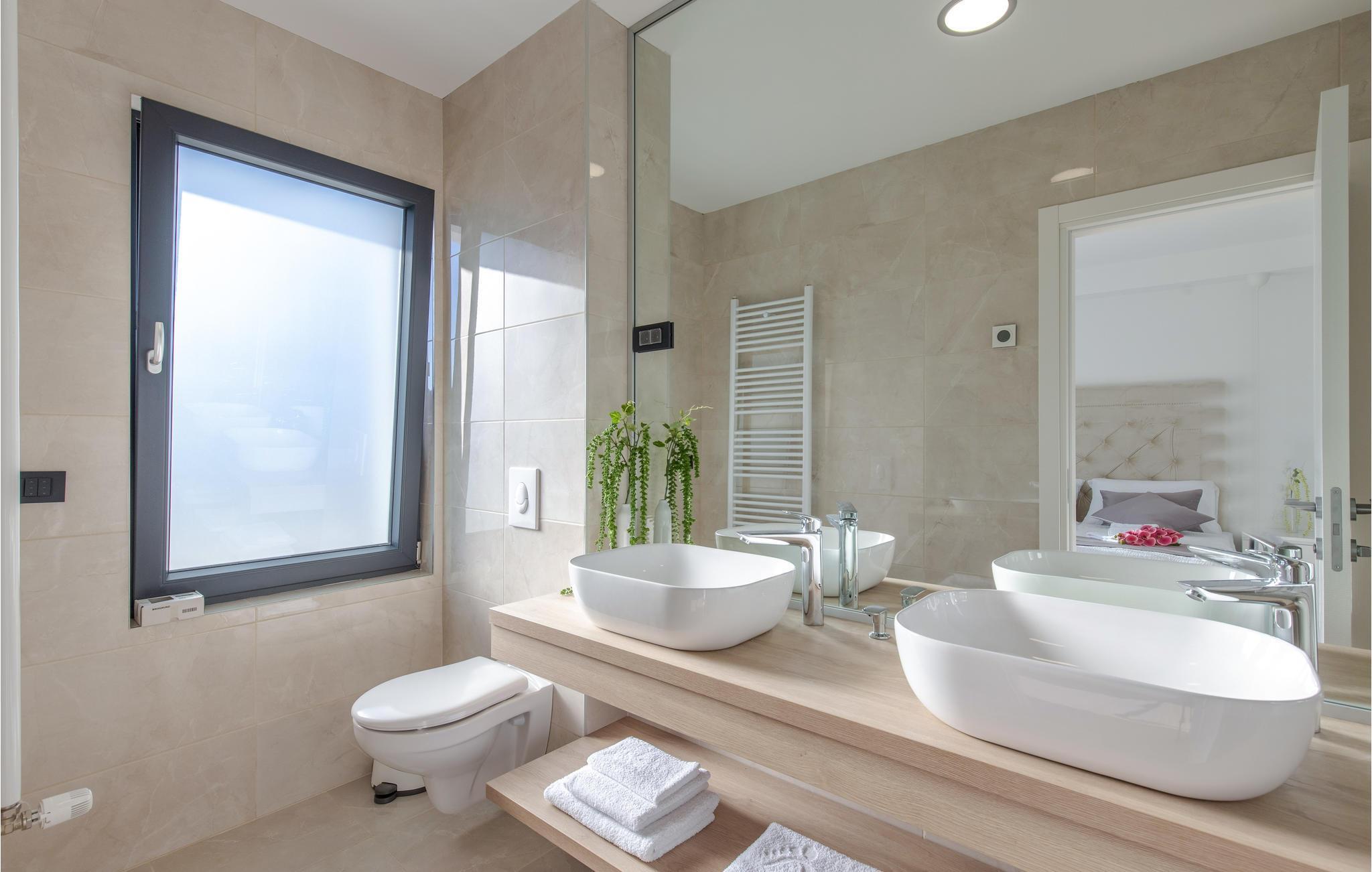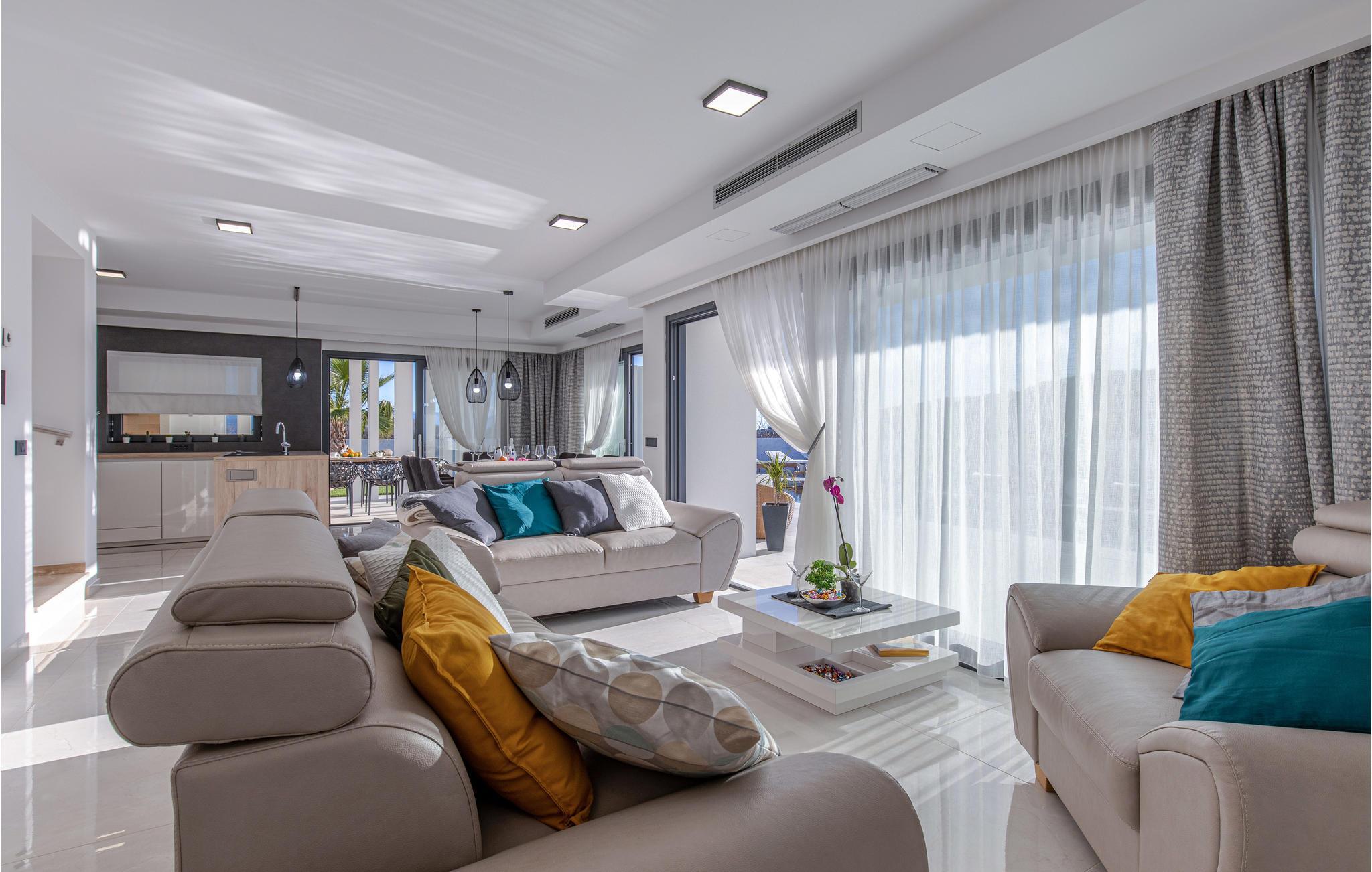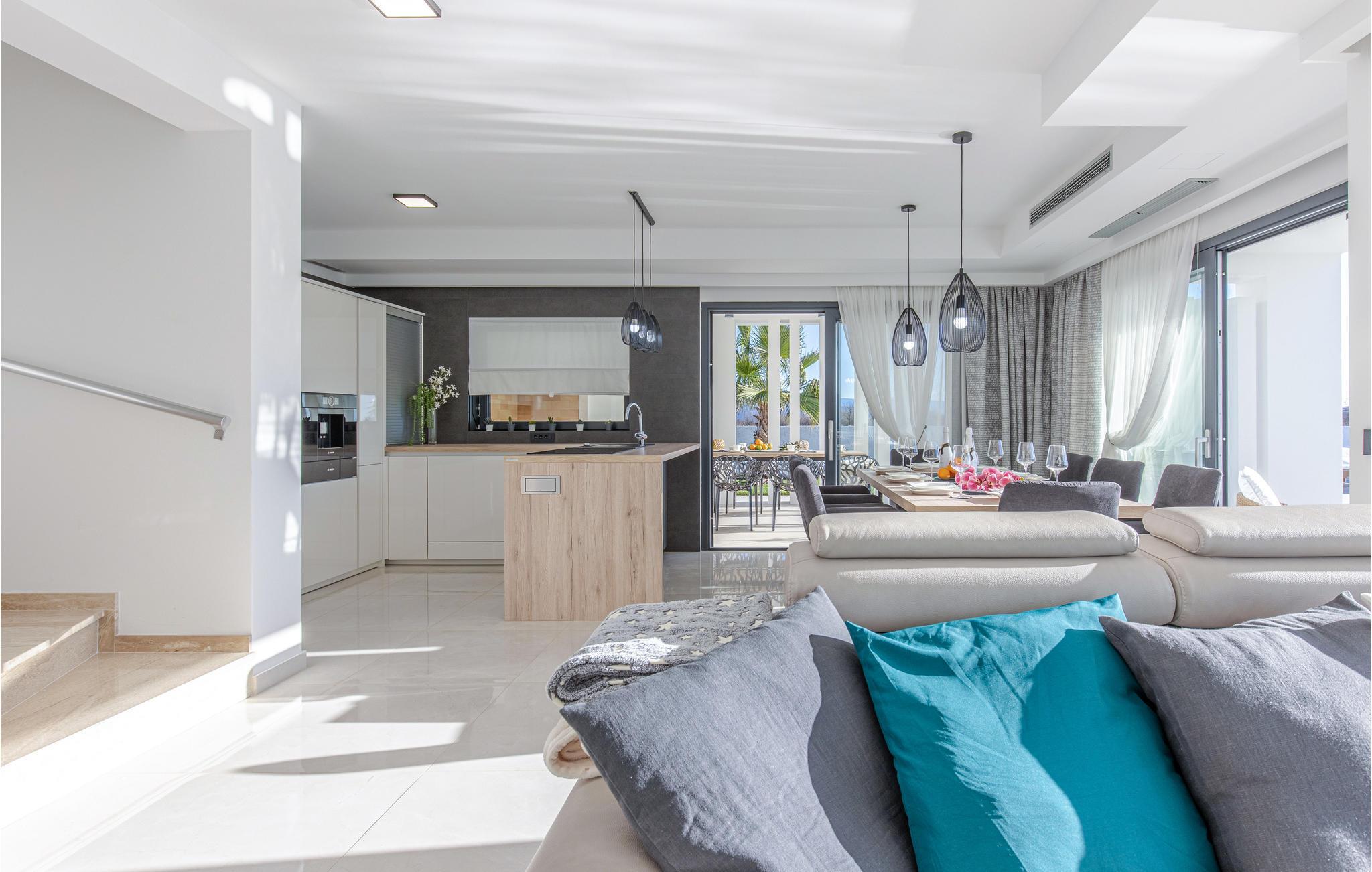 Store vinduespartier fungerer som en fin overgang fra opholds- og køkkenområdet såvel som fra et af soveværelserne til terrassen. I overetagen ligger yderligere tre soveværelser med eget badeværelse. Hvert soveværelse har et Smart-tv, et pengeskab og adgang til balkonen, hvorfra der er en vidunderlig udsigt over havet og landskabet. I stueetagen findes et wellnessområde med en indendørs pool på ca. 22 m² og en sauna. I kælderen ligger en vinkælder og aktiviteter såsom billard og bordfodbold. I huset findes et varme- og kølesystem, der gør ophold til en særlig fornøjelse hele året rundt.