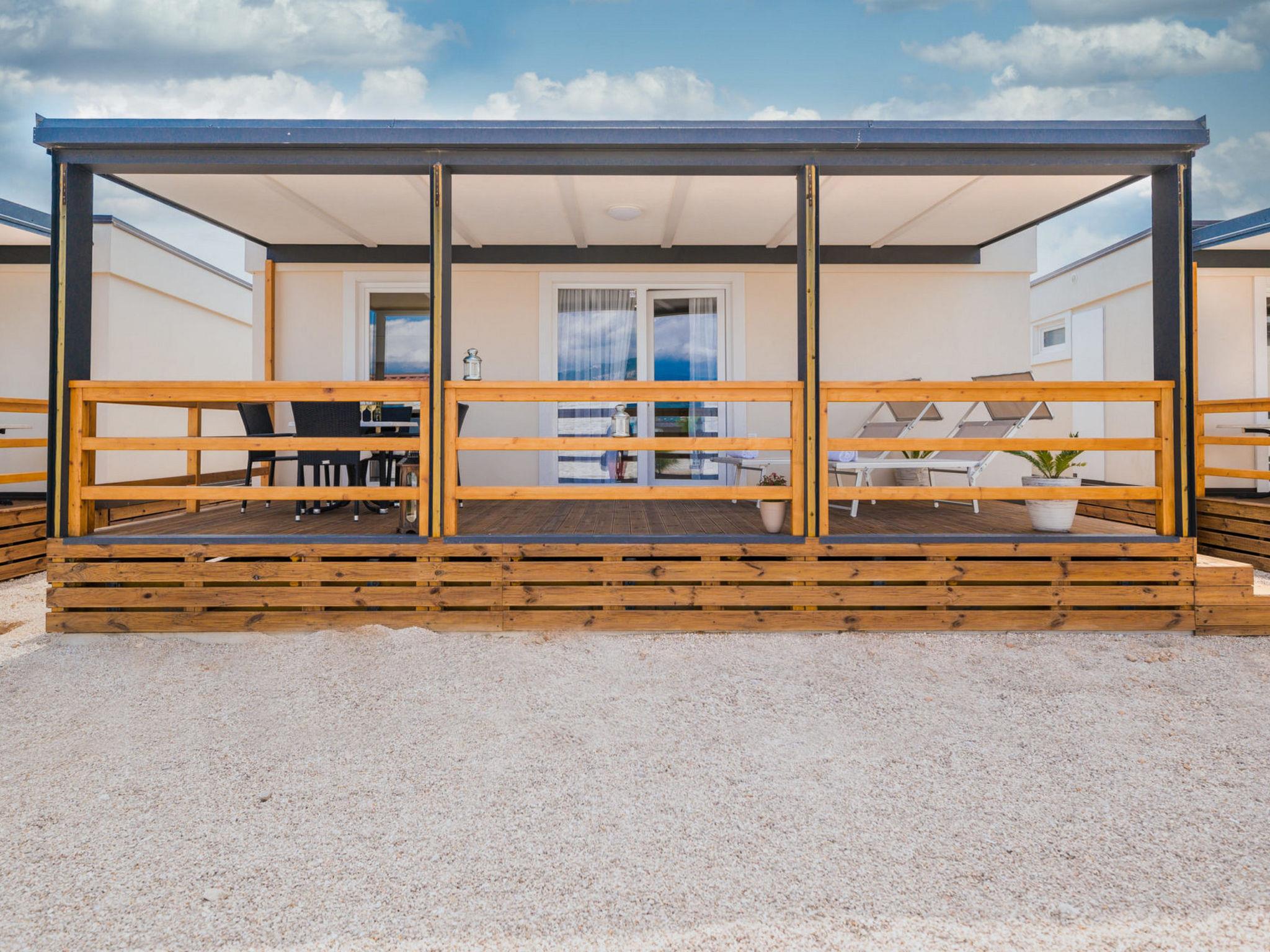 "Premium Family", 3-room mobile home 39 m2. Living/dining room with 1 sofabed (80 cm, length 200 cm), satellite TV and air conditioning. Exit to the terrace. 1 room with 1 french bed (150 cm, length 200 cm). 1 room with 2 beds (80 cm, length 200 cm). Open kitchen (dishwasher, 2 ceramic glass hob hotplates, toaster, kettle, microwave, freezer, electric coffee machine). 2 showers/WC. No heating option. Terrace 21 m2, roofed. Terrace furniture, deck chairs. Maximum 1 pet/ dog allowed. The property is one of a type of property or apartment. The mobile homes are situated 50 - 90 m from the sea and the beach. Parking for 1 car, 80 m from the mobile home (incl.), parking for 2nd car to be paid extra.