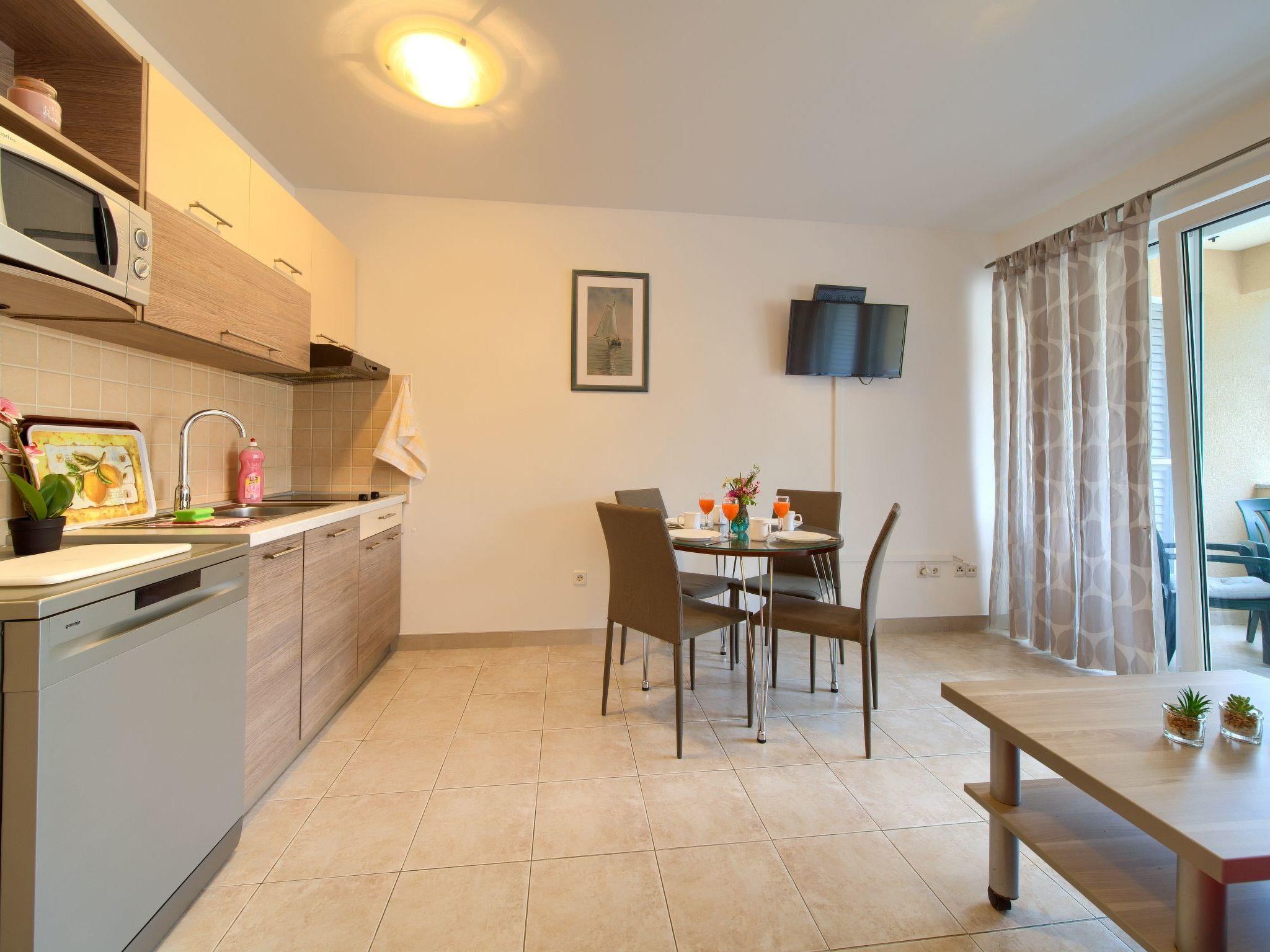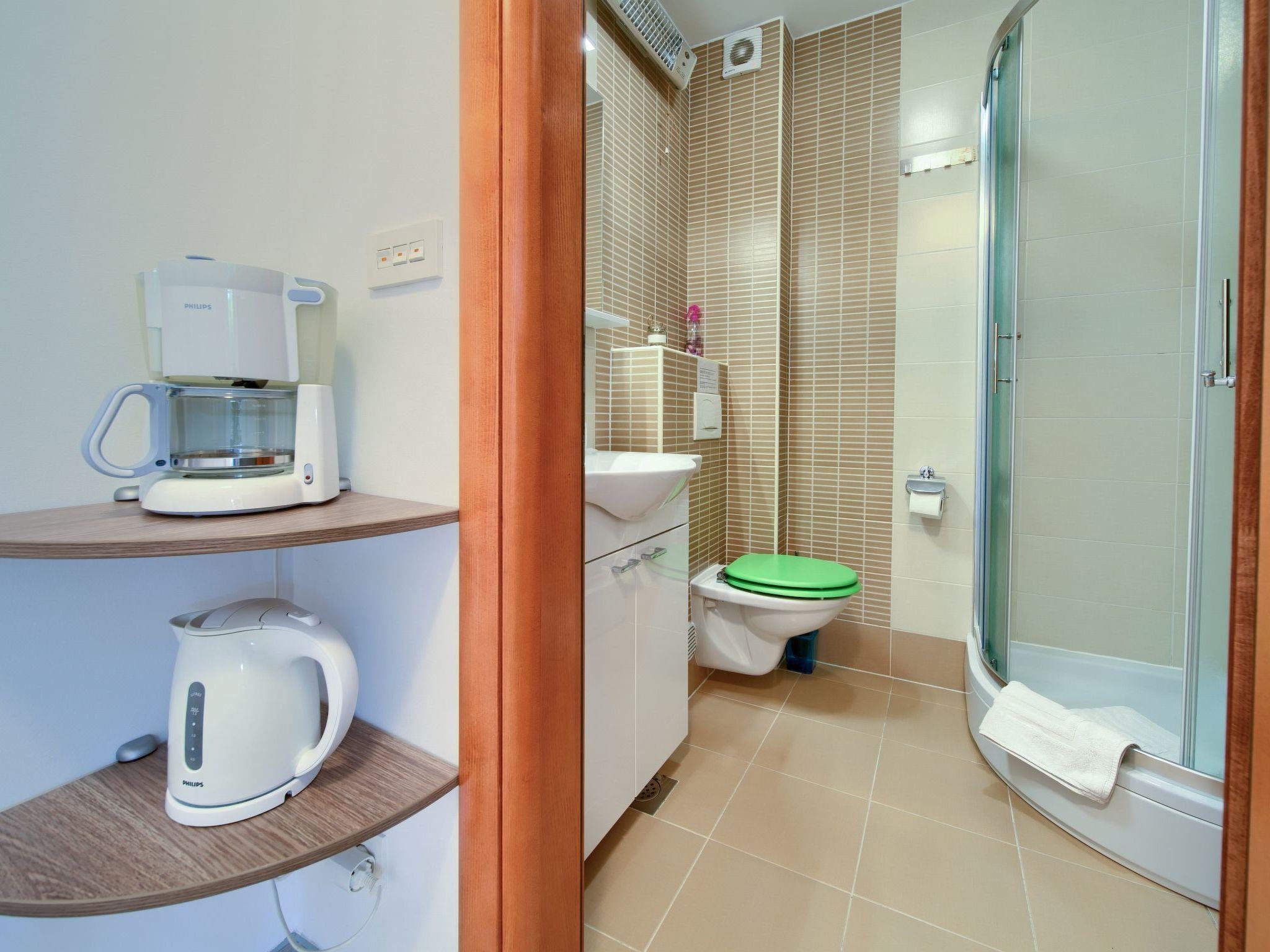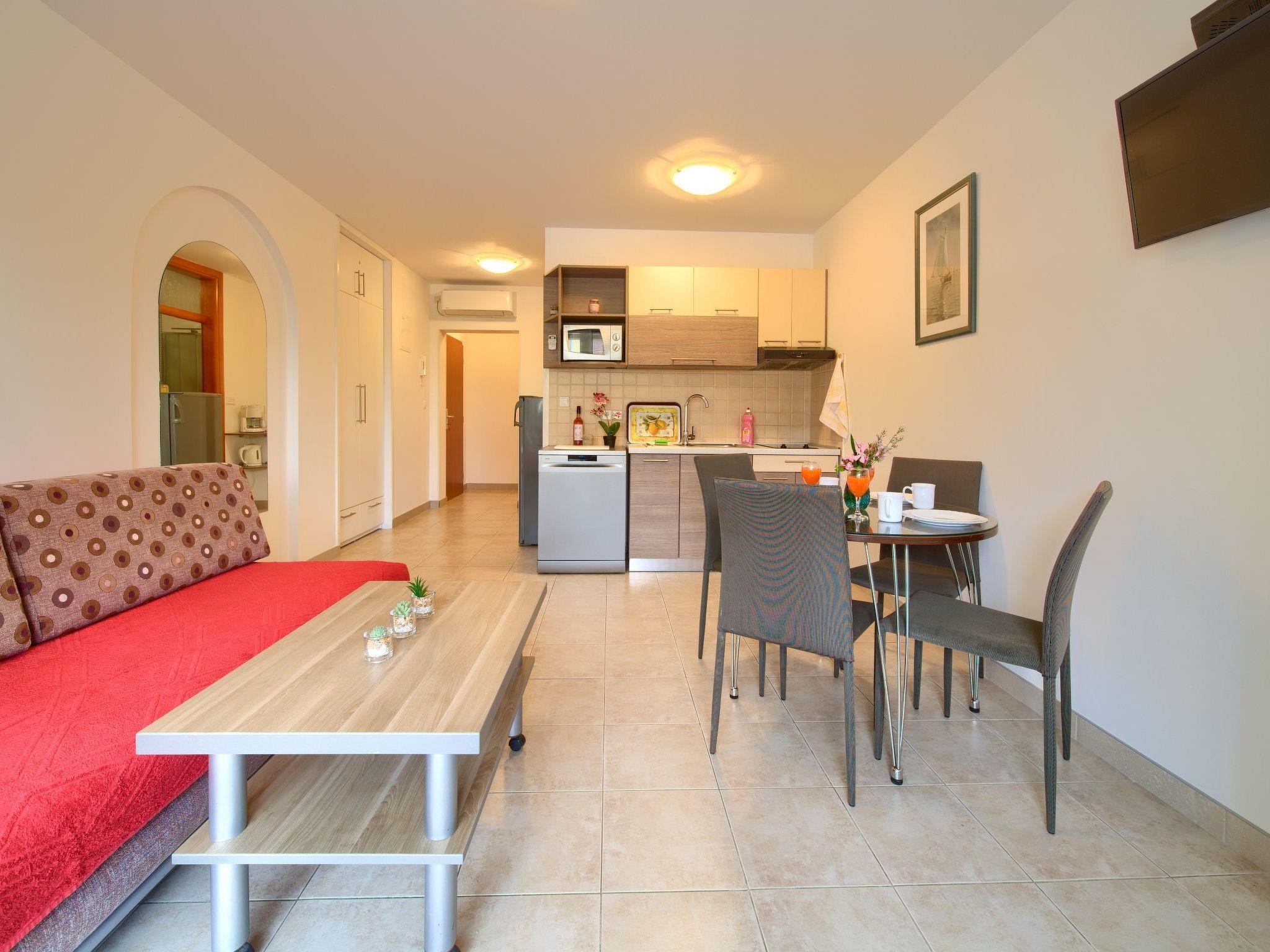 The apartment has a separate bedroom, bathroom with shower and dining room with a well-equipped kitchen which includes: a table for four persons, a fridge, a microwave, a coffee maker, a stove and an oven.