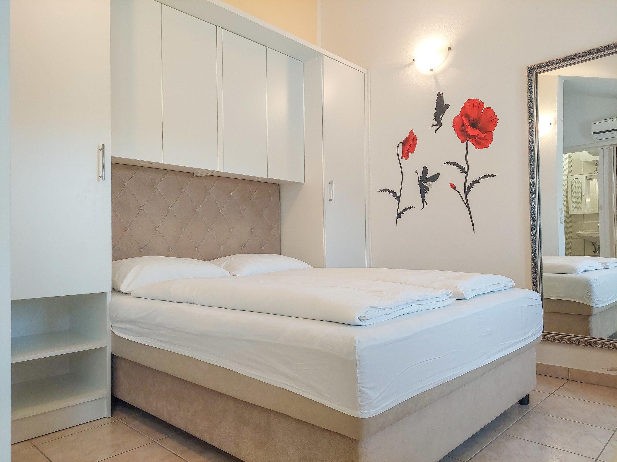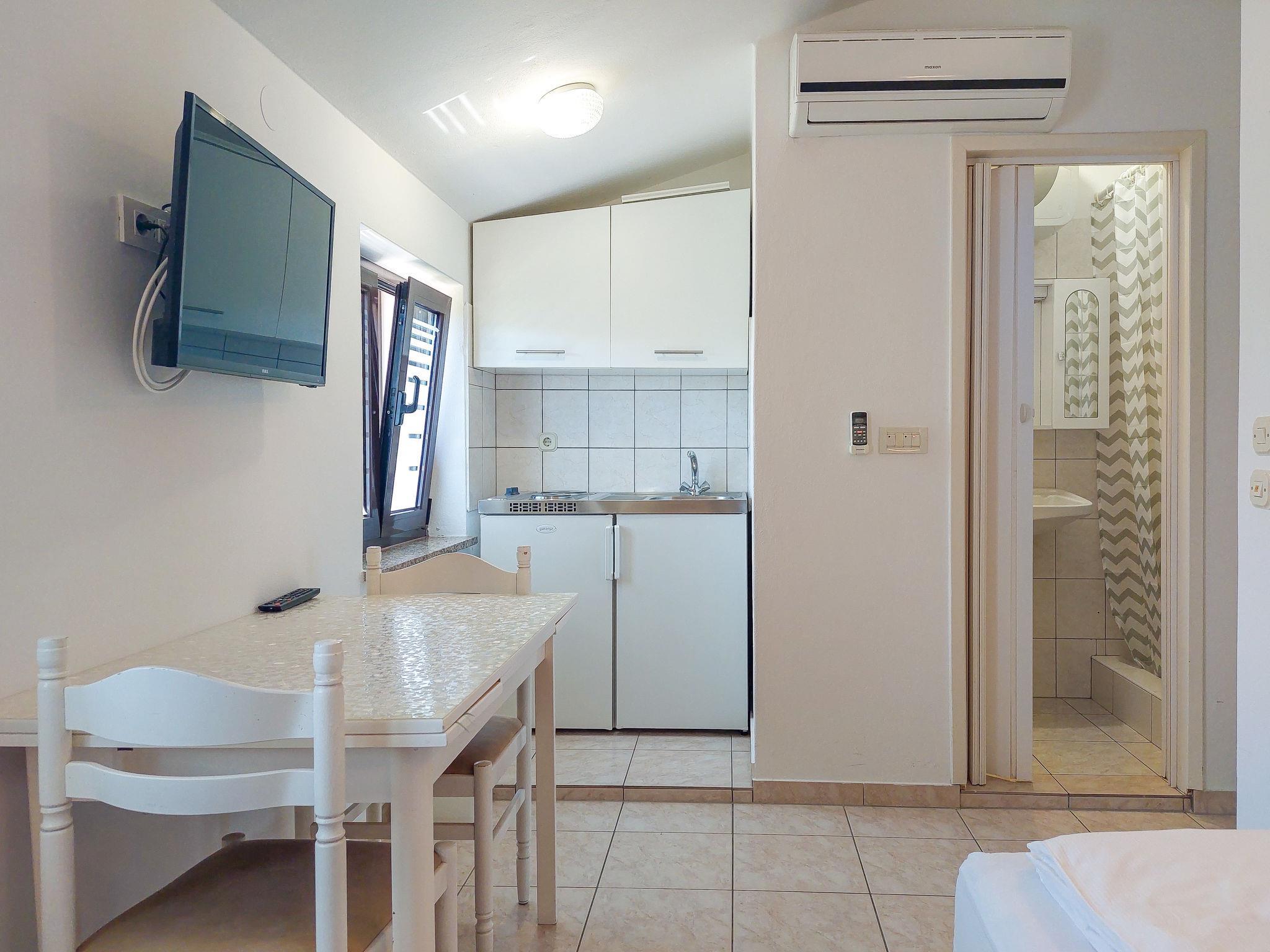 "Marija", 1-room apartment 16 m2 on 2nd floor. Studio with 1 french bed (160 cm, length 200 cm), dining table, satellite TV and air conditioning. Open kitchen (2 hot plates, toaster, kettle, electric coffee machine). Shower/WC. Forced-air heating. Panoramic view of the countryside. Facilities: Internet (WiFi, free). Please note: non-smoking house. Maximum 1 pet/ dog allowed.
