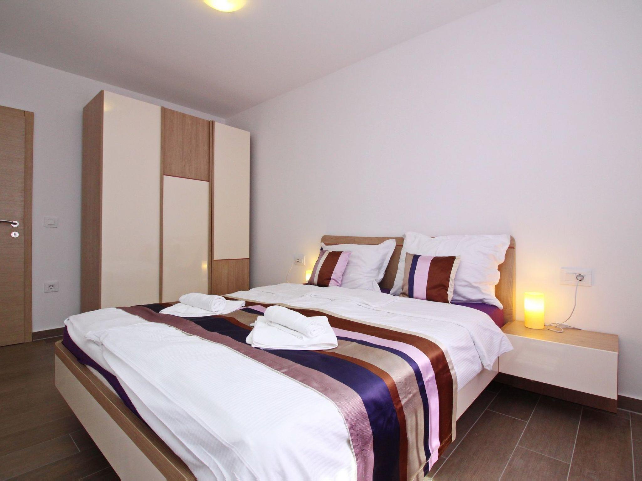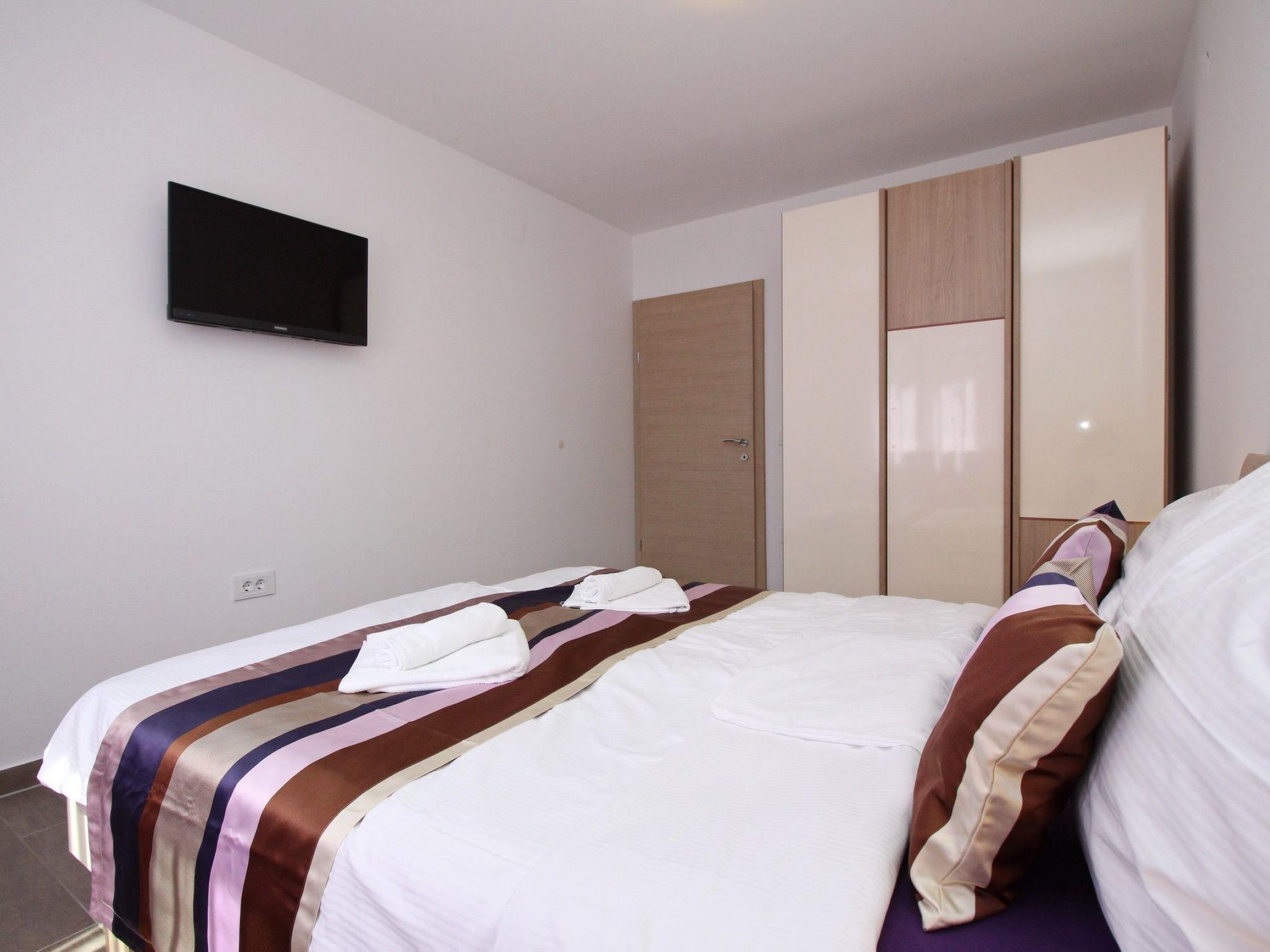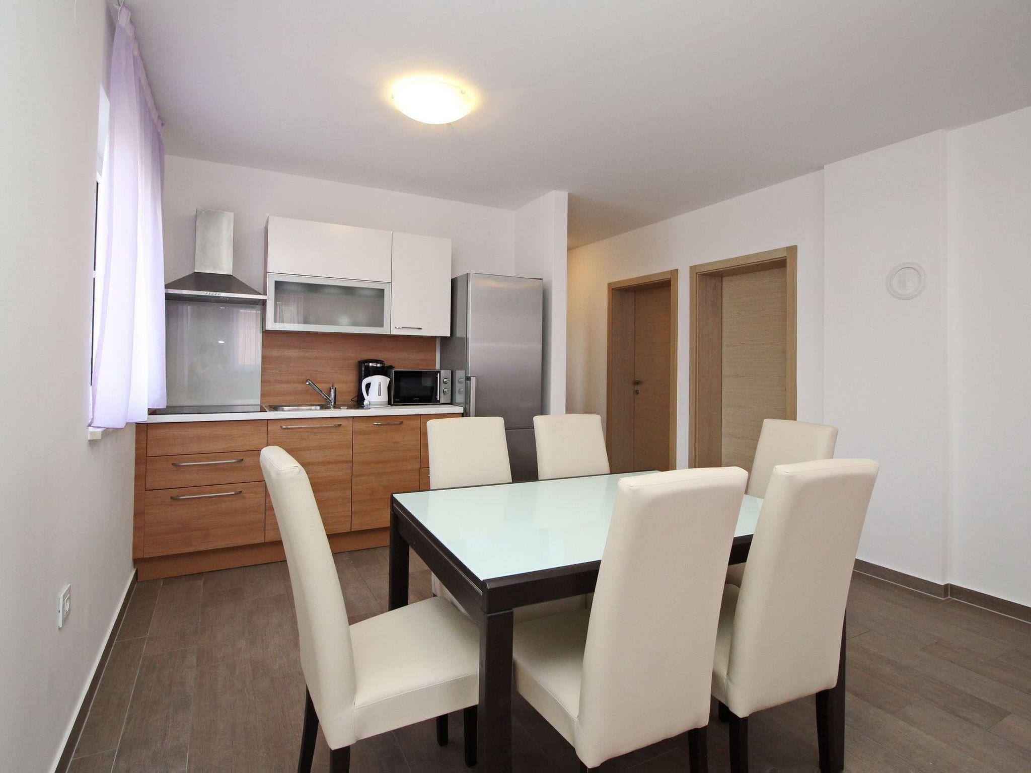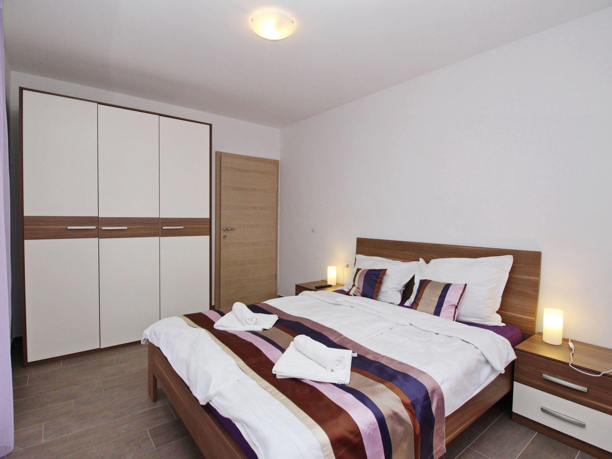 No. of persons: 4-6 Places: 65 m2 (1st floor) Terrace: private balcony, partly covered, tables and chairs for balcony are available. Info: satellite TV, bed linen is provided once a week, towels available (1 large, 1 small / per person and week), use of air conditioning is included in the price of the accommodation, free Wi-Fi, pets are allowed. Flat facilities: Bedroom no.1 : double room , double bed , exit to balcony, tiled, LCDtv Bedroom no.2 : double room , double bed , tiled, LCDtv Living area : living room, dining room and kitchen are one unit ; one additional sleeping possibility on a sofa bed ; exit to the balcony; tiled Kitchen : kitchenette, dishes, cooking pots, cutlery etc. are available, dish towels available, electric cooker, number of hotplates: 4, refrigerator with freezer compartment, coffee machine, dishwasher Bathroom : bathroom with toilet, with shower Each flat has its own parking space.