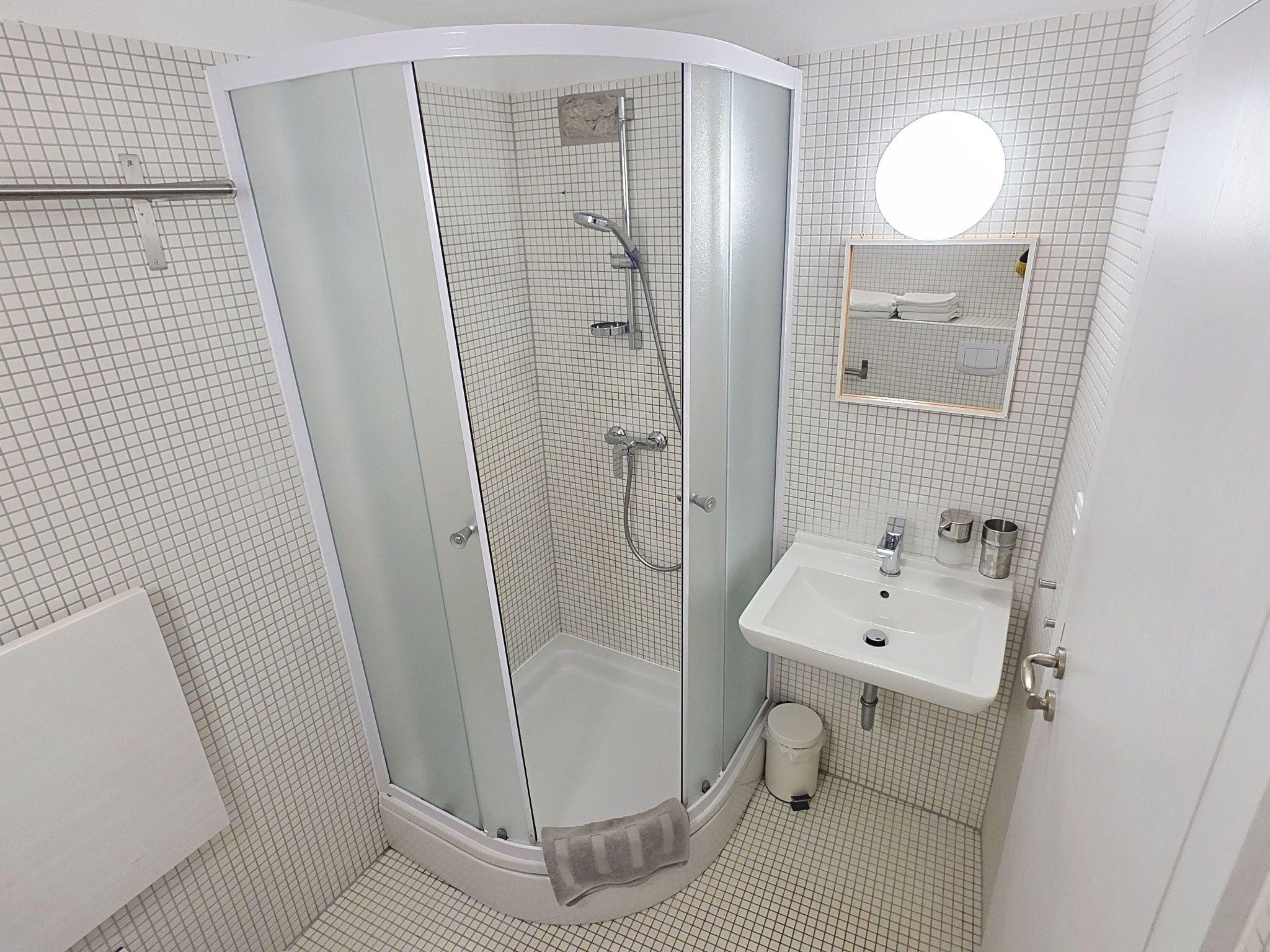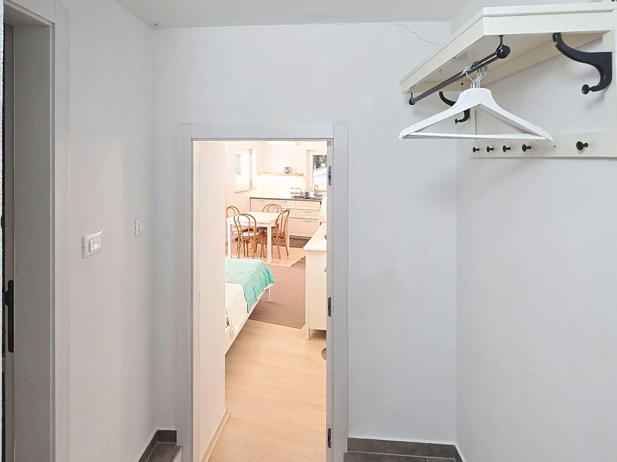 The studio flat is efficiently designed over 30 m² on the ground floor, with the sleeping, living and cooking areas harmoniously integrated into one room. The furnishings include a comfortable sofa bed that promises a good night's sleep. The amenities also include partial air conditioning, which ensures pleasant temperatures within the flat. Bed linen and towels are provided once a week to make your stay as comfortable as possible.