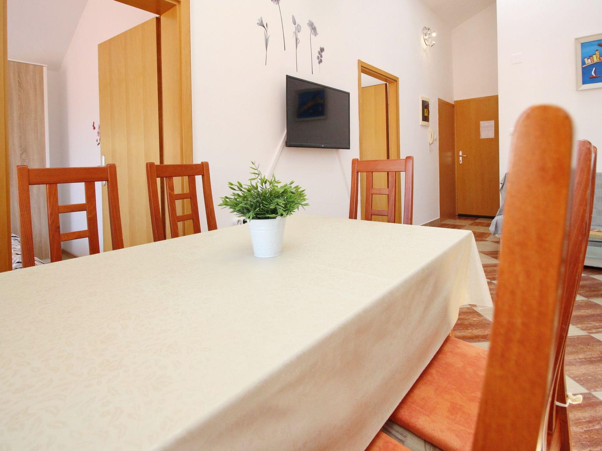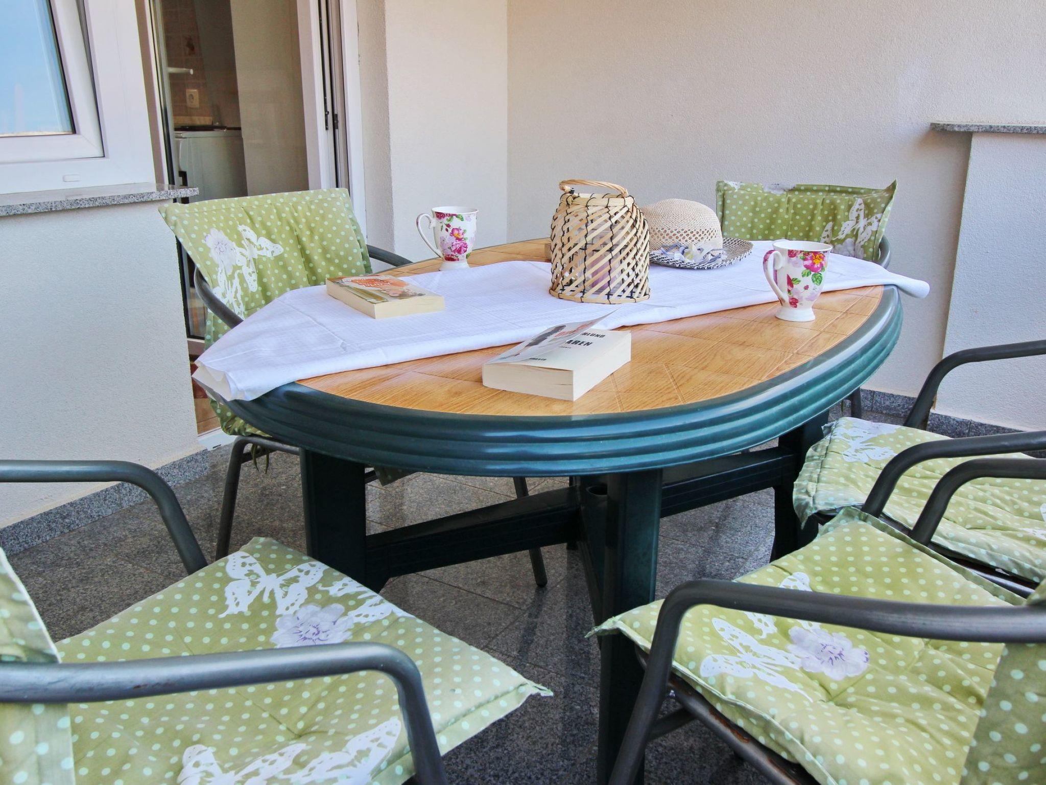 No. of persons: 4 Places: 45 m2 (2nd floor) Balcony : a private balcony (approx. 7 square metres), covered, overlooking the sea, tables and chairs for the balcony are available. Free Wi-Fi, pets are not allowed. Flat facilities: Bedroom no.1 : double bed , laminate Bedroom no.2 : double bed , laminate Living area : living room, dining room and kitchen are one unit ; with balcony ; tiled Kitchen : kitchenette, dishes, cooking pots, cutlery etc. are available, dish towels available, electric cooker, number of hotplates: 4, oven, fridge without freezer compartment, coffee machine