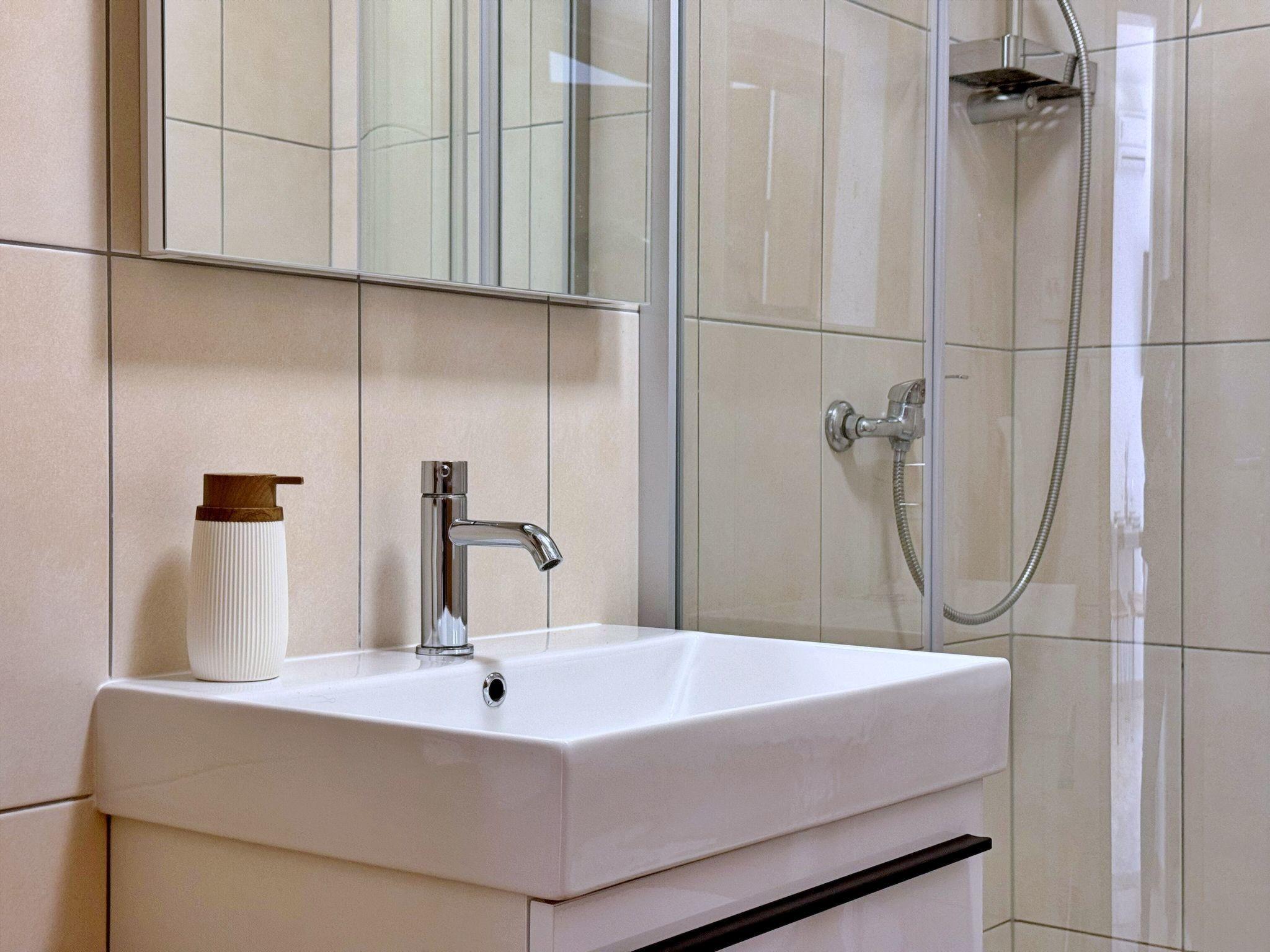 This ground floor flat offers a 20 m2 private terrace with garden views. The air-conditioned kitchen with living area is equipped with a ceramic hob, a fridge with freezer compartment, a Nespresso coffee machine, a kettle, a microwave, a toaster, a dining table, an extendable sofa bed for two people, cable/satellite TV and WiFi. You can access the terrace directly from the living area. The bedroom has a double bed and the bathroom is equipped with a shower, toilet and hairdryer. There is a shared barbecue area and terrace in the courtyard, and a private car park is available free of charge in front of the building. Pets are welcome for an additional fee, and a baby cot is available on request.