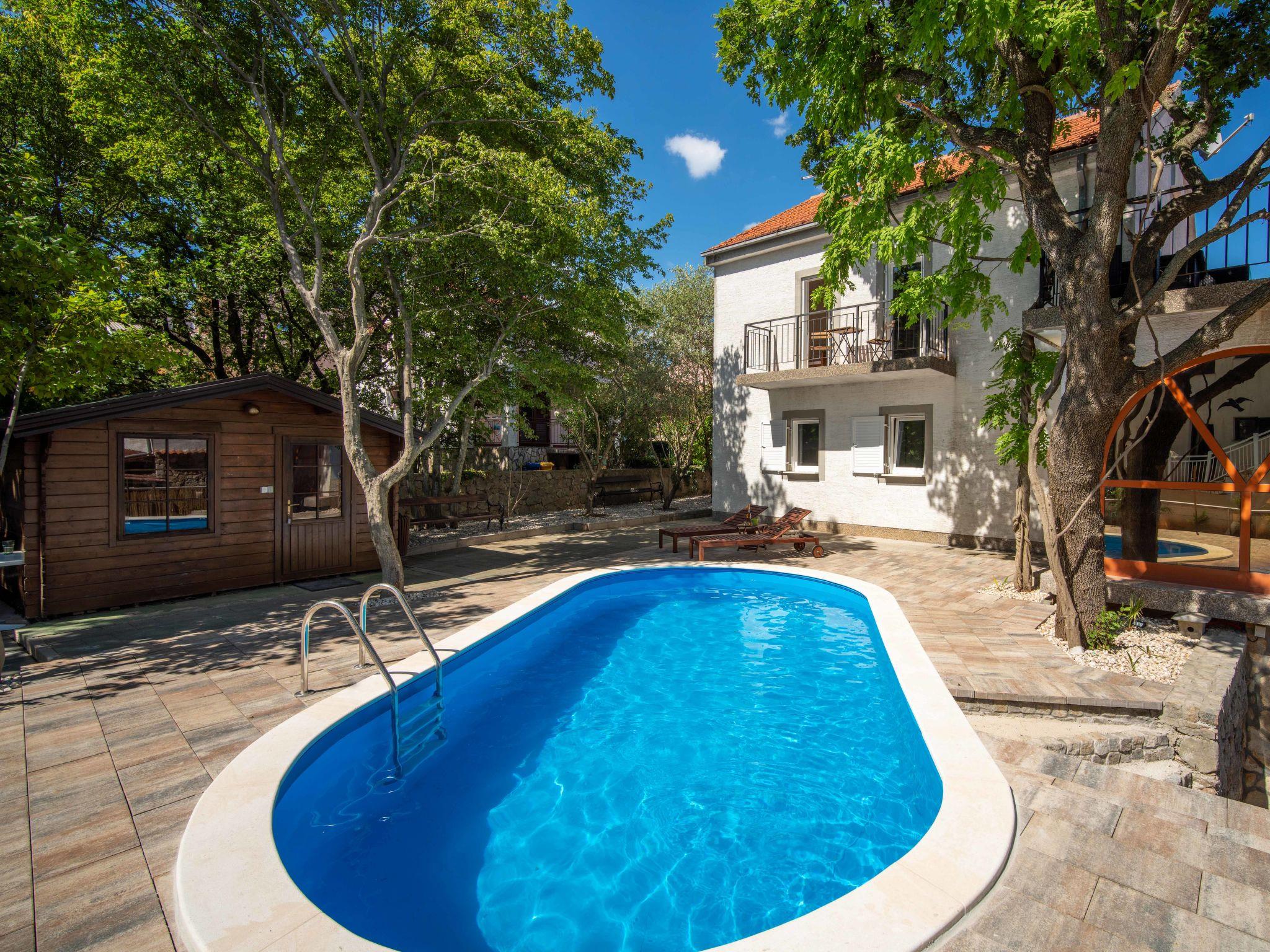 Single-family house "Noveanni", 2 storeys. 350 m from the centre of Kornic, 3.5 km from the centre of Punat, in a quiet, sunny position, 900 m from the sea, 900 m from the beach, in the countryside. Private: property 550 m2 (fenced), wildlife garden and trees, swimming pool (24 m2, depth 150 cm, seasonal availability: 01.May. - 15.Oct.). Unconventional pool shape. Outdoor shower, terrace (100 m2), garden furniture, barbecue. In the house: internet access, table football, washing machine. Parking (for 4 cars) at the house on the premises. Shop 350 m, restaurant 400 m, bus stop 1.4 km, pebble beach, public bathing area 900 m. Part of the house is closed and unoccupied.
