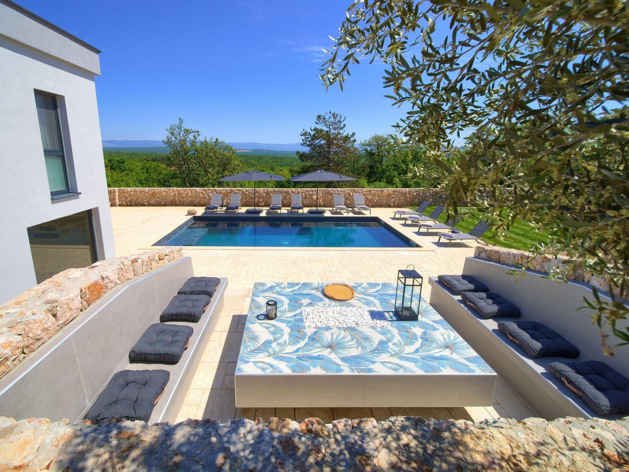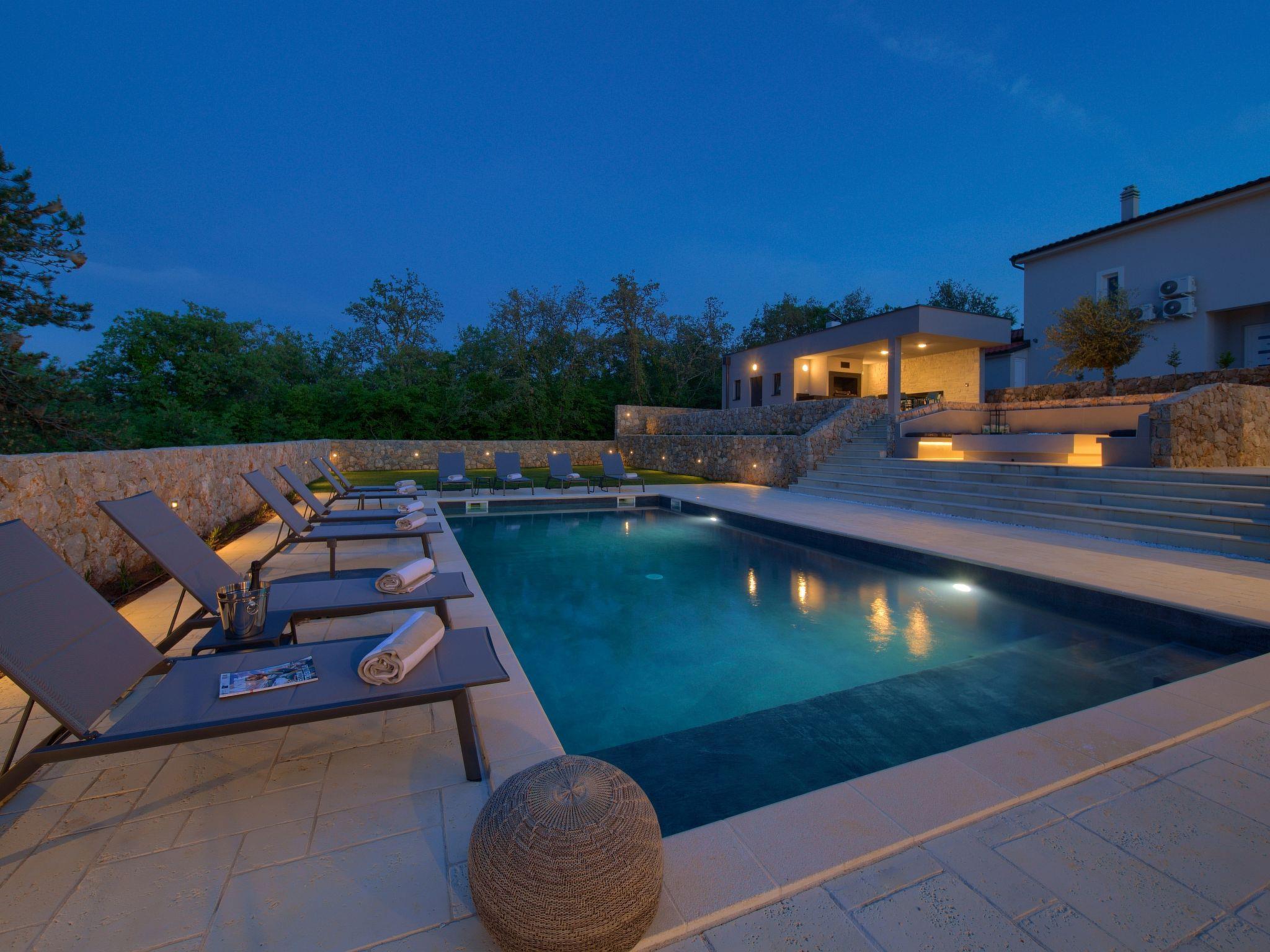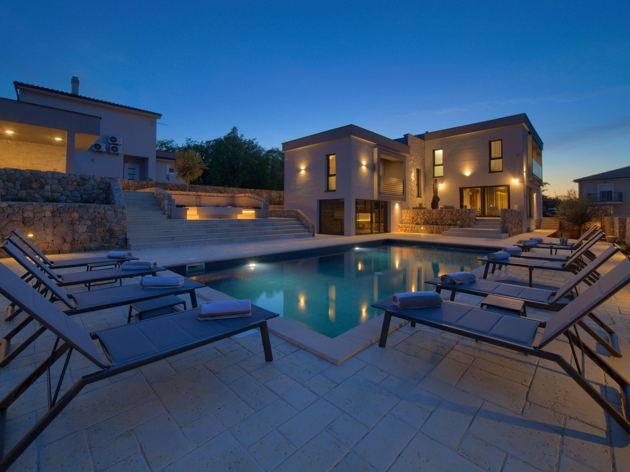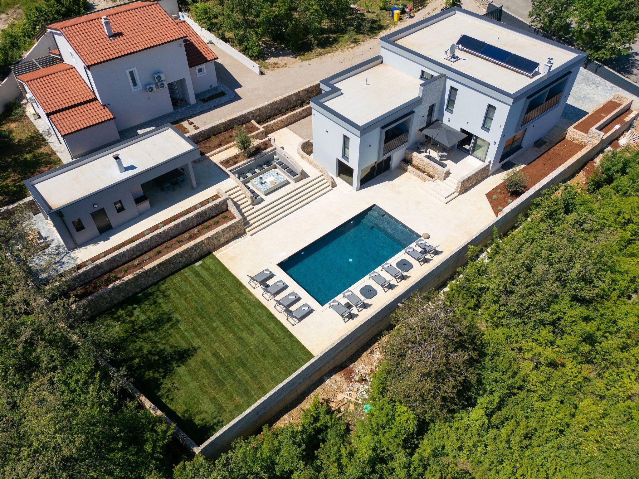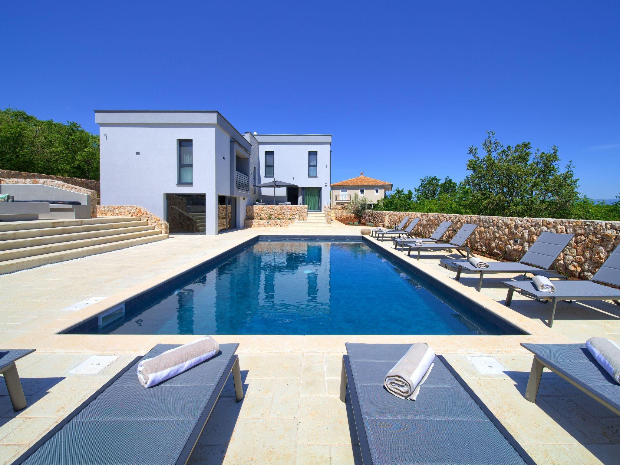 Villa "Miryam", 3 storeys, built in 2024. In the hamlet Vrh 5 km from the centre of Krk, 5 km from the sea, in a cul-de-sac. Private: property 1'150 m2 (fenced) with lawn, swimming pool, indoor pool heated (11 m2, depth 150 cm, seasonal availability: 01.Jan. - 31.Dec.). Outdoor shower, terrace (20 m2), garden furniture, barbecue, pool maintenance by the owner/gardener. In the house: internet access, sauna, fitness room, hot tub, trampoline, central heating system, air conditioning, washing machine, tumble dryer. Parking (for 4 cars) at the house on the premises. Shop 500 m, supermarket 5 km, restaurant 850 m, bus stop 5 km, shingle beach 5 km. Please note: airfield 25 km from the property. Private: swimming pool (50m2, depth: 1,50m, angular, heated, available 01.04.- 15.10.).