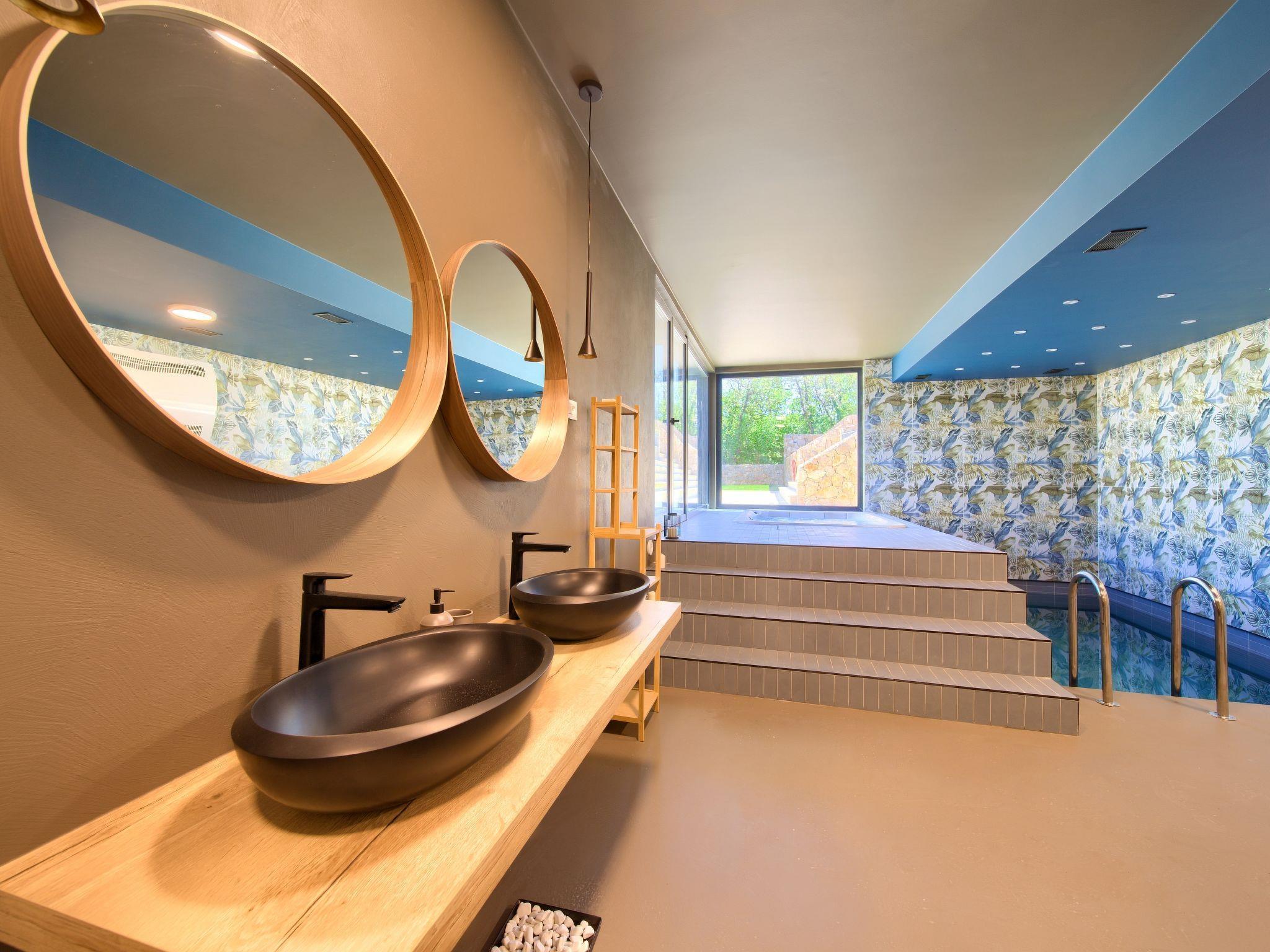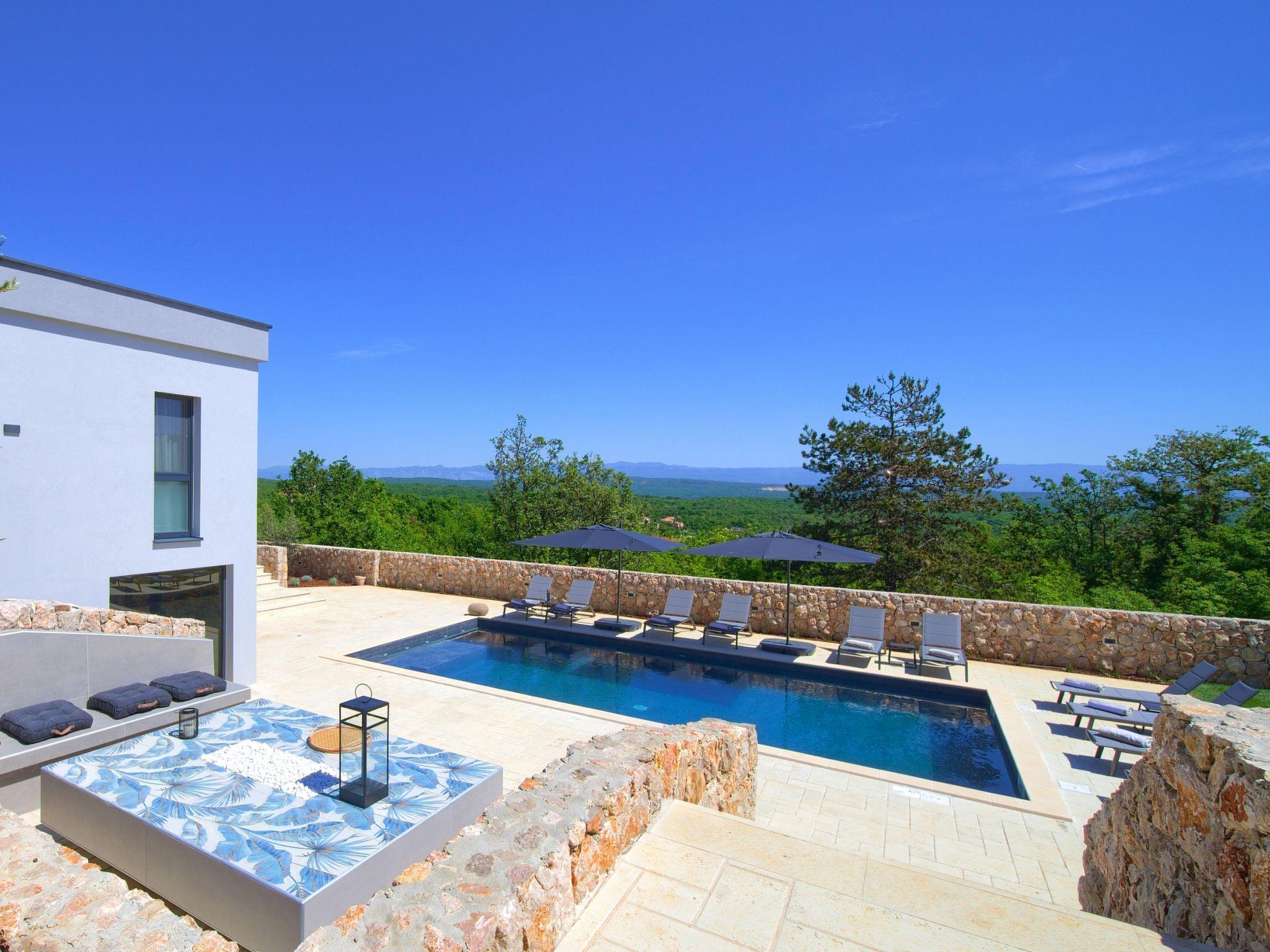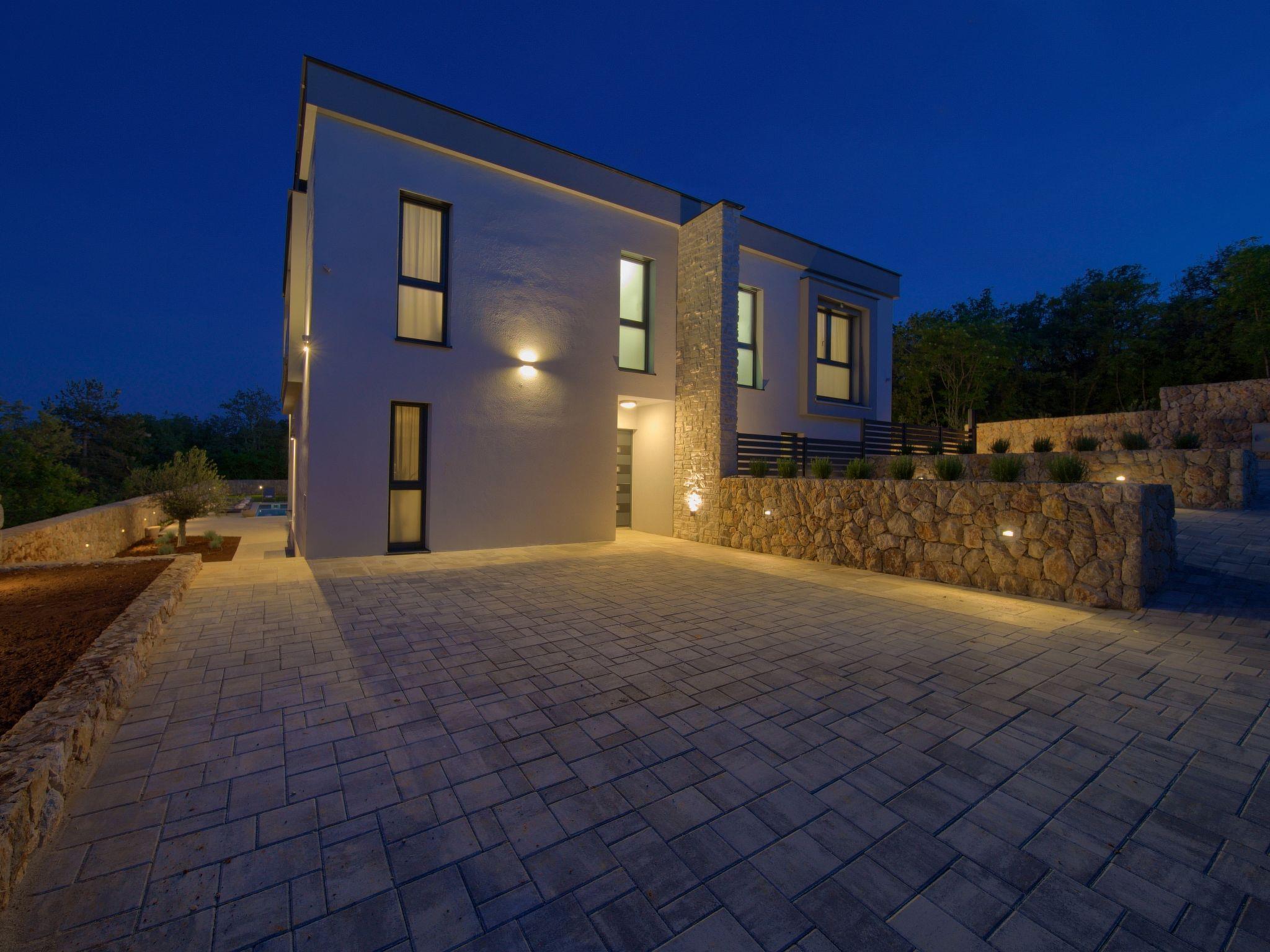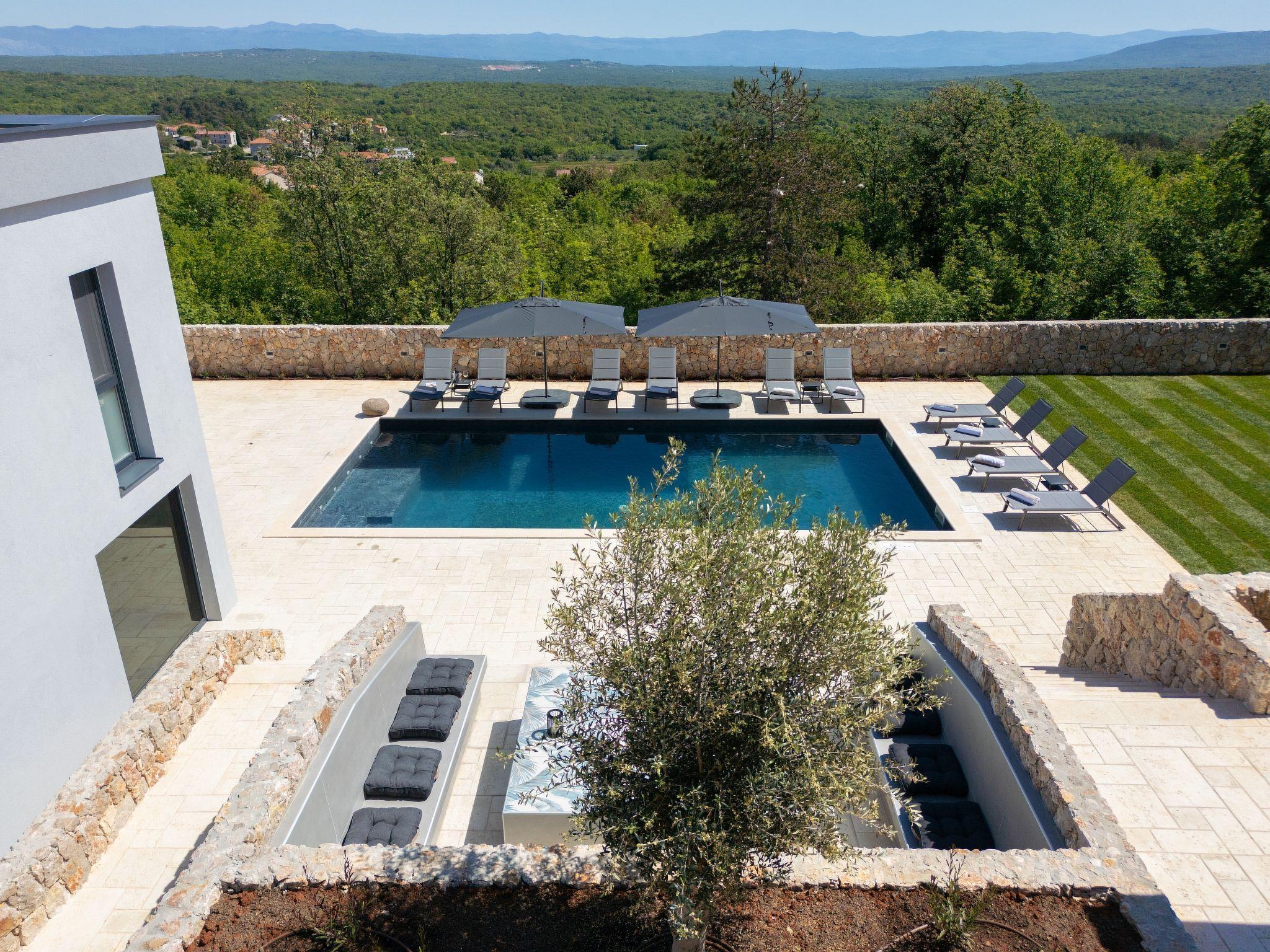Villa "Miryam", 3 storeys, built in 2024. In the hamlet Vrh 5 km from the centre of Krk, 5 km from the sea, in a cul-de-sac. Private: property 1'150 m2 (fenced) with lawn, swimming pool, indoor pool heated (11 m2, depth 150 cm, seasonal availability: 01.Jan. - 31.Dec.). Outdoor shower, terrace (20 m2), garden furniture, barbecue, pool maintenance by the owner/gardener. In the house: internet access, sauna, fitness room, hot tub, trampoline, central heating system, air conditioning, washing machine, tumble dryer. Parking (for 4 cars) at the house on the premises. Shop 500 m, supermarket 5 km, restaurant 850 m, bus stop 5 km, shingle beach 5 km. Please note: airfield 25 km from the property. Private: swimming pool (50m2, depth: 1,50m, angular, heated, available 01.04.- 15.10.).