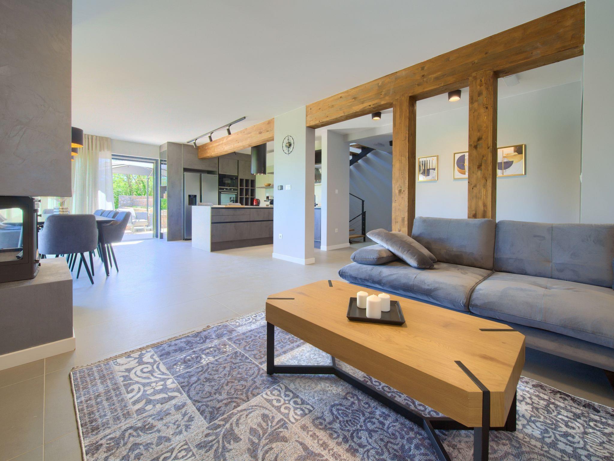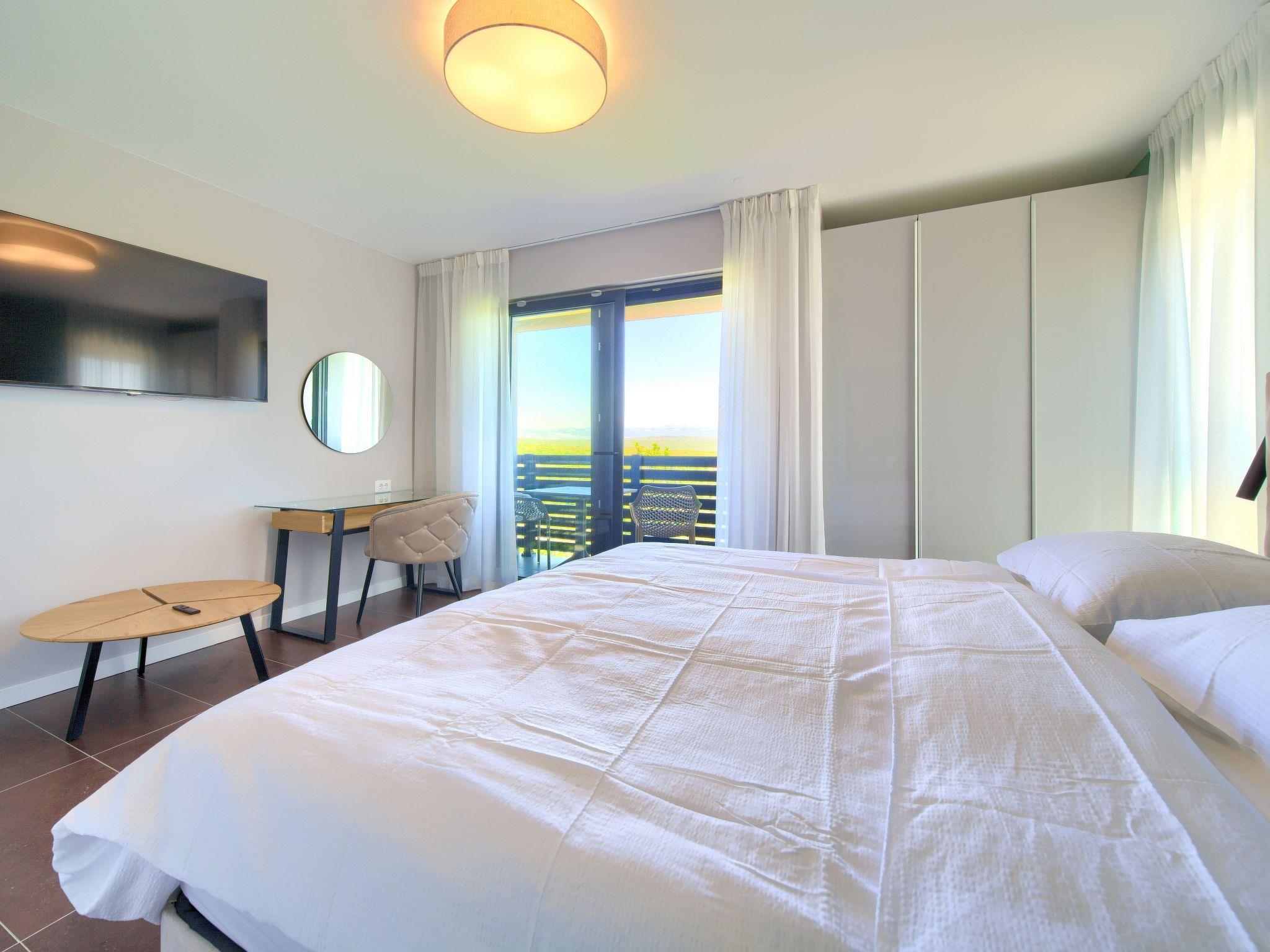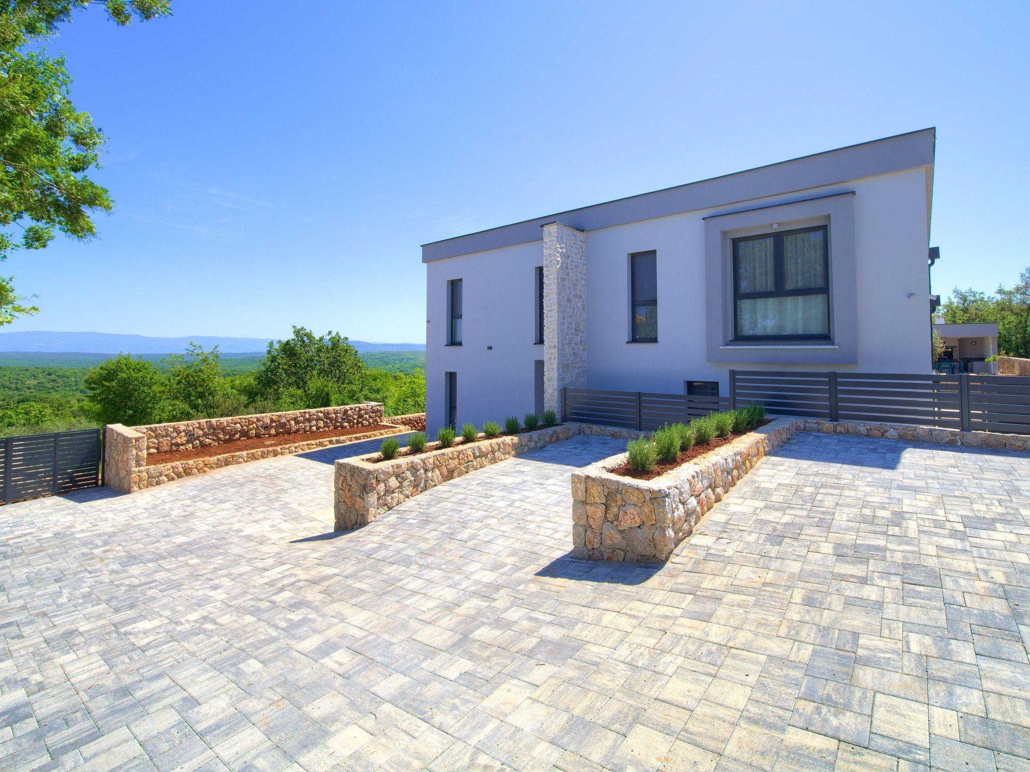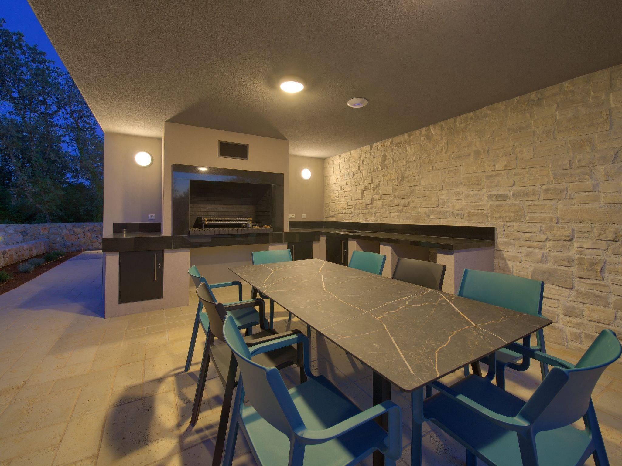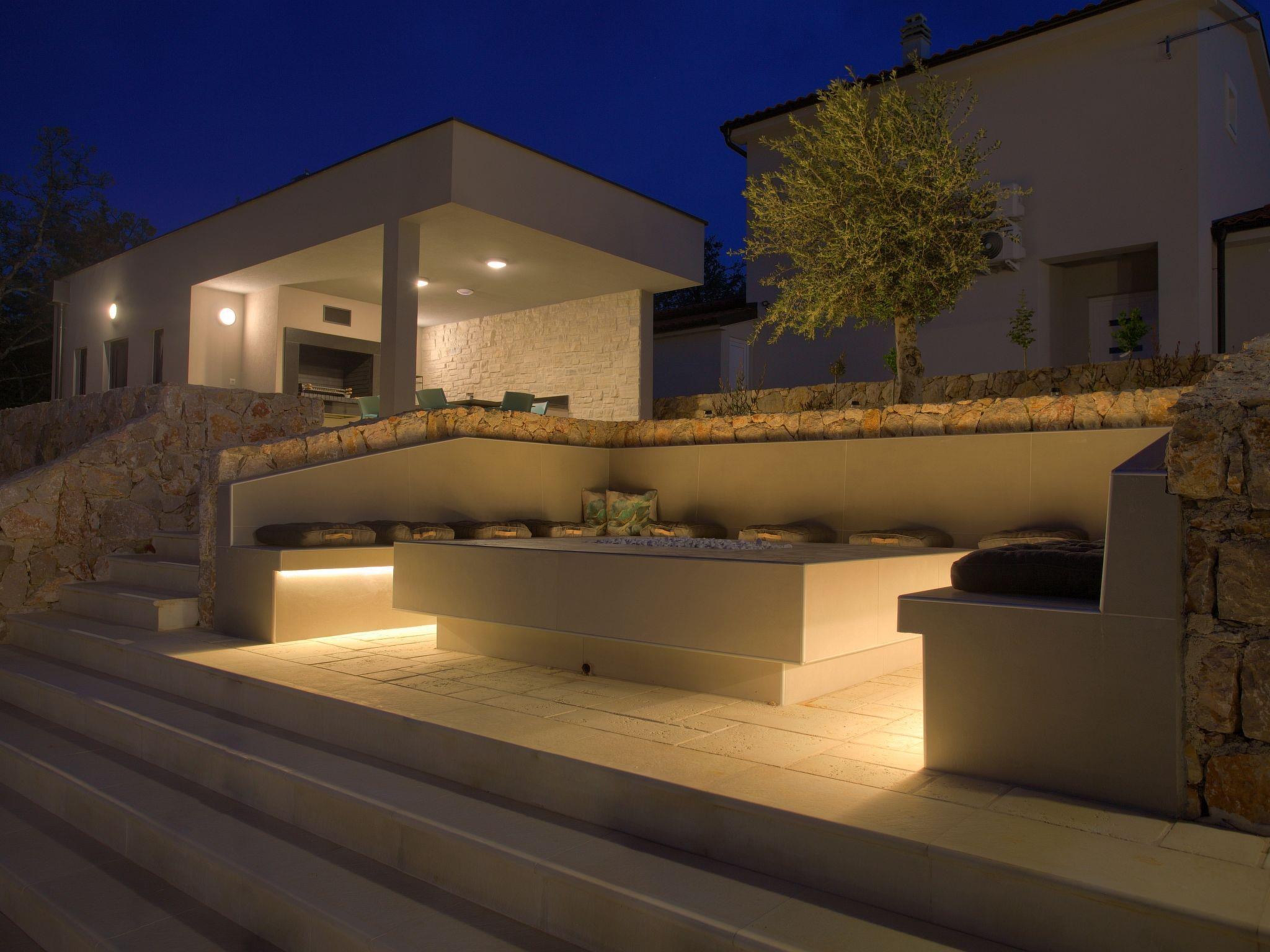 Villa "Miryam", 3 storeys, built in 2024. In the hamlet Vrh 5 km from the centre of Krk, 5 km from the sea, in a cul-de-sac. Private: property 1'150 m2 (fenced) with lawn, swimming pool, indoor pool heated (11 m2, depth 150 cm, seasonal availability: 01.Jan. - 31.Dec.). Outdoor shower, terrace (20 m2), garden furniture, barbecue, pool maintenance by the owner/gardener. In the house: internet access, sauna, fitness room, hot tub, trampoline, central heating system, air conditioning, washing machine, tumble dryer. Parking (for 4 cars) at the house on the premises. Shop 500 m, supermarket 5 km, restaurant 850 m, bus stop 5 km, shingle beach 5 km. Please note: airfield 25 km from the property. Private: swimming pool (50m2, depth: 1,50m, angular, heated, available 01.04.- 15.10.).