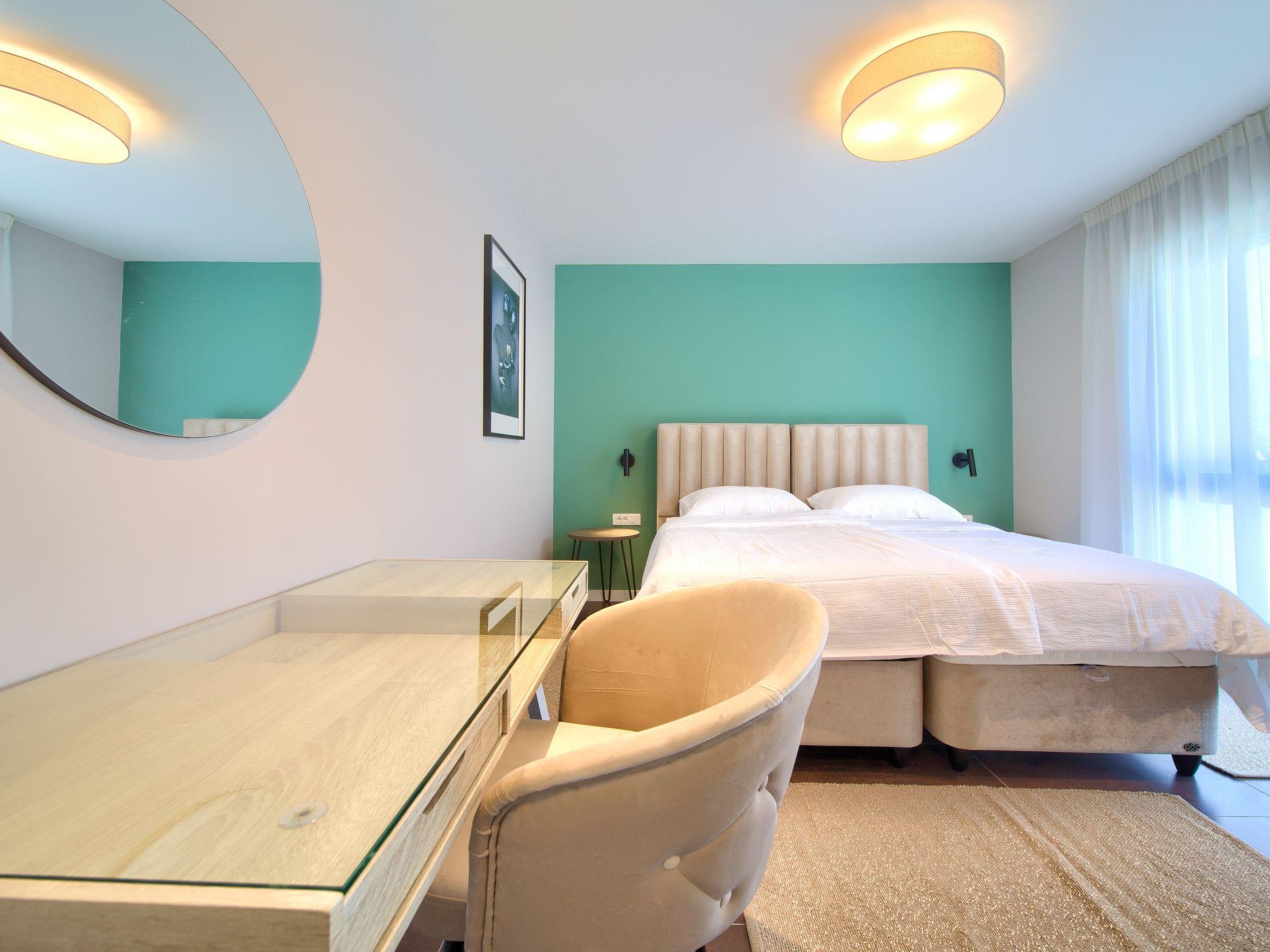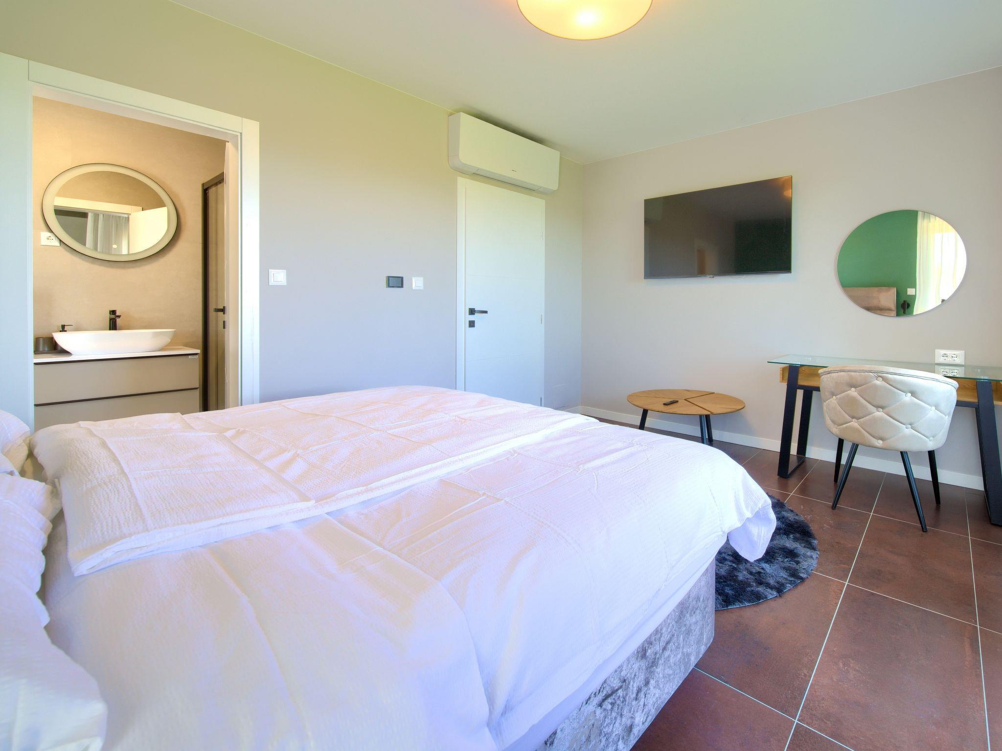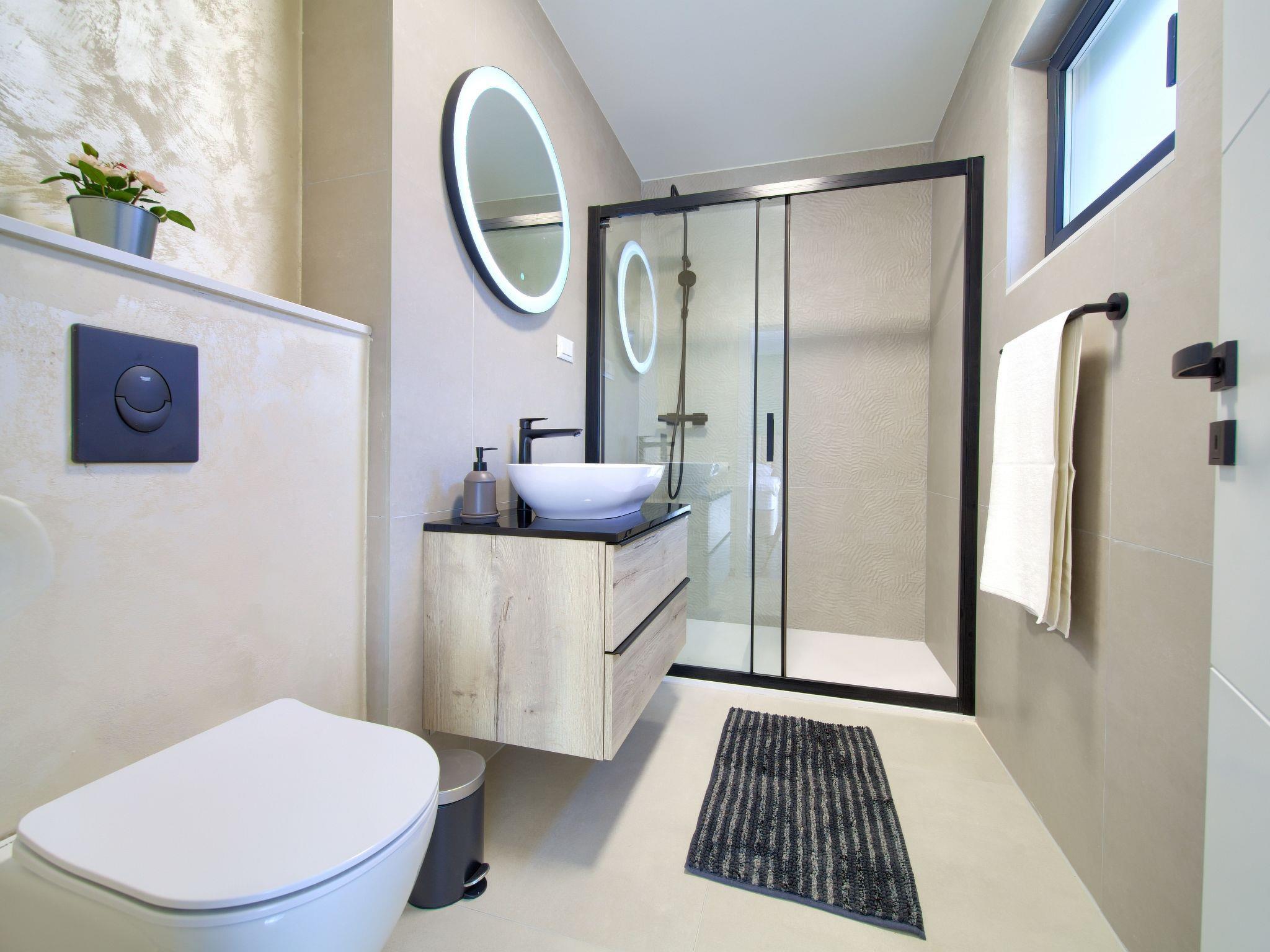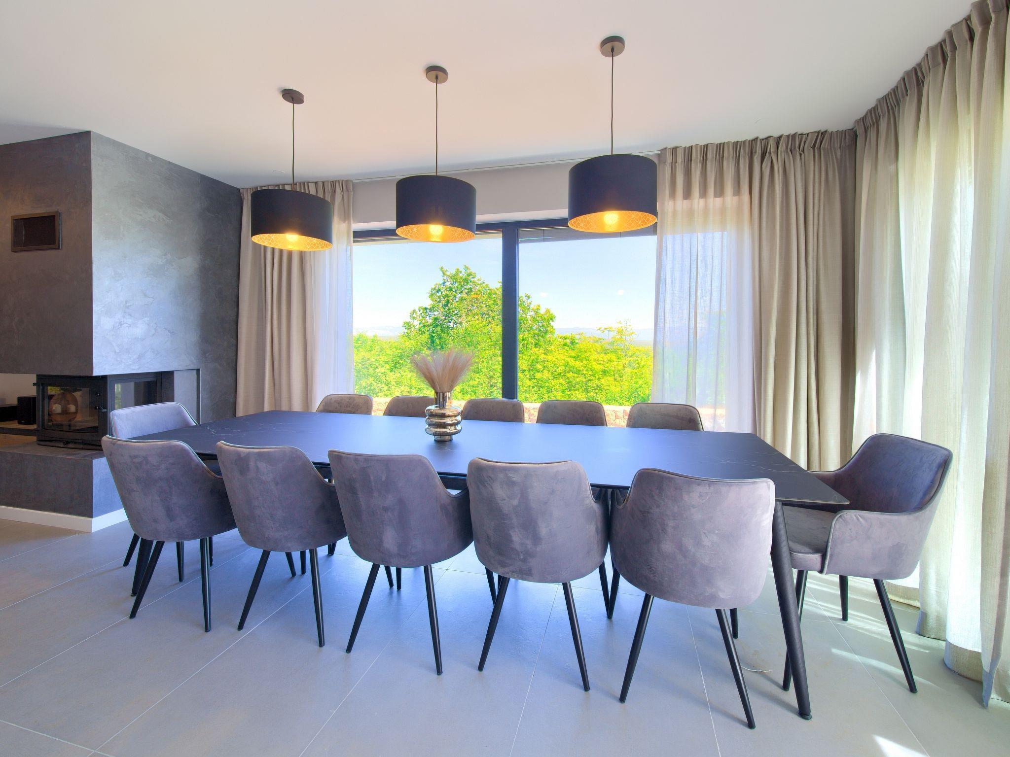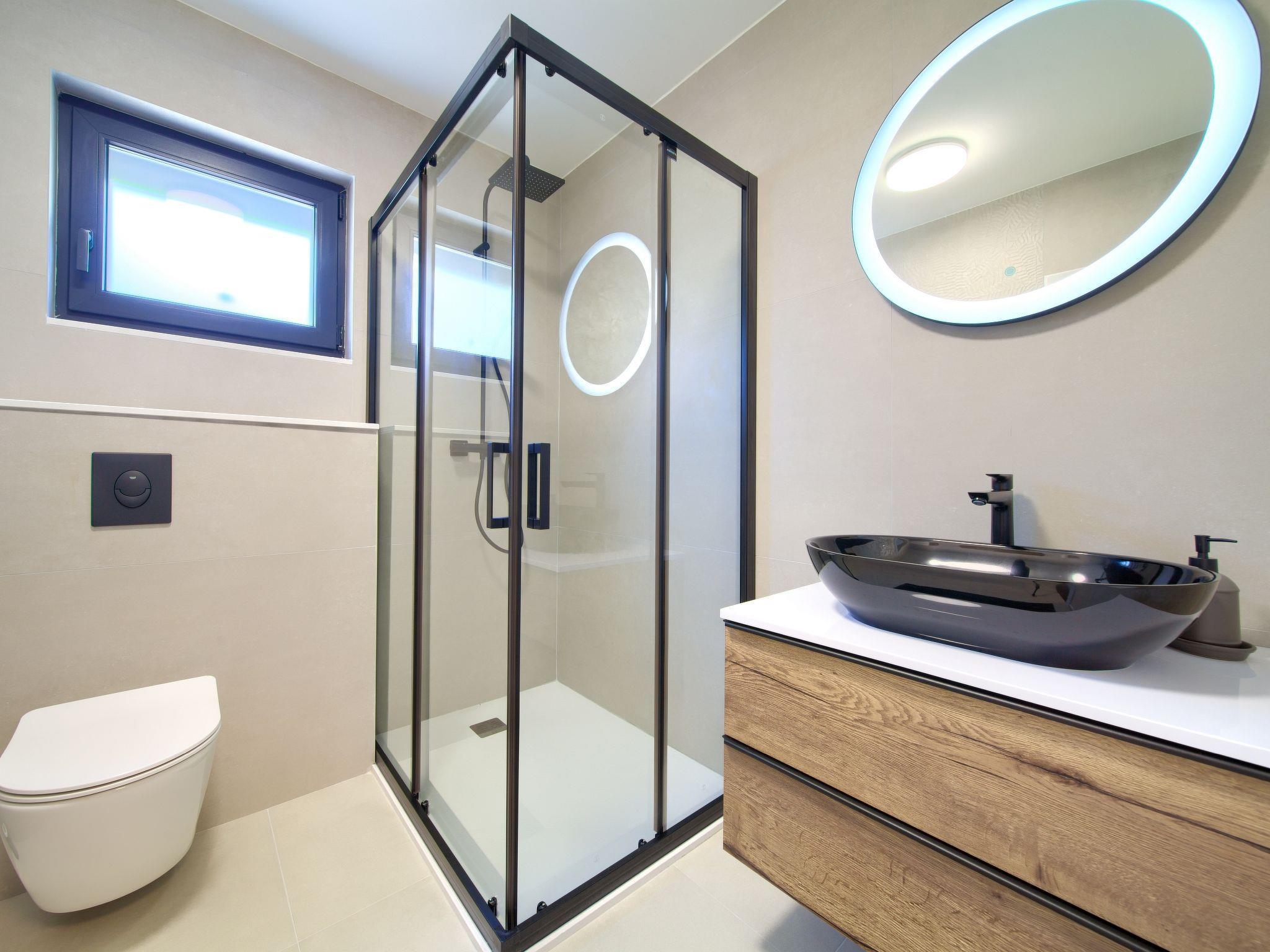 Villa "Miryam", 3 storeys, built in 2024. In the hamlet Vrh 5 km from the centre of Krk, 5 km from the sea, in a cul-de-sac. Private: property 1'150 m2 (fenced) with lawn, swimming pool, indoor pool heated (11 m2, depth 150 cm, seasonal availability: 01.Jan. - 31.Dec.). Outdoor shower, terrace (20 m2), garden furniture, barbecue, pool maintenance by the owner/gardener. In the house: internet access, sauna, fitness room, hot tub, trampoline, central heating system, air conditioning, washing machine, tumble dryer. Parking (for 4 cars) at the house on the premises. Shop 500 m, supermarket 5 km, restaurant 850 m, bus stop 5 km, shingle beach 5 km. Please note: airfield 25 km from the property. Private: swimming pool (50m2, depth: 1,50m, angular, heated, available 01.04.- 15.10.).