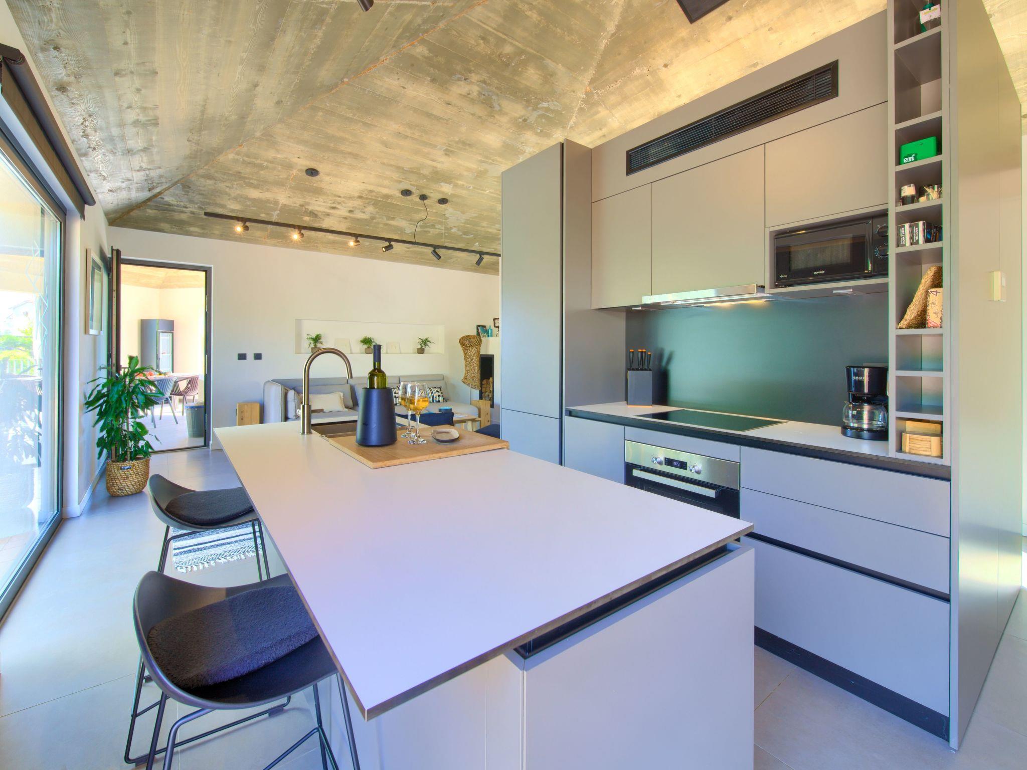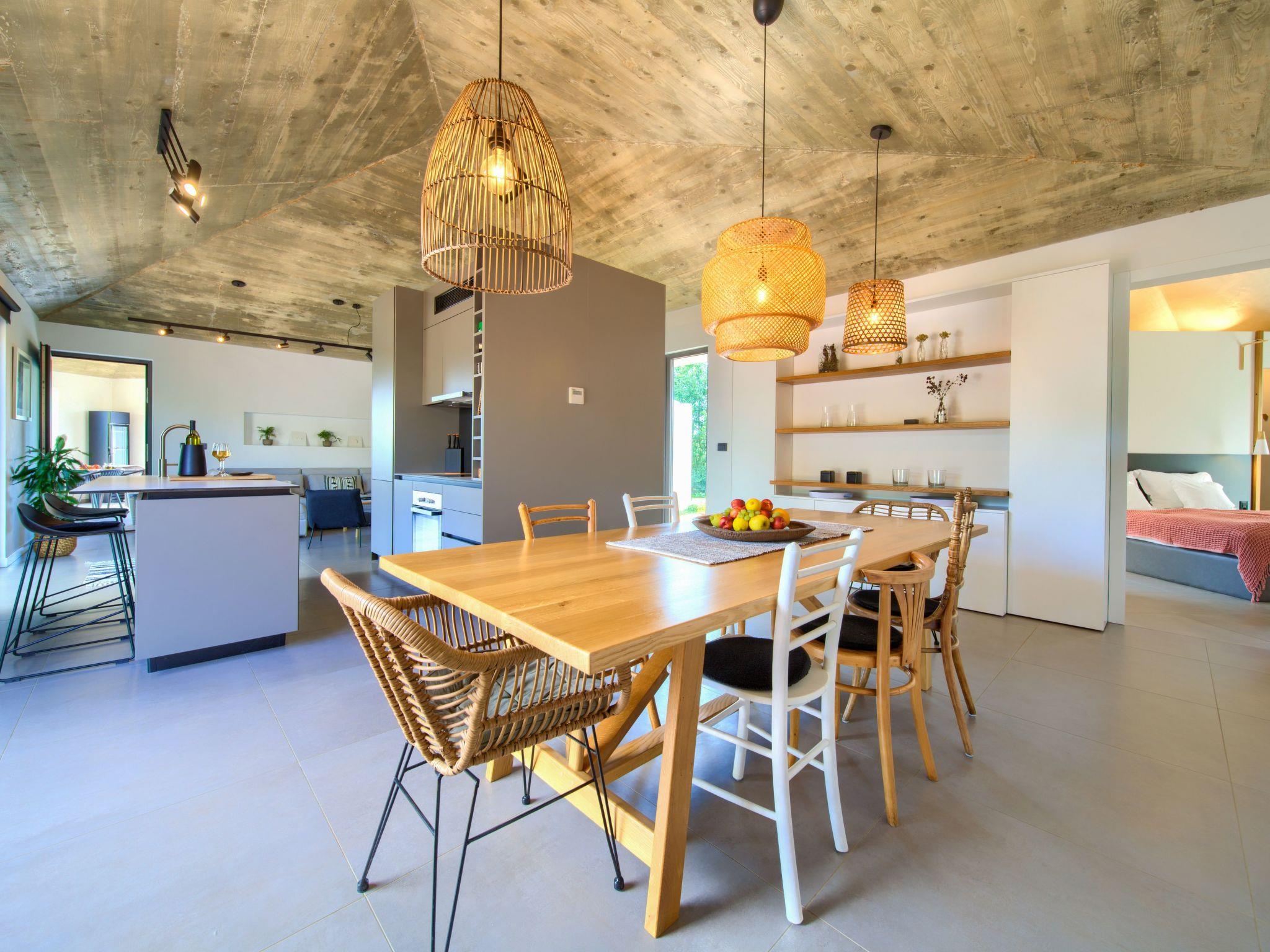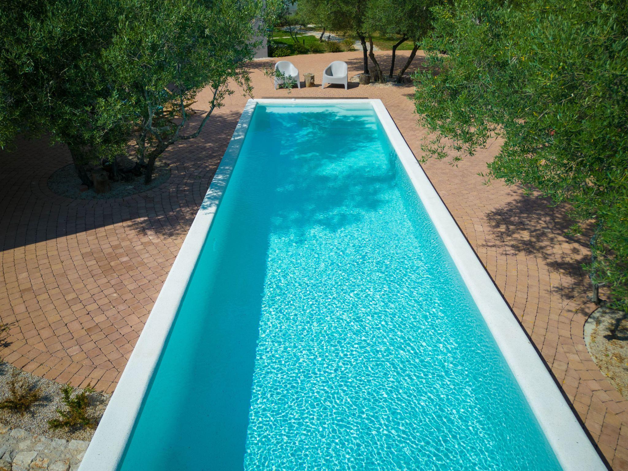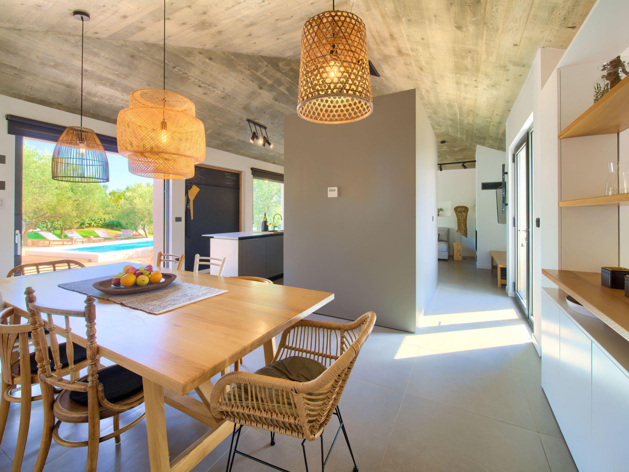 Margari Villas is a unique architectural space, perfectly integrated into the natural ambiance of olive groves, situated in the quiet village of Linardici on the island of Krk. The whole estate consists of several buildings, uniquely designed as indented multi-story ground floor houses, which surround a central atrium dominated by old olive trees and Mediterranean plants, with an infinity pool in the center. It is a space for socializing, relaxing, and enjoying nature. It is interesting that the space of the houses was built in such a way that the old olive grove determined the position of individual parts of the building, so Margari represents three buildings, the first of which is the entrance space and reception with front parking. There is an entrance to the biggest house with a living room and dining room, and two bedrooms with private bathrooms with shower and walk-in wardrobe. Each room also has access to the courtyard with its terrace. From the living room, you exit to the central atrium with a swimming pool, as well as a loggia for dining and barbecue, and a cantilevered balcony. From the central courtyard, you enter a small house dominated by a spacious kitchen with a kitchen island and a space for socializing with the preparation of culinary delicacies. From this space, you enter two bedrooms, equipped with private bathrooms, walk-in wardrobes, and private terraces. From this building, you can reach the backyard with olive groves and Mediterranean plants, as well as the back parking lot and the entrance to the plot. There are 4 bicycles at your disposal, and pets are welcome. Margari Villas is the place where you'll enjoy your perfect vacation in a natural and authentic environment.