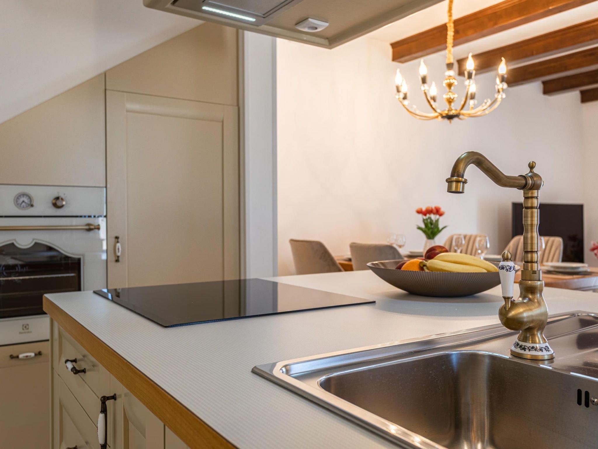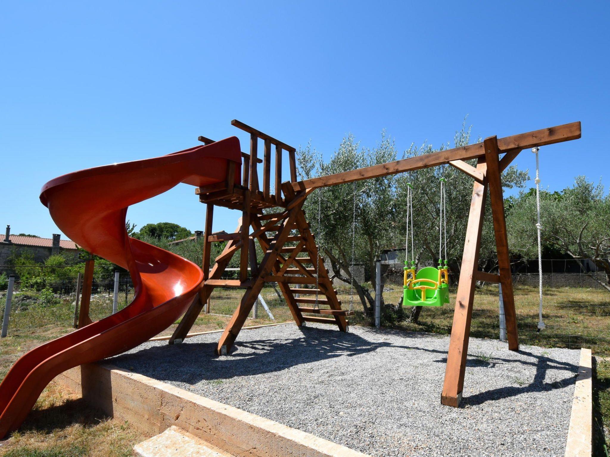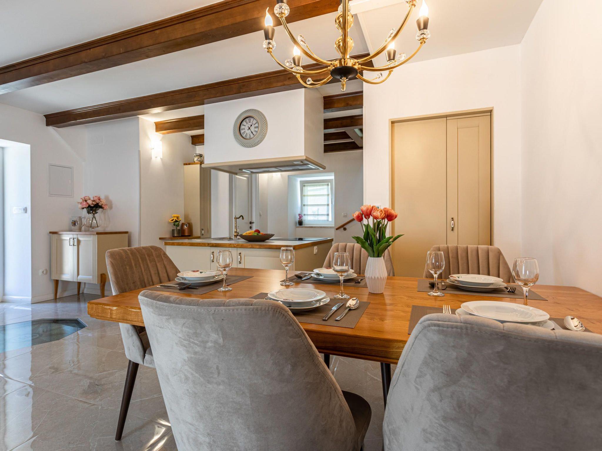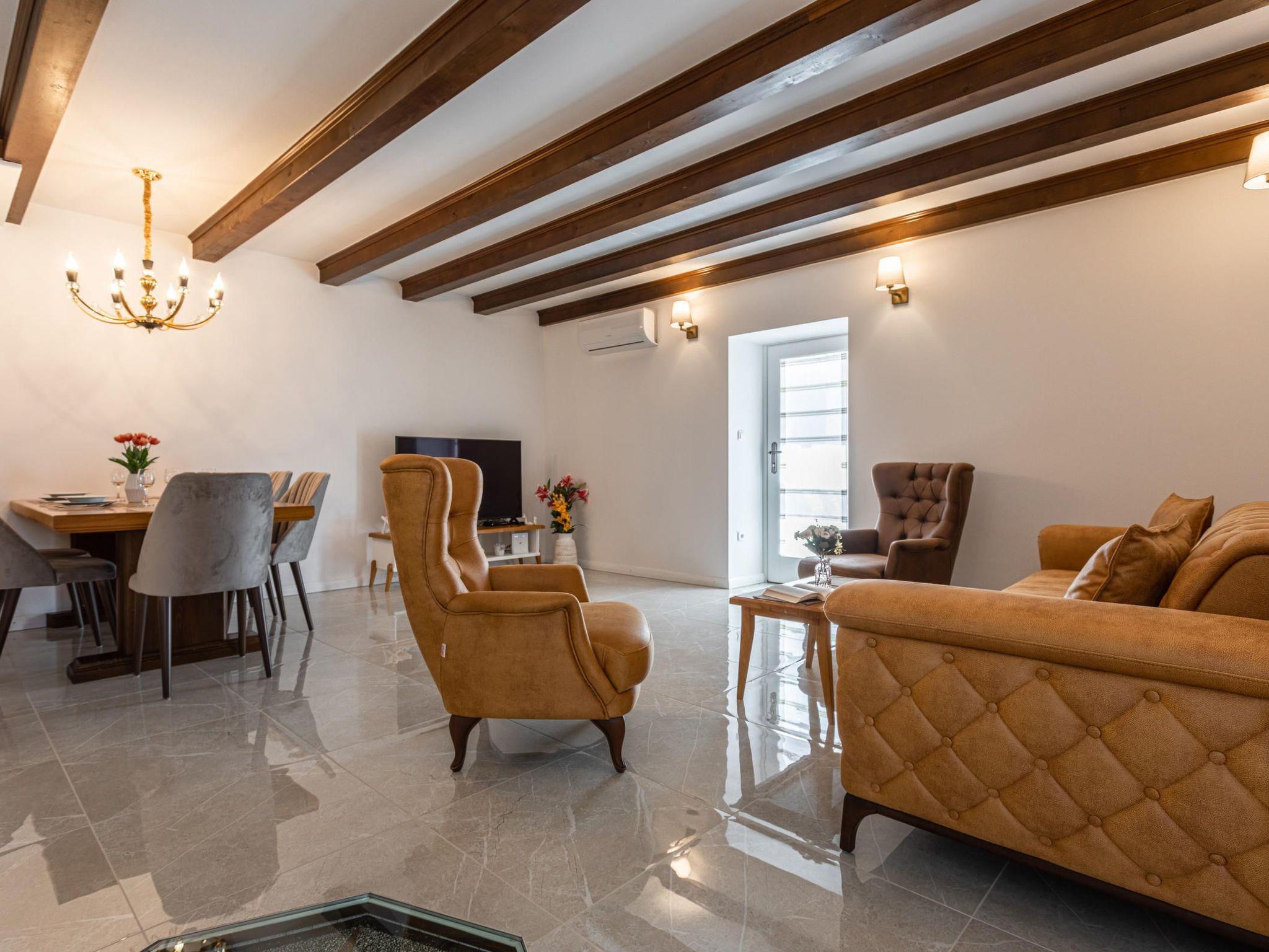 Villa Frana is a traditional house, lovely restored to a rustic villa with a private pool. Located in a peaceful area, surrounded by olive trees, this villa is ideal for relaxing holidays. Villa Frana will thrill you with its bright interior decorated in a rustic style. It can accommodate up to 6 people and consists of two bedrooms located on the upper floor, each with a double bed and air conditioning. One bedroom also has an extra bed for one person. There are two interesting decorated bathrooms, one on the upper floor and the other on the ground floor, one with a shower and another with a bathtub. There is a fully equipped kitchen at your disposal on the ground floor, with a dining area for six persons that opens up to the living room. The villa is located on a 1000 m2 large plot with a private pool cozy sun loungers and an outdoor dining area, where you can enjoy your meals prepared on the BBQ.