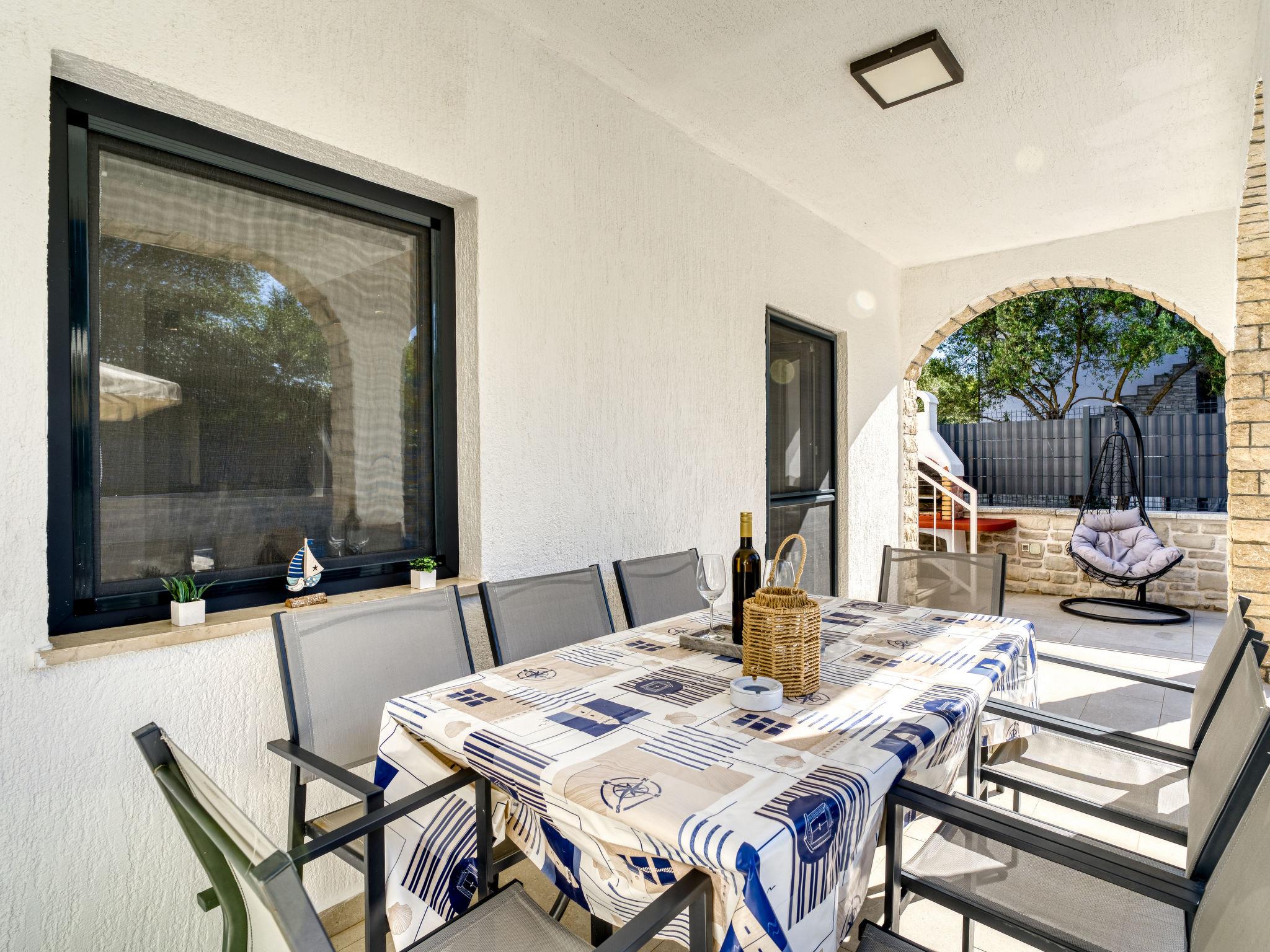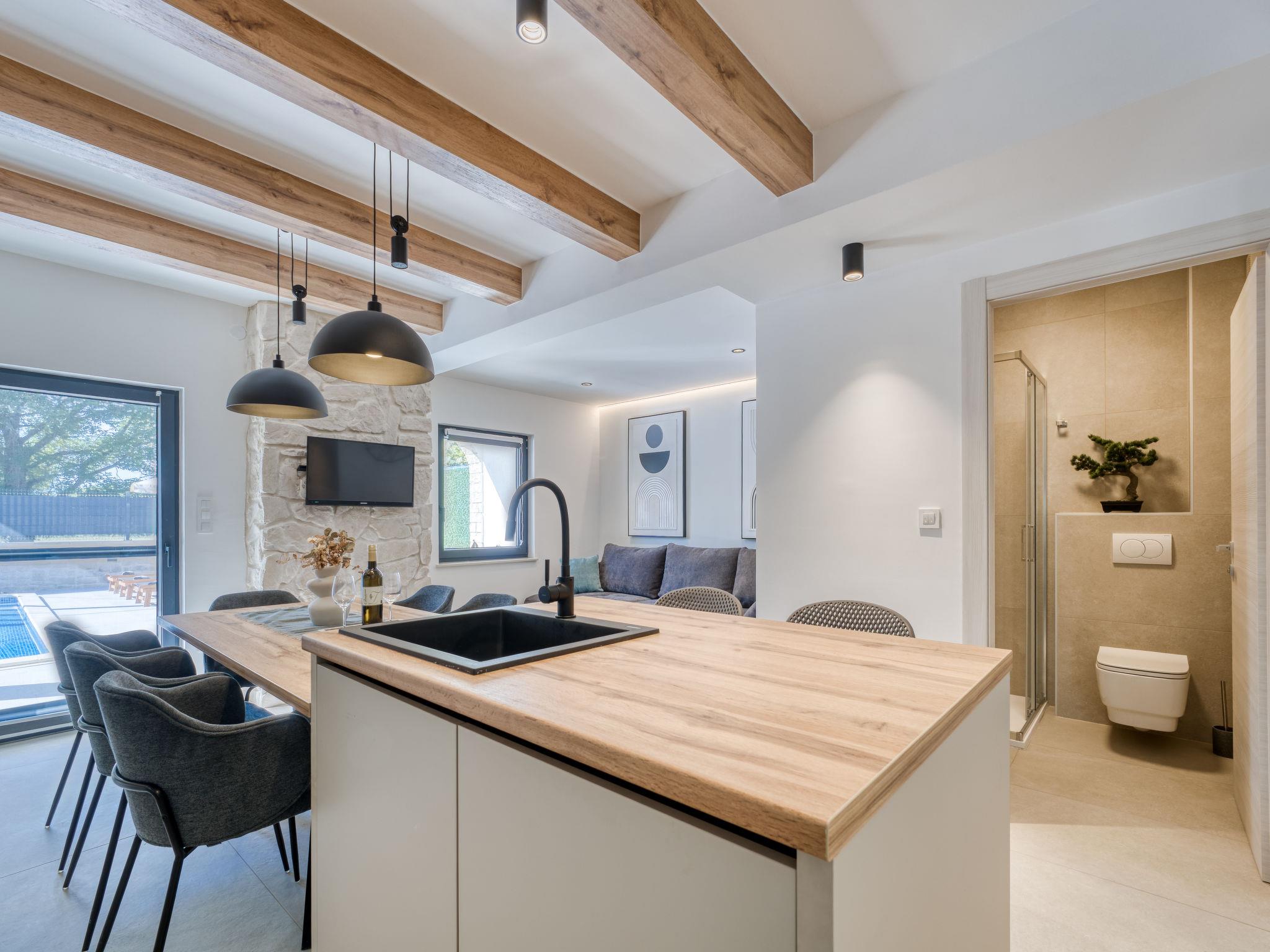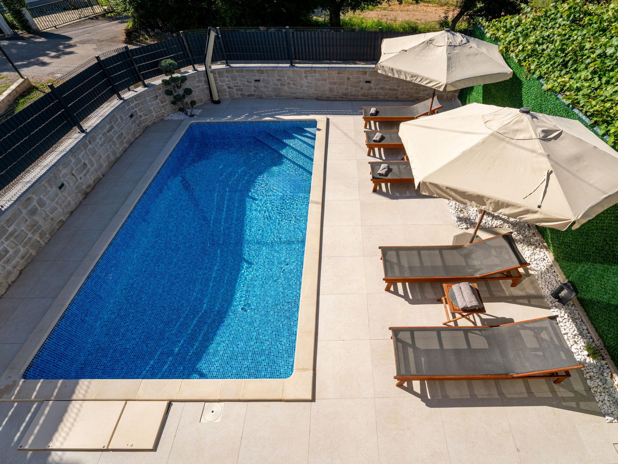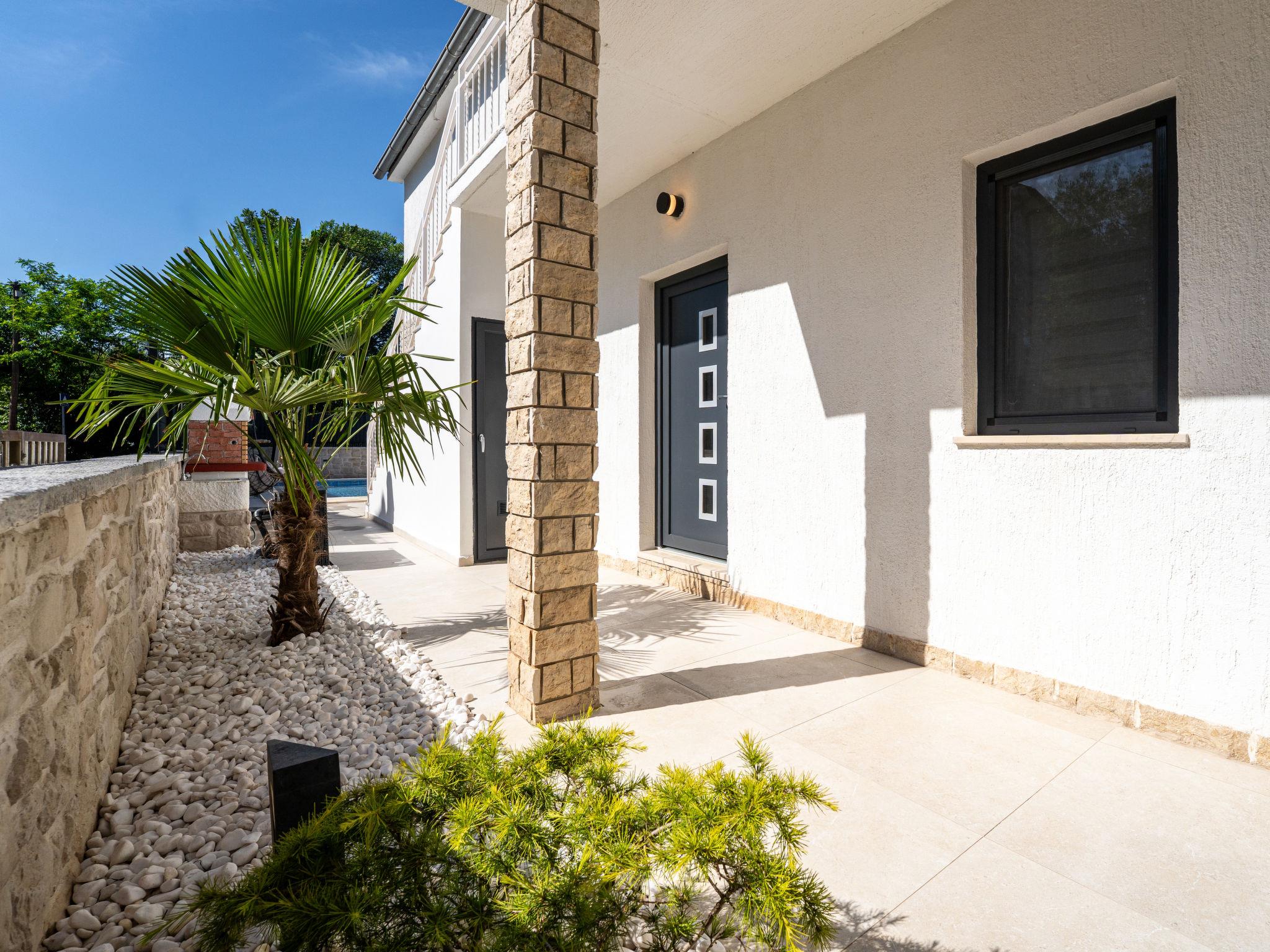 Semi-detached house "Domagoj". In the hamlet Sveti Anton 2.5 km from the centre of Malinska, 11 km from the centre of Krk, 20.5 km from the centre of Vrbnik, 1.8 km from the sea. Private: property 200 m2 (fenced) with trees, swimming pool heated (7 x 3 m, 24 m2, depth 120 - 150 cm, seasonal availability: 15.Mar. - 15.Nov.) with salt-electrolysis pool-cleaning system. Outdoor shower, pool maintenance by the owner/gardener. In the house: washing machine (for shared use, extra). Parking (for 2 cars) on the premises. Shop 1 km, bus stop 350 m, pebble beach 1.8 km. Please note: the owner lives in the same residence. Airfield 17 km from the property. The owner lives in an apartment on the upper floor.