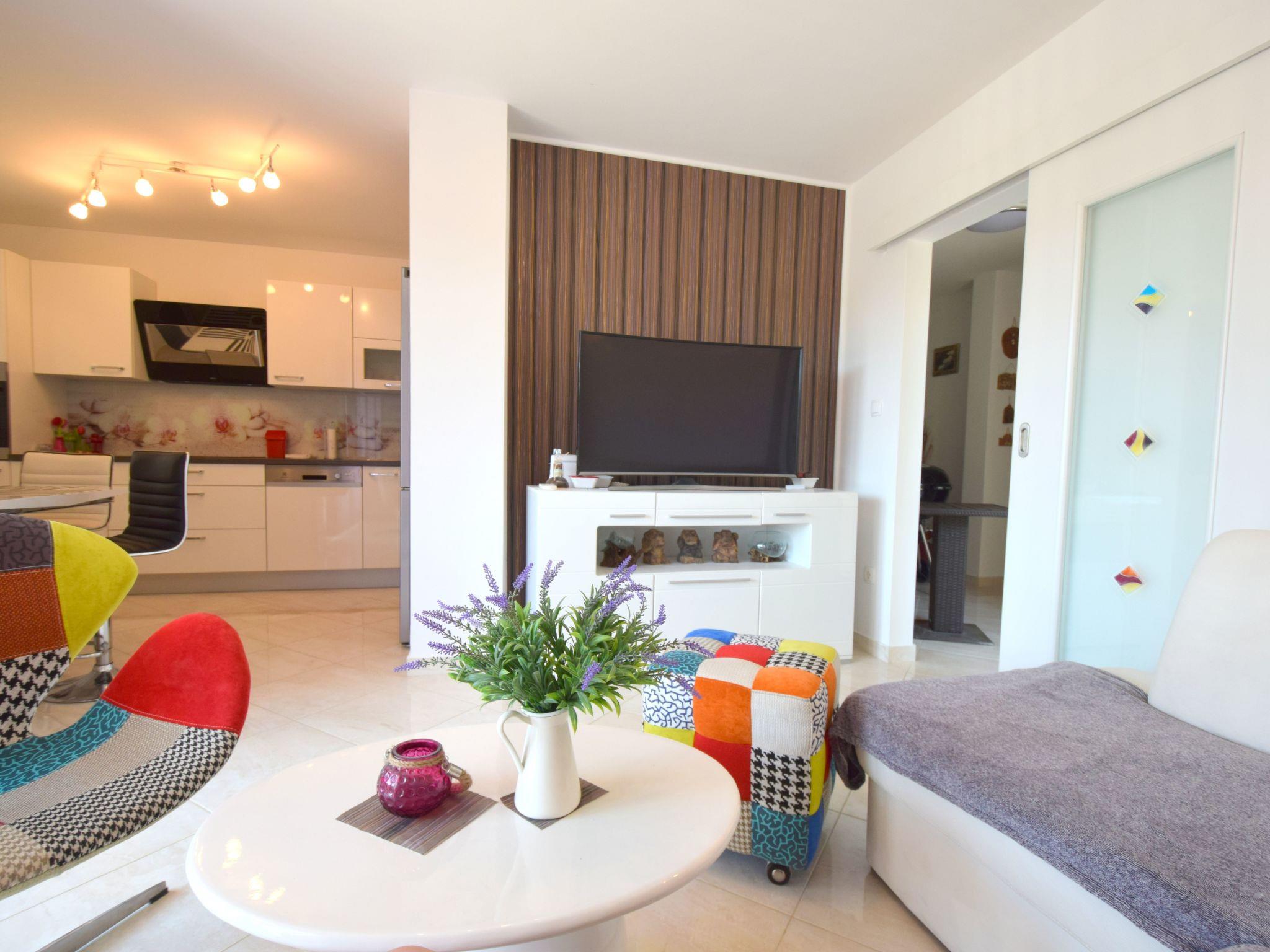 This nice furnished apartment is situated on the ground floor in an apartment house, distanced 400 meters from the center Malinska and 600 meters from the beach. Restaurants and shops are also nearby. The apartment consists of 2 bedrooms, a living room, kitchen and dining room, bathroom with shower, TV sat, air conditioning, and parking are on your disposal. Pets are not allowed.