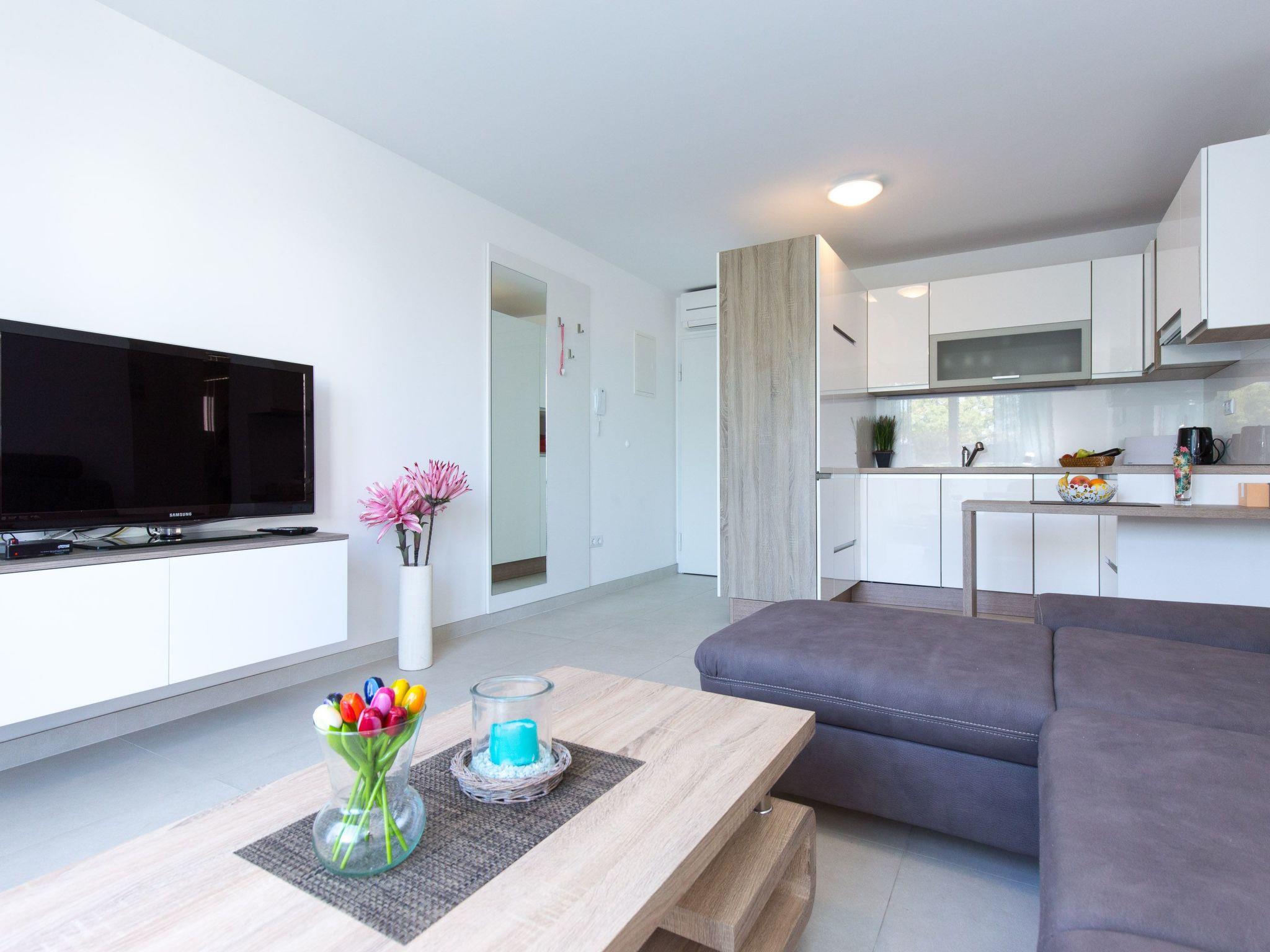 This new, nice, and modern furnished apartment house is situated in Malinska, located about 50 meters from the beach and restoraunt, 1500 meters from the grocery store. The house consists of 2 apartments. The first apartment is situated on the ground floor. The apartment is new, nice, and modern furnished, consisting of 1 double bedroom, a spacious living room with a fully equipped kitchen and dining room, and one bathroom with shower and terrace. At your disposal are also air conditioning, heating, TV sat, internet access, and public parking space 20 m from the building. Pets are not allowed.