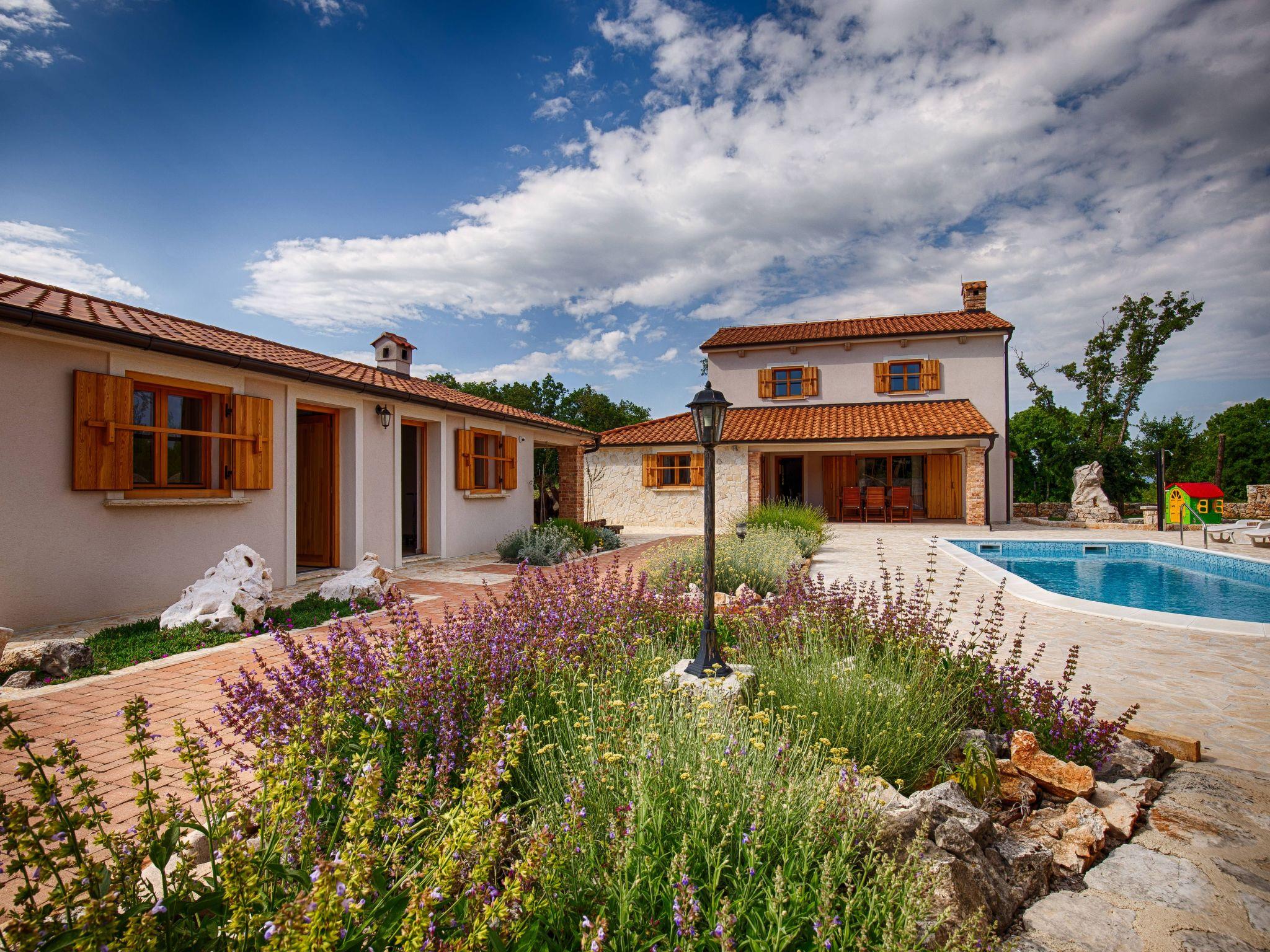 In front of the villa is a covered terrace with table and chairs also a children's playground. In the yard is the pool of 36 m2.