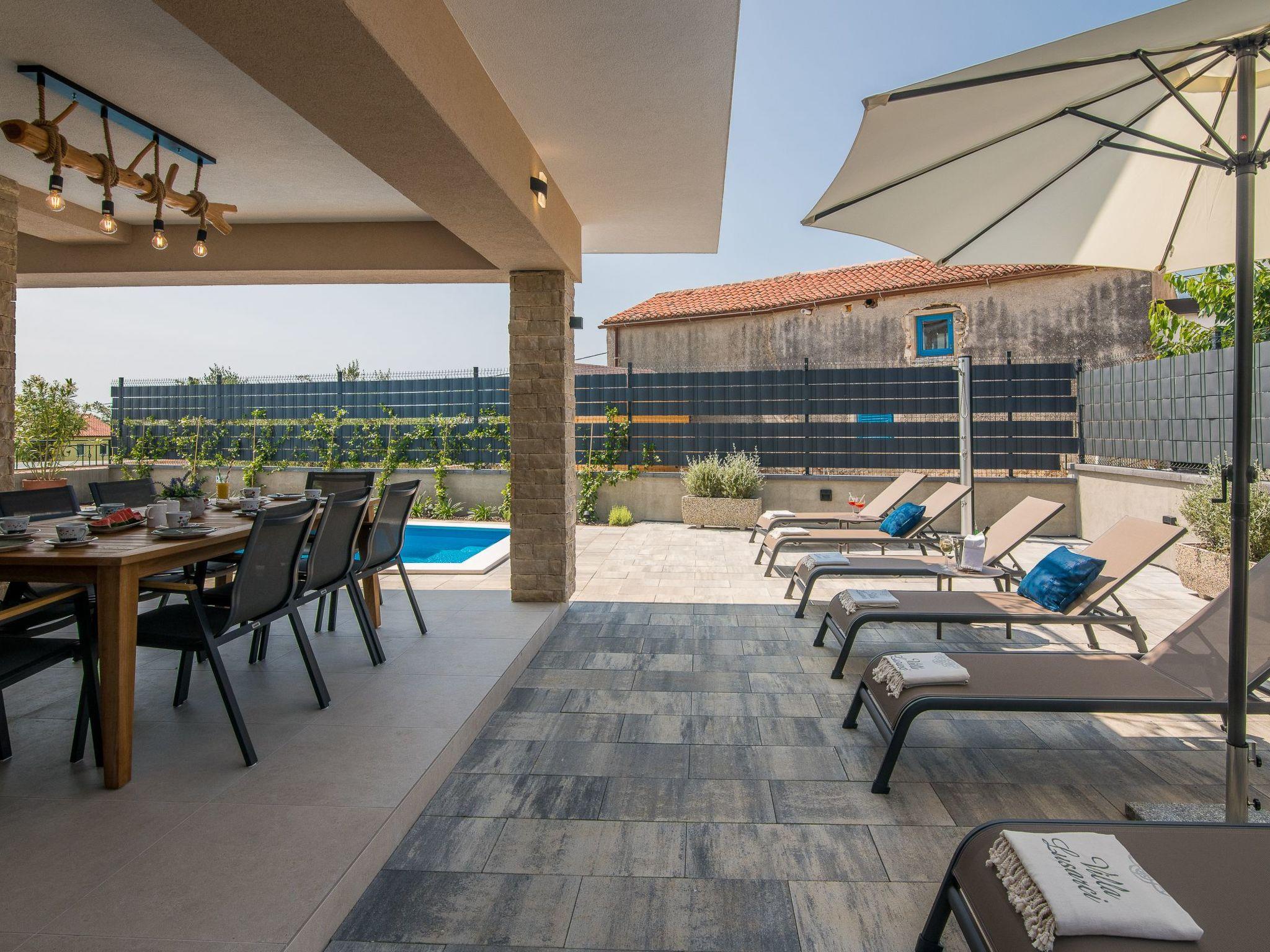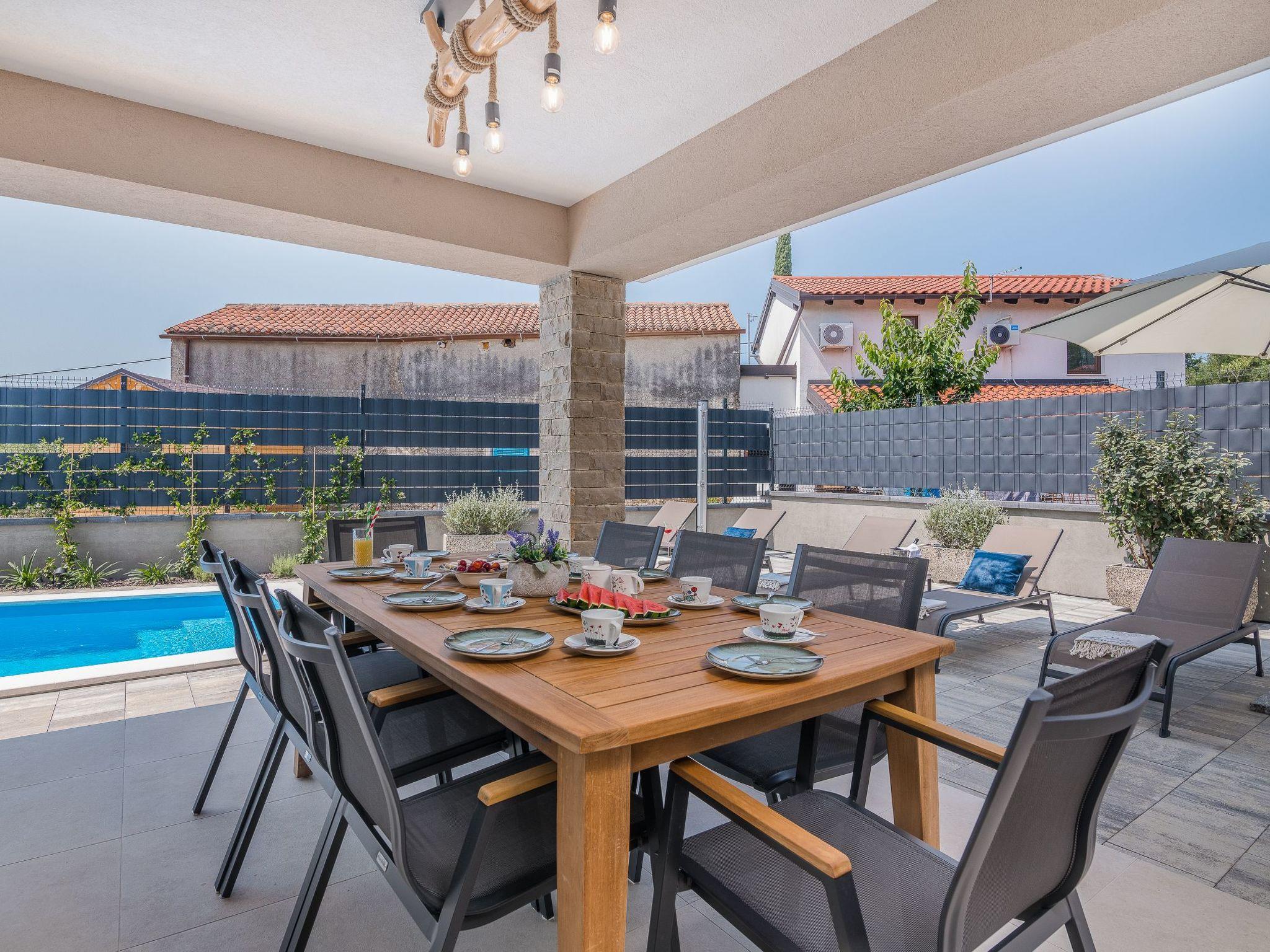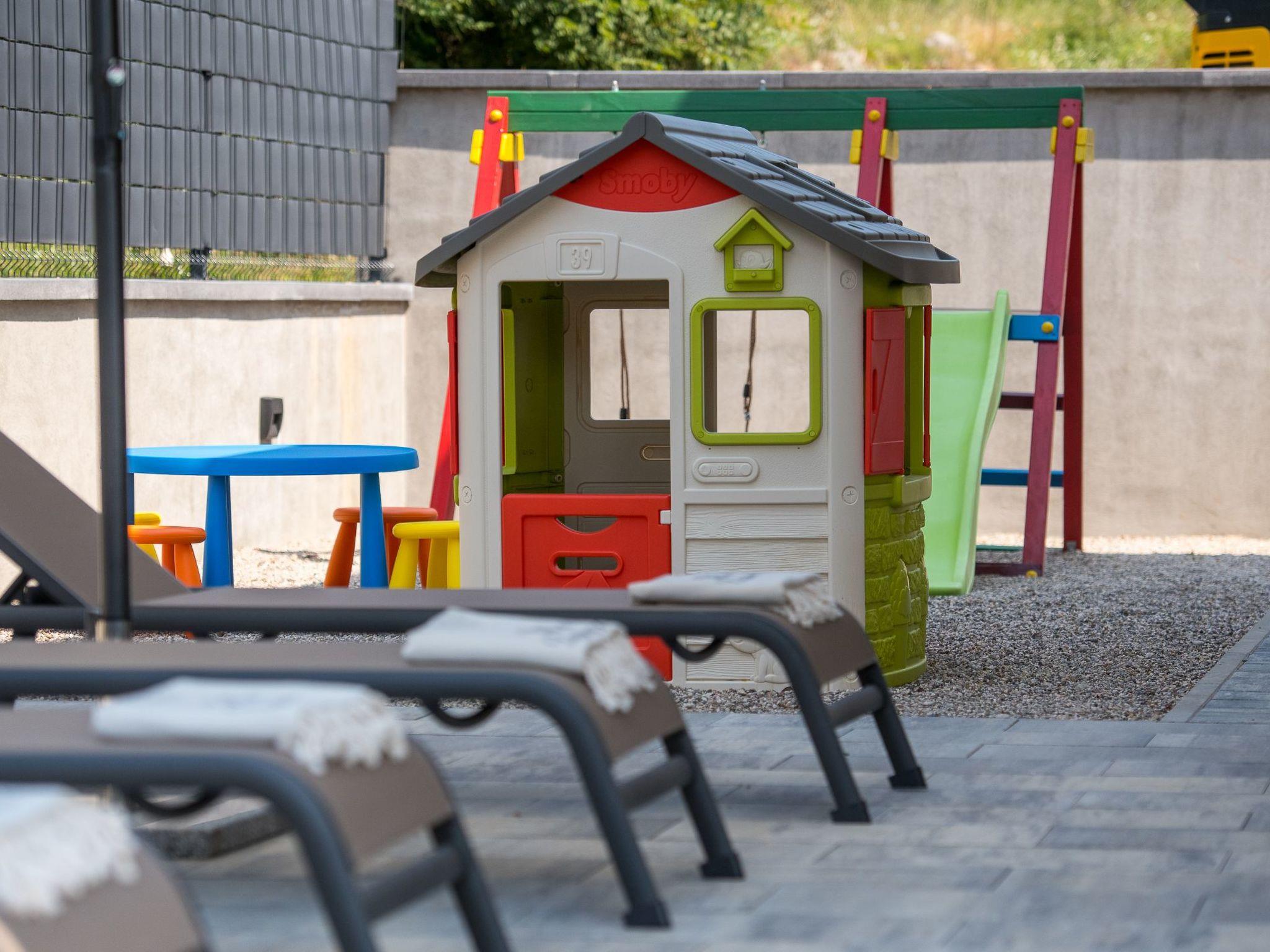 In the garden of the villa there is a swimming pool with deckchairs, a table with chairs and a covered barbecue.