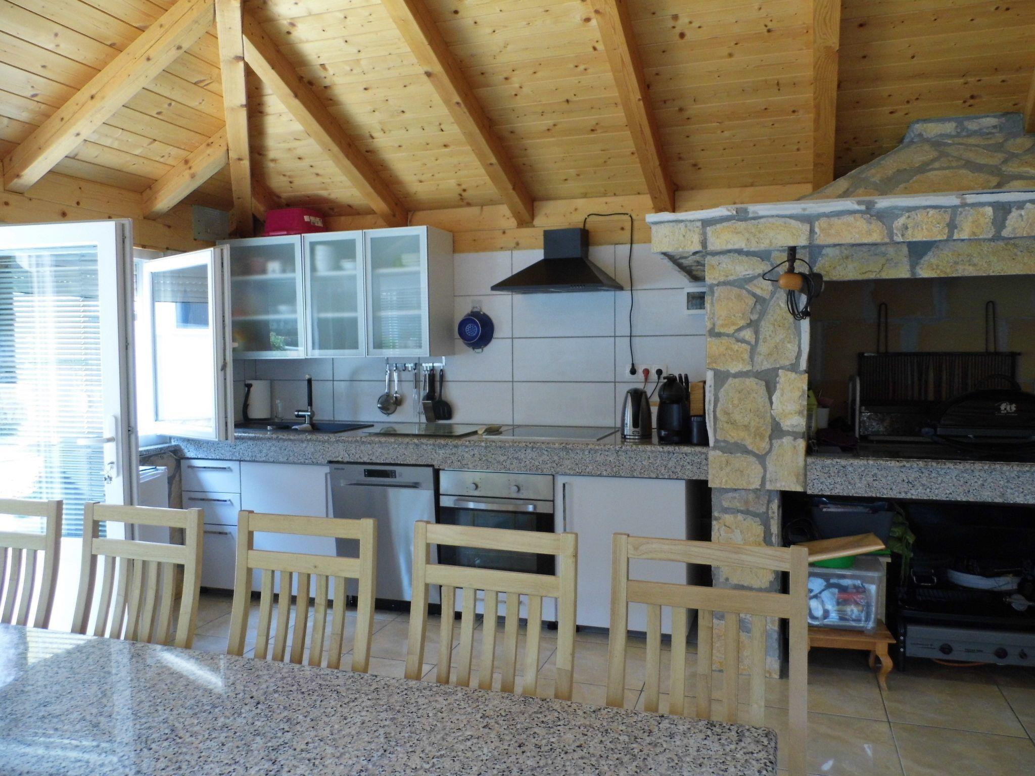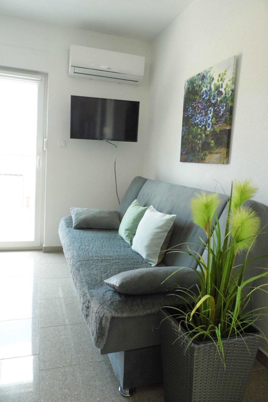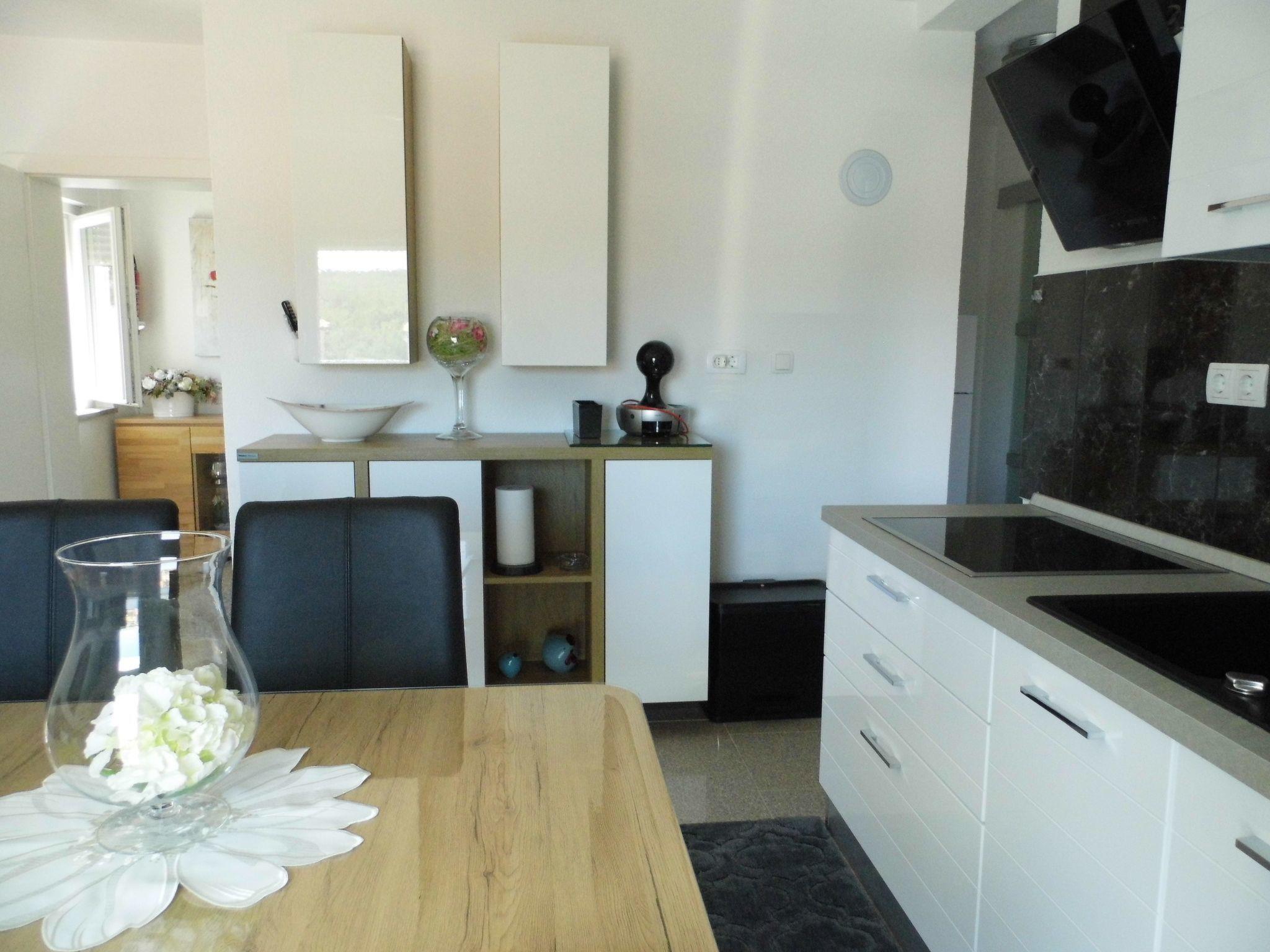 There is dinning table with chairs for all. Kitchen and dinning area are connected (same space) with living room, where is Sat Tv, air condition, sofa where can be prepared an extra bed suitable only for child till 12 years old.