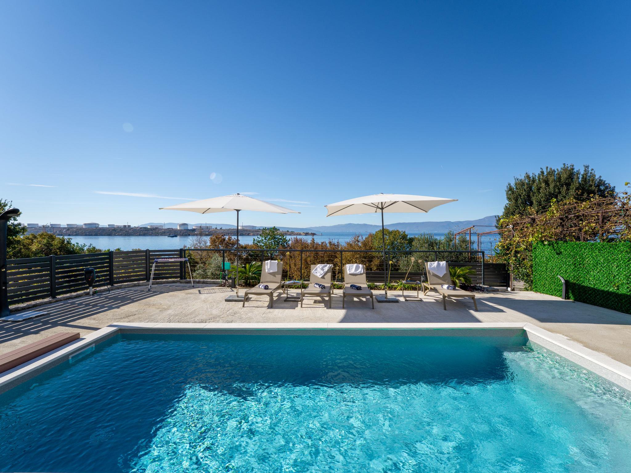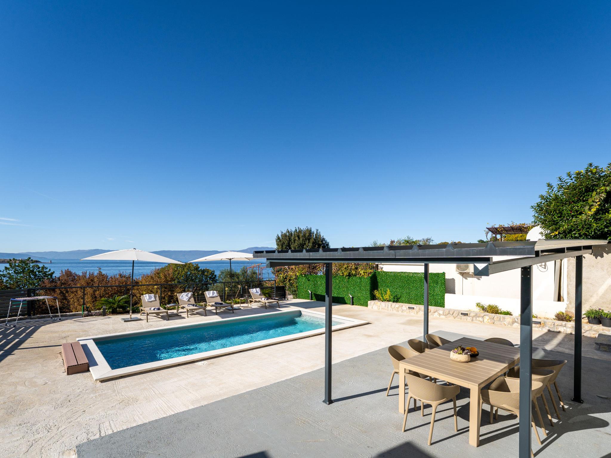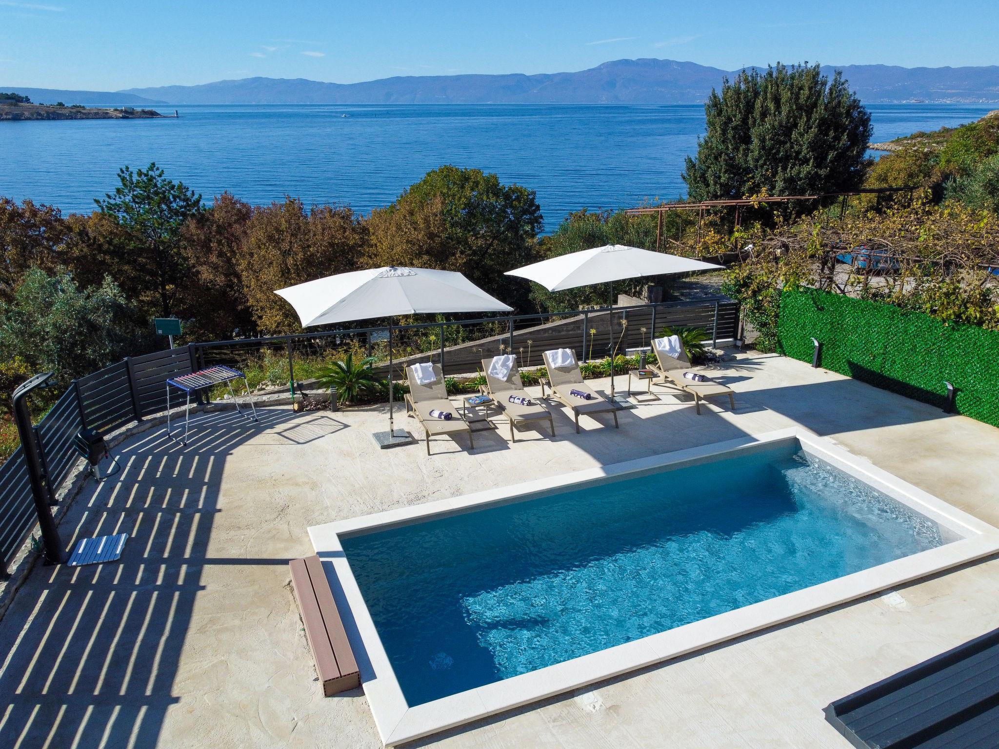 Modern, comfortable 2-family house detached in 2025. In the hamlet Mali Kijec 4.5 km from the centre of Omišalj, 10 km from the centre of Njivice, in a sunny position, 20 m from the sea, 20 m from the beach. Private: property 300 m2 (fenced), swimming pool angular, heated (3 x 7 m, depth 150 cm, seasonal availability: 15.May. - 01.Oct.) with internal staircase and salt-electrolysis pool-cleaning system. Outdoor shower, terrace (25 m2), garden furniture, barbecue, pool maintenance by the owner/gardener. In the house: WiFi. Parking (for 2 cars) at the house on the premises. Shop 100 m, supermarket 3.5 km, restaurant 4.5 km, bus stop 100 m, concrete beach 20 m. Fishing possibilities 20 m. The owner does not accept any youth groups. Please note: airfield 3.5 km from the property.
