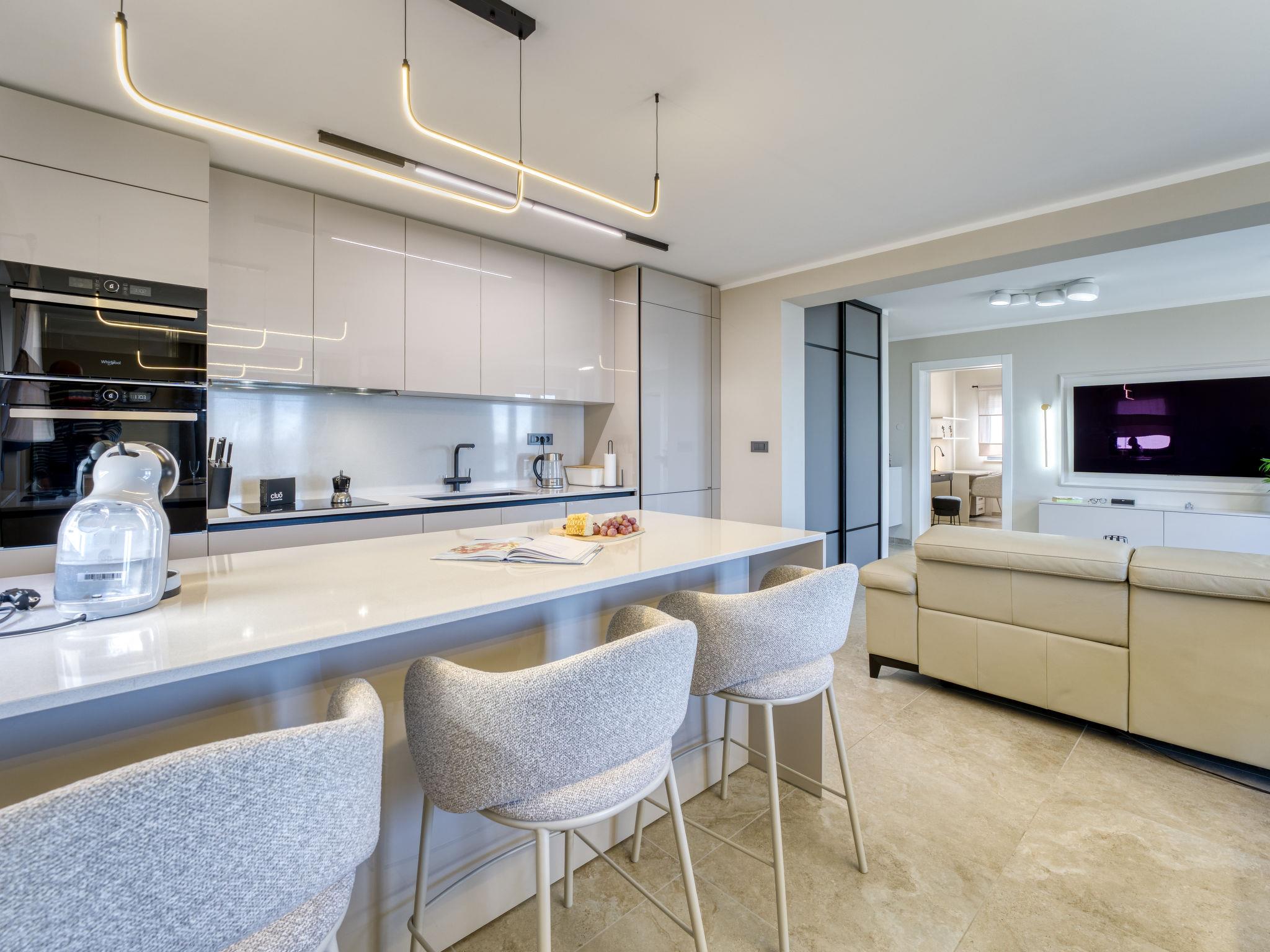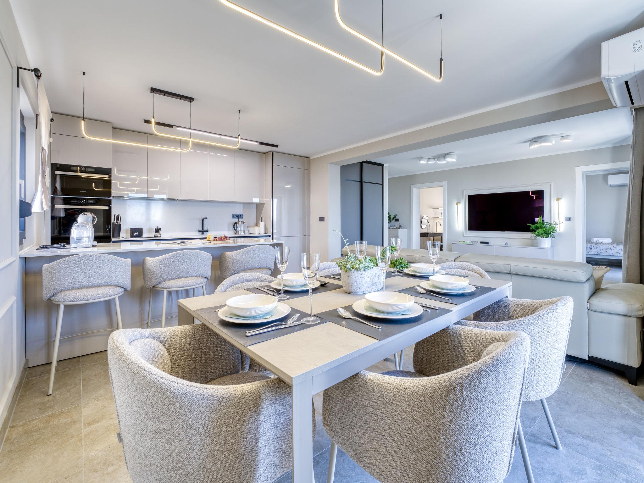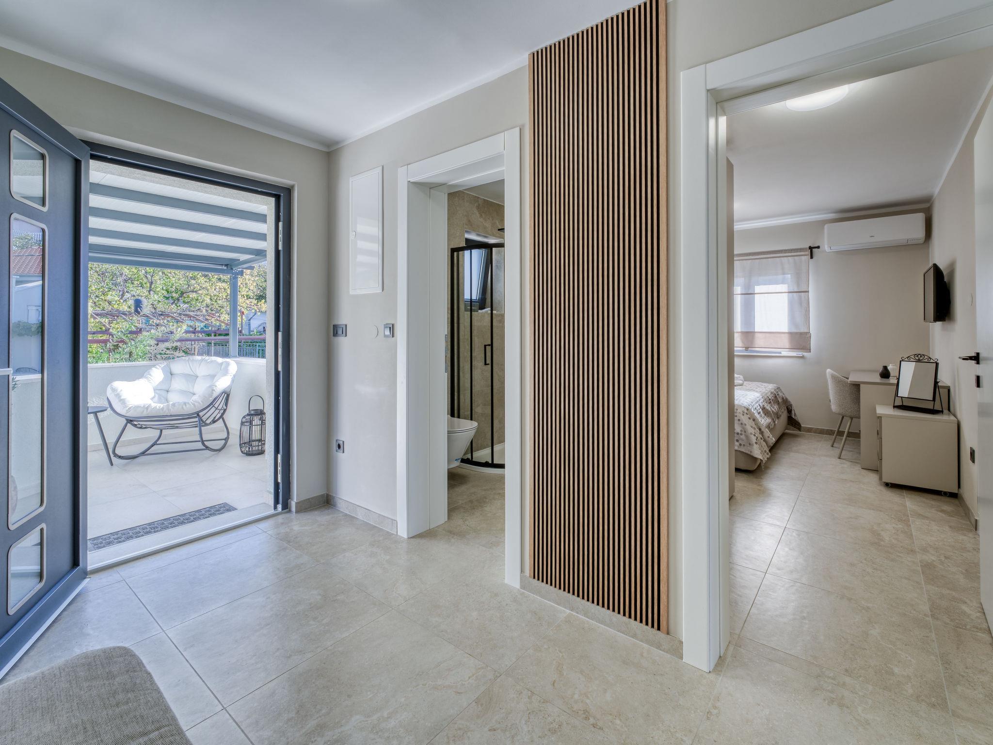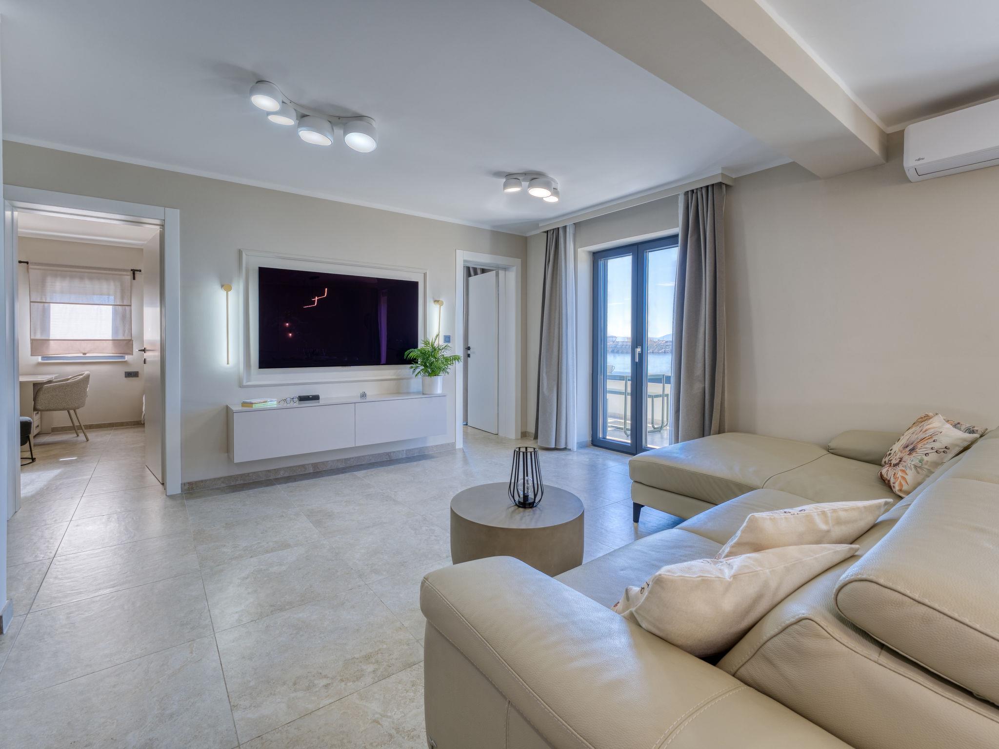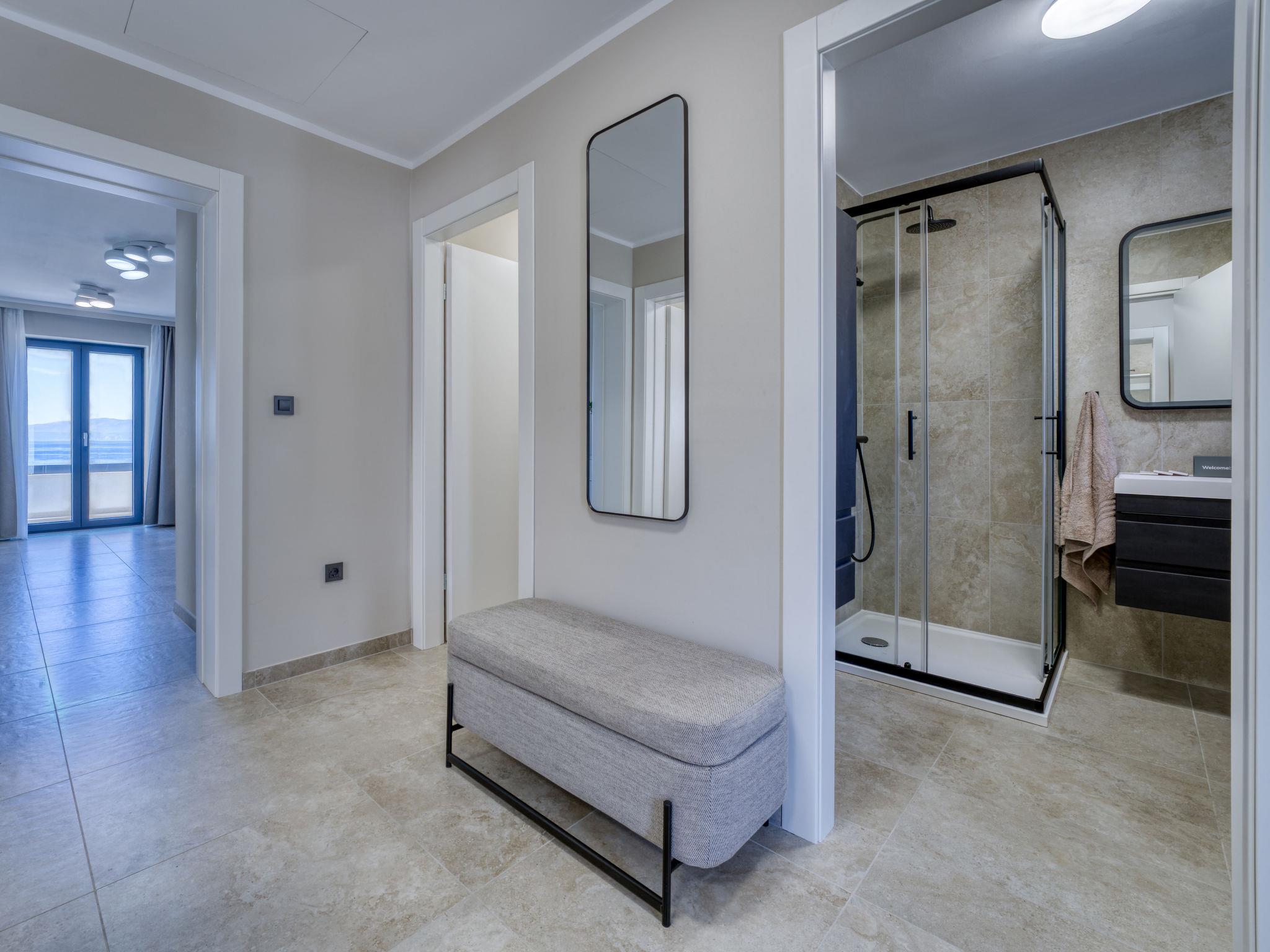 "Lamar", 5-room apartment 100 m2, on the upper floor. Spacious and bright, renovated in 2025, modern and tasteful furnishings: living/dining room with cable TV. Exit to the balcony. 1 room with 1 french bed (180 cm, length 200 cm), cable TV and air conditioning. 1 room with 1 french bed (160 cm, length 200 cm), cable TV and air conditioning. Exit to the balcony. 1 room with 1 bed (90 cm, length 200 cm), cable TV and air conditioning. 1 room with 1 bed (80 cm, length 200 cm). Open kitchen (oven, dishwasher, 4 induction hot plates, toaster, kettle, freezer). 2 showers/WC. Forced-air heating. Balcony 15 m2. Balcony furniture. Marvellous view of the sea. Facilities: washing machine, children's high chair, baby cot, hair dryer. Internet (WiFi, free). Please note: suitable for families. Non-smoking house. Fire extinguisher.
