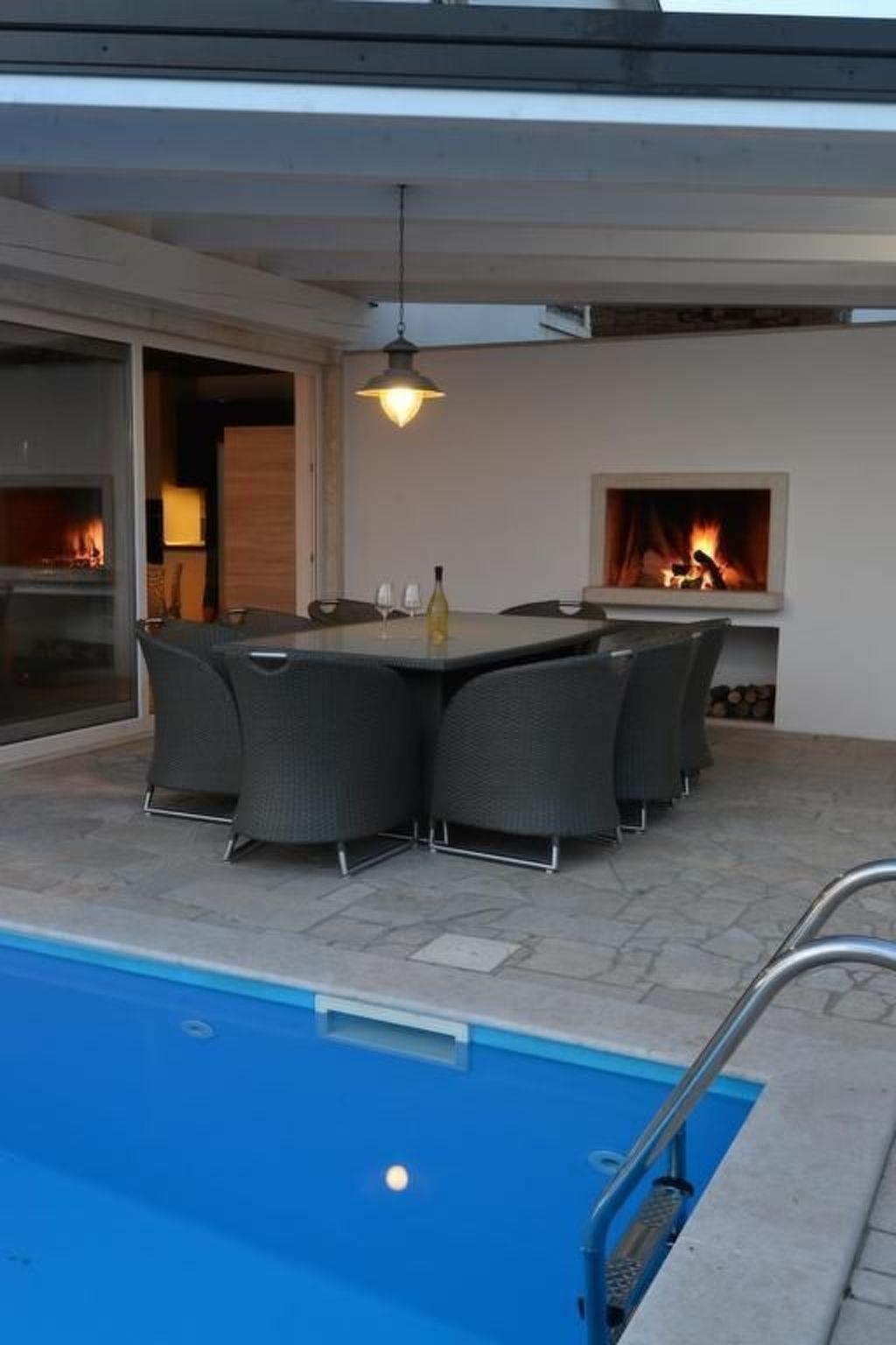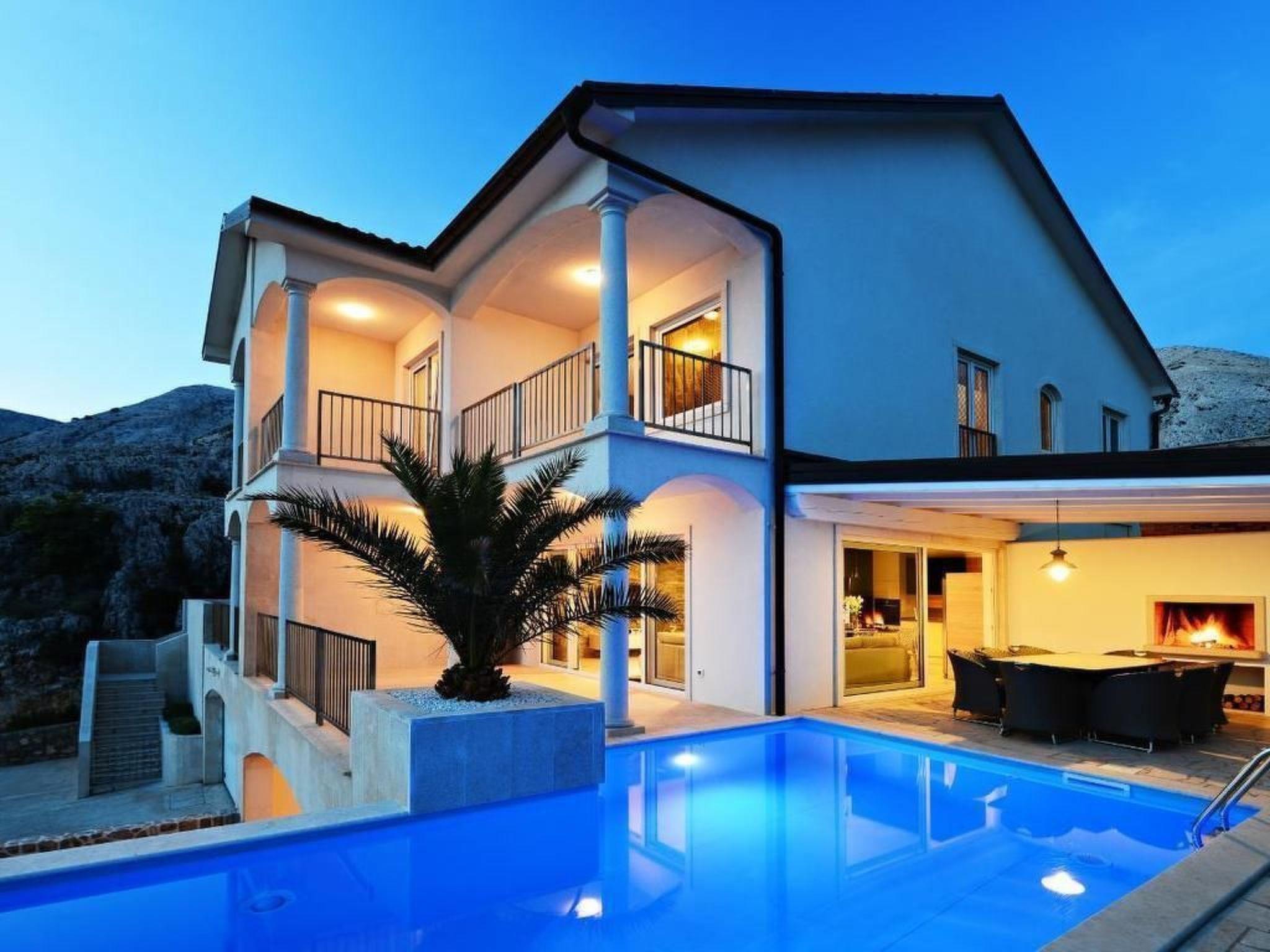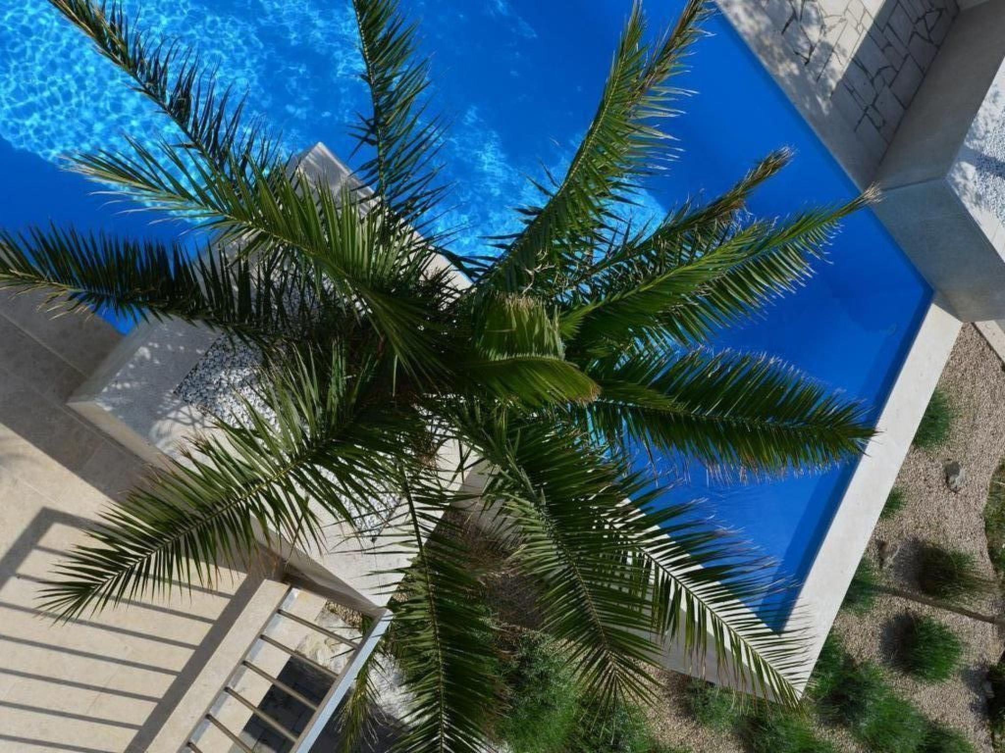 The exterior of Villa Mar is just as impressive as its interior. The villa features three large terraces, offering privacy and relaxation for every guest. The main attraction is undoubtedly the private swimming pool, located under a palm tree, providing a refreshing oasis during the day. As the sun sets, the terrace becomes the ideal spot to admire the breathtaking sunsets between the islands of Krk and Cres, adding a touch of magic to every evening.
