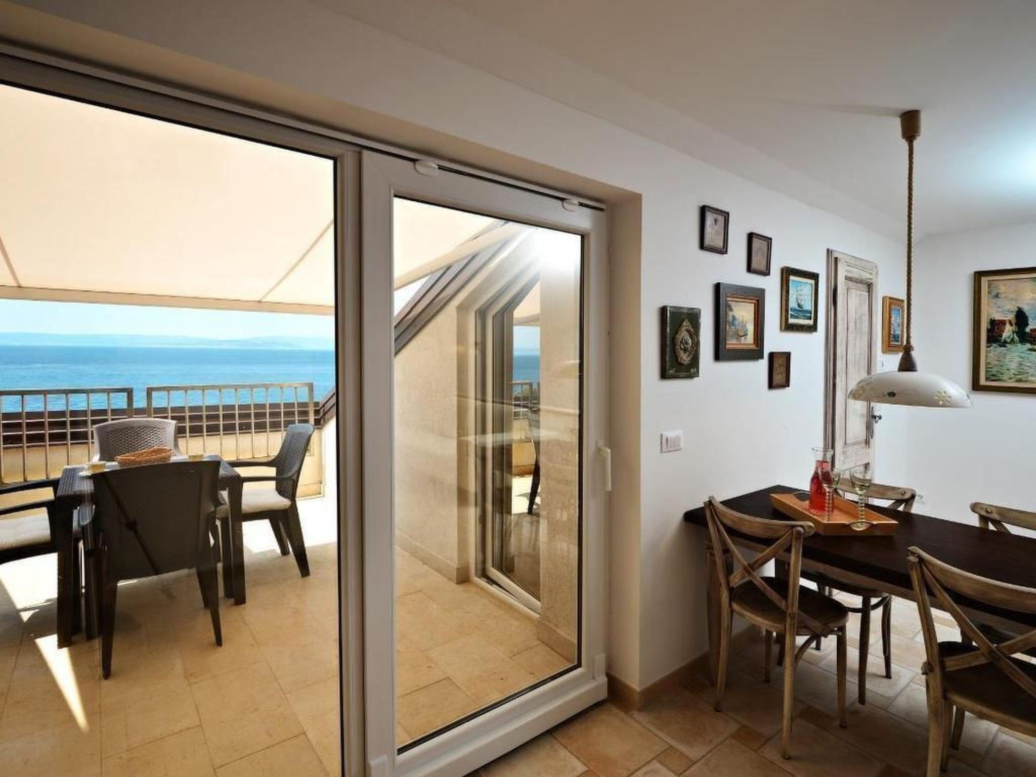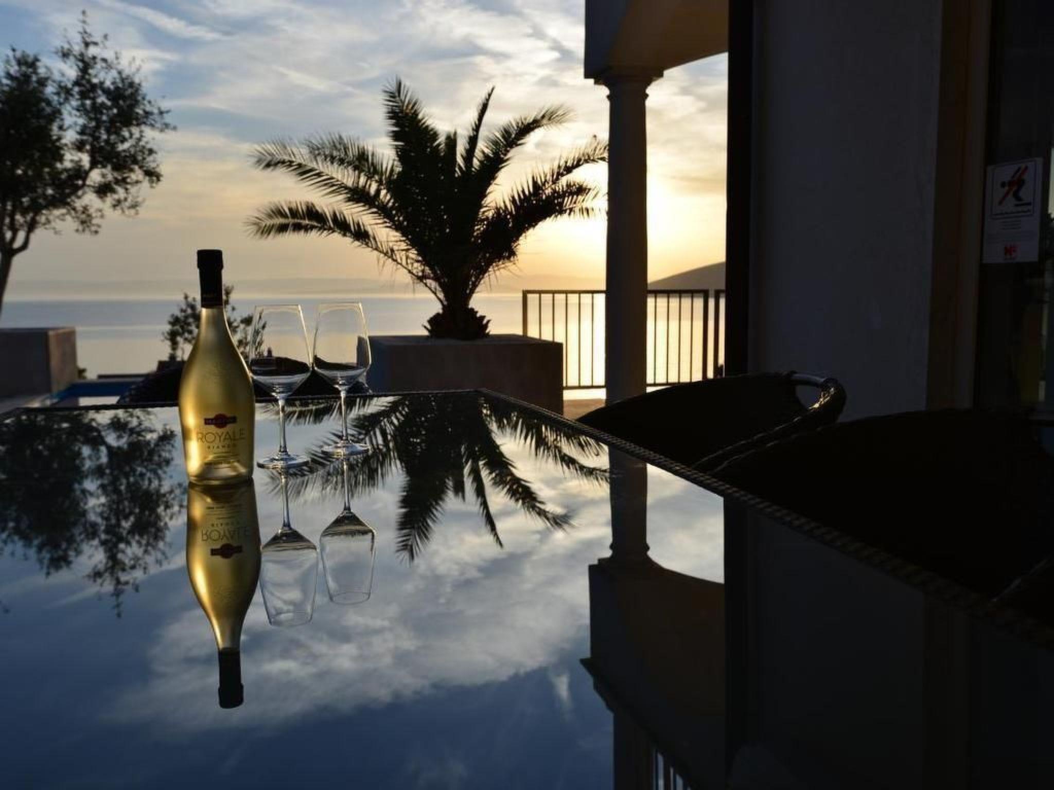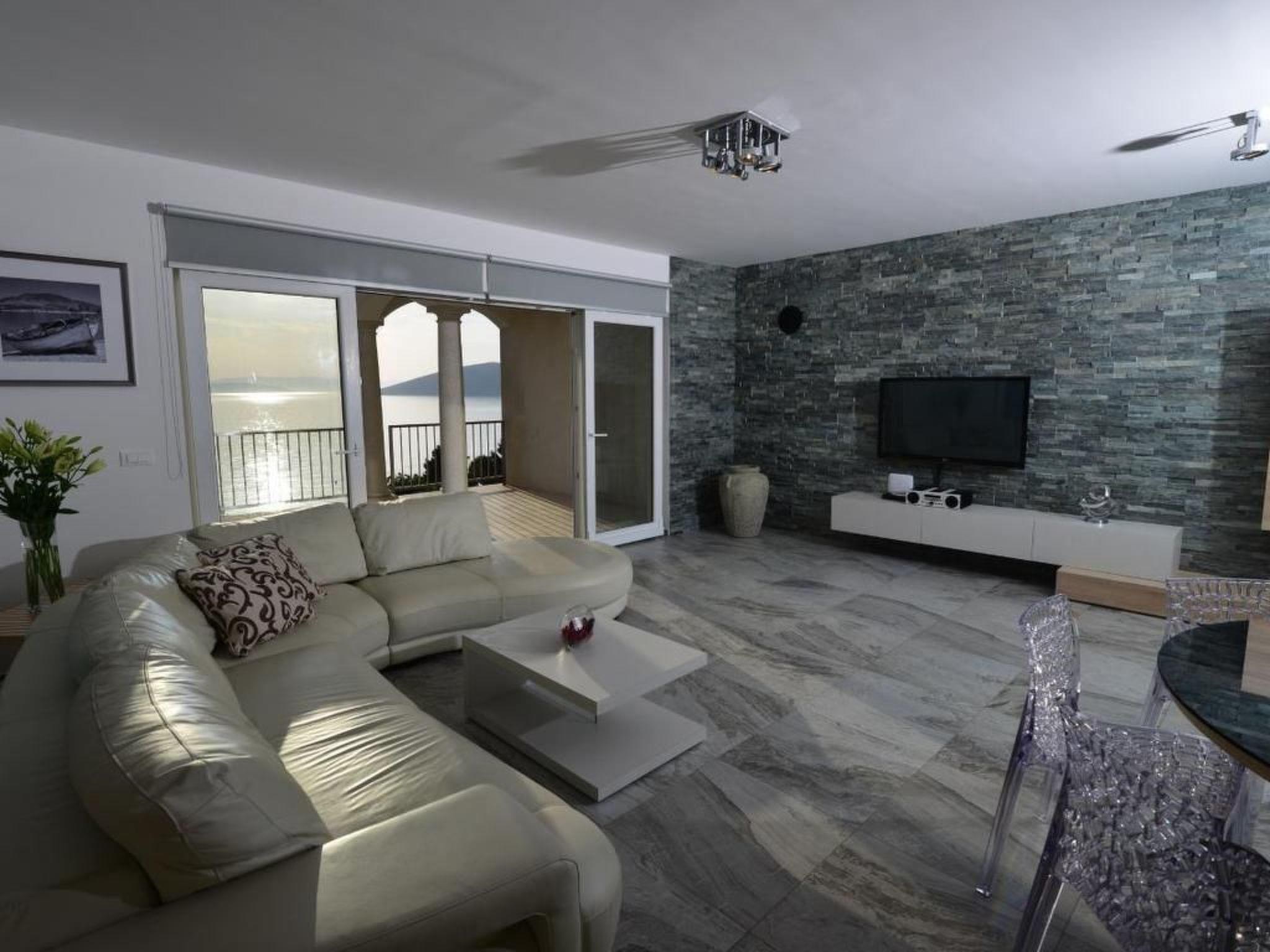 The exterior of Villa Mar is just as impressive as its interior. The villa features three large terraces, offering privacy and relaxation for every guest. The main attraction is undoubtedly the private swimming pool, located under a palm tree, providing a refreshing oasis during the day. As the sun sets, the terrace becomes the ideal spot to admire the breathtaking sunsets between the islands of Krk and Cres, adding a touch of magic to every evening.