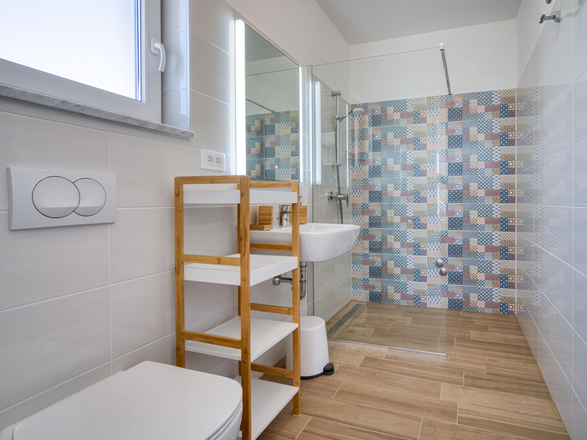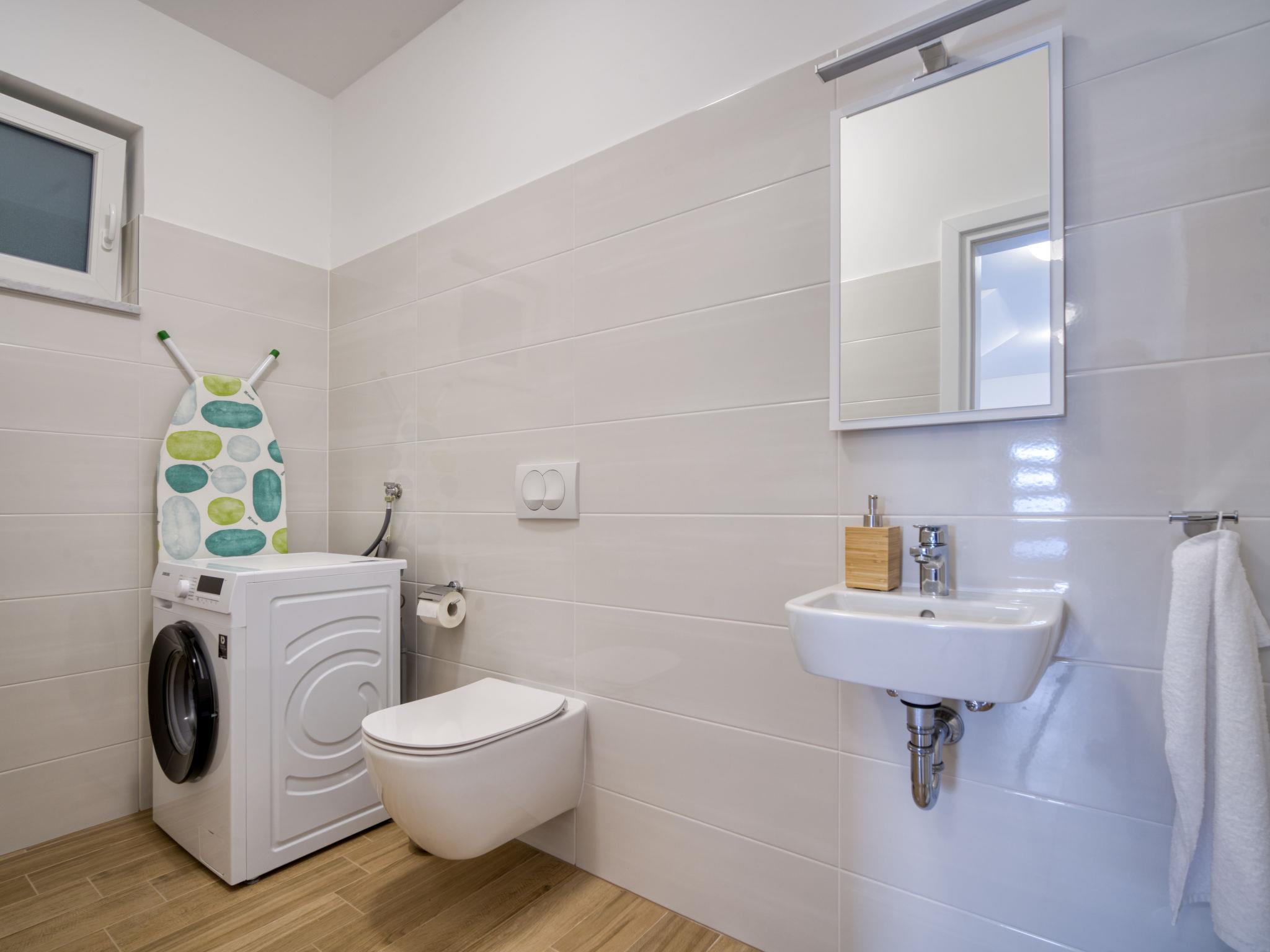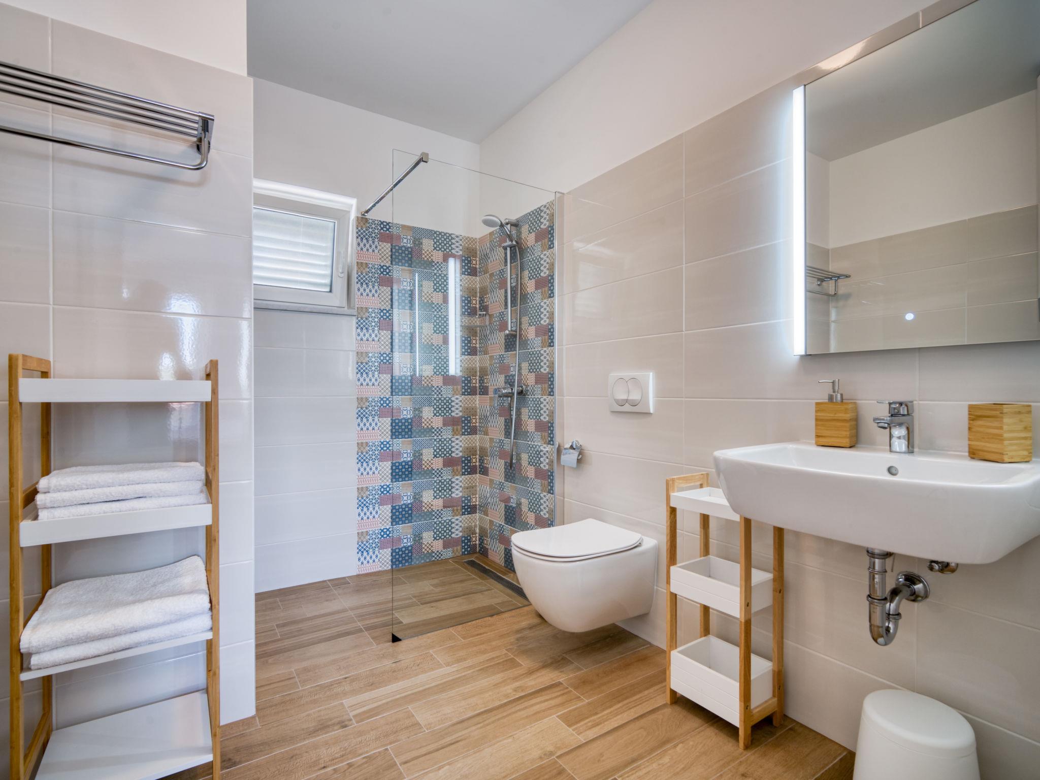 Semi-detached house "Villa Vali 2", 2 storeys, built in 2022. 300 m from the centre of Vrbnik, in a sunny, elevated position, 70 m from the sea, 70 m from the beach, in a cul-de-sac. Private: property 300 m2 (fenced), swimming pool angular (5 x 4 m, depth 140 cm, seasonal availability: 01.May. - 15.Oct.) with salt-electrolysis pool-cleaning system. Outdoor shower. In the house: internet access, washing machine. Shop 400 m, restaurant 70 m, bus stop 750 m, pebble beach, rocky beach, concrete beach 70 m.