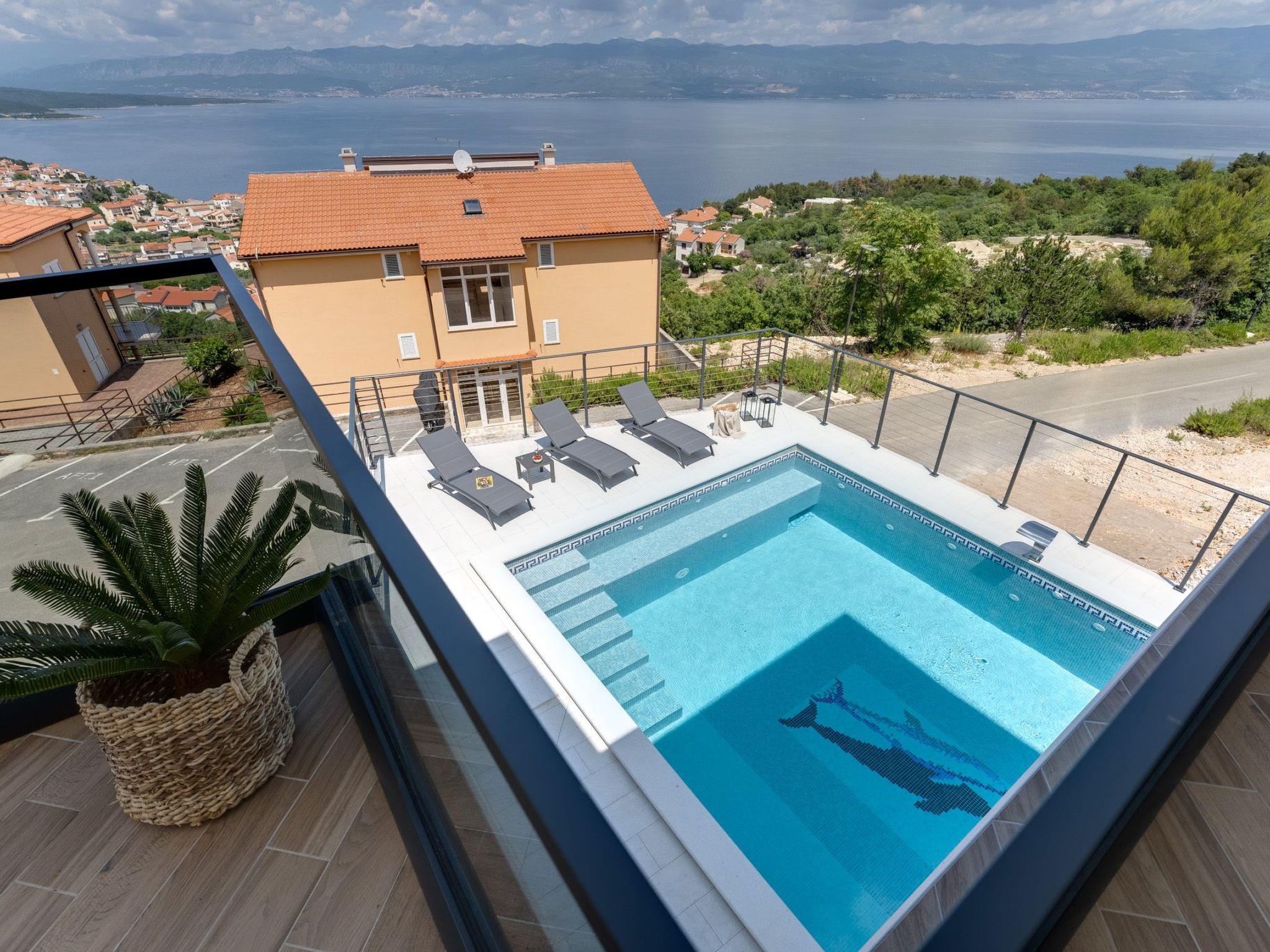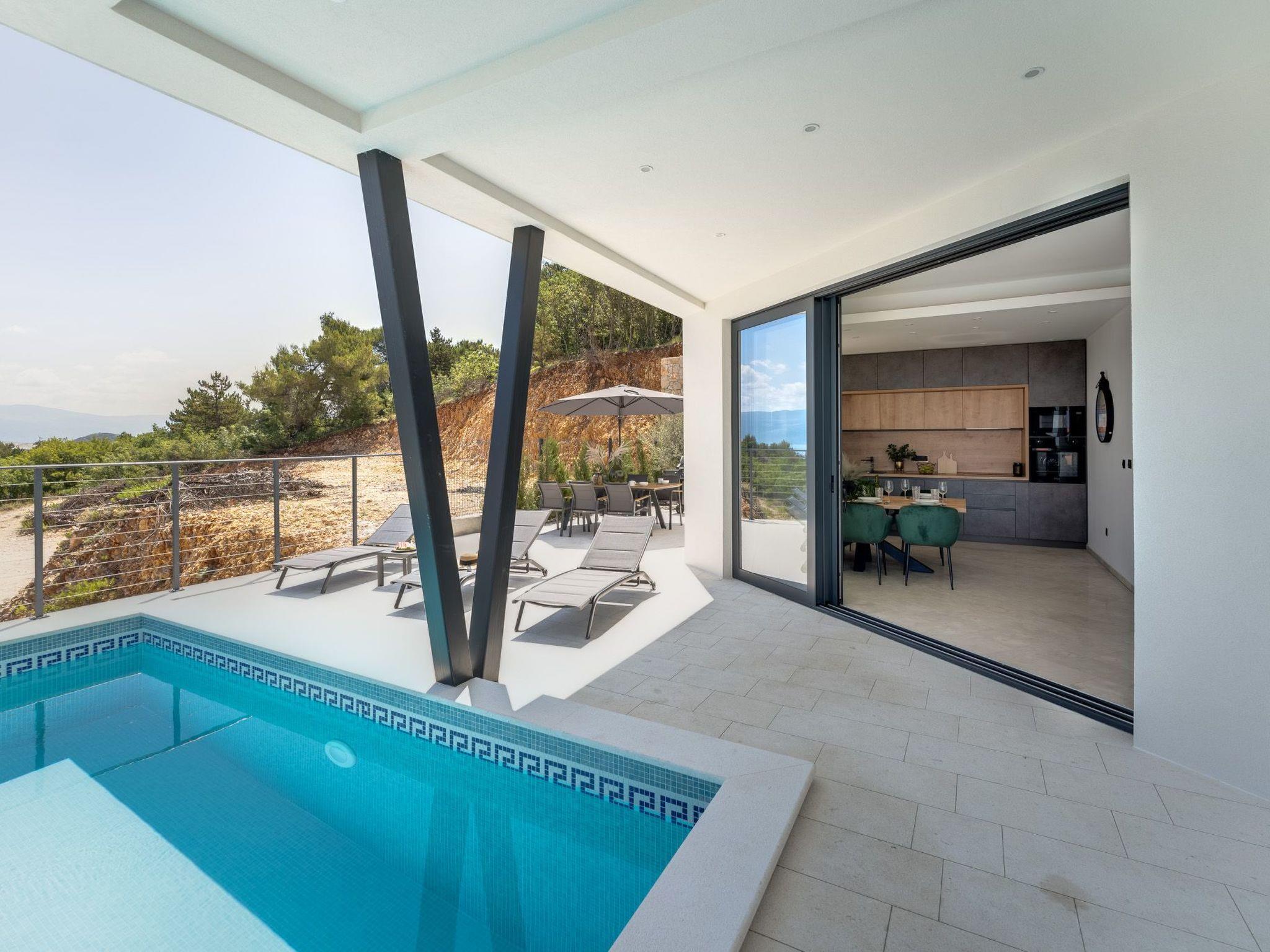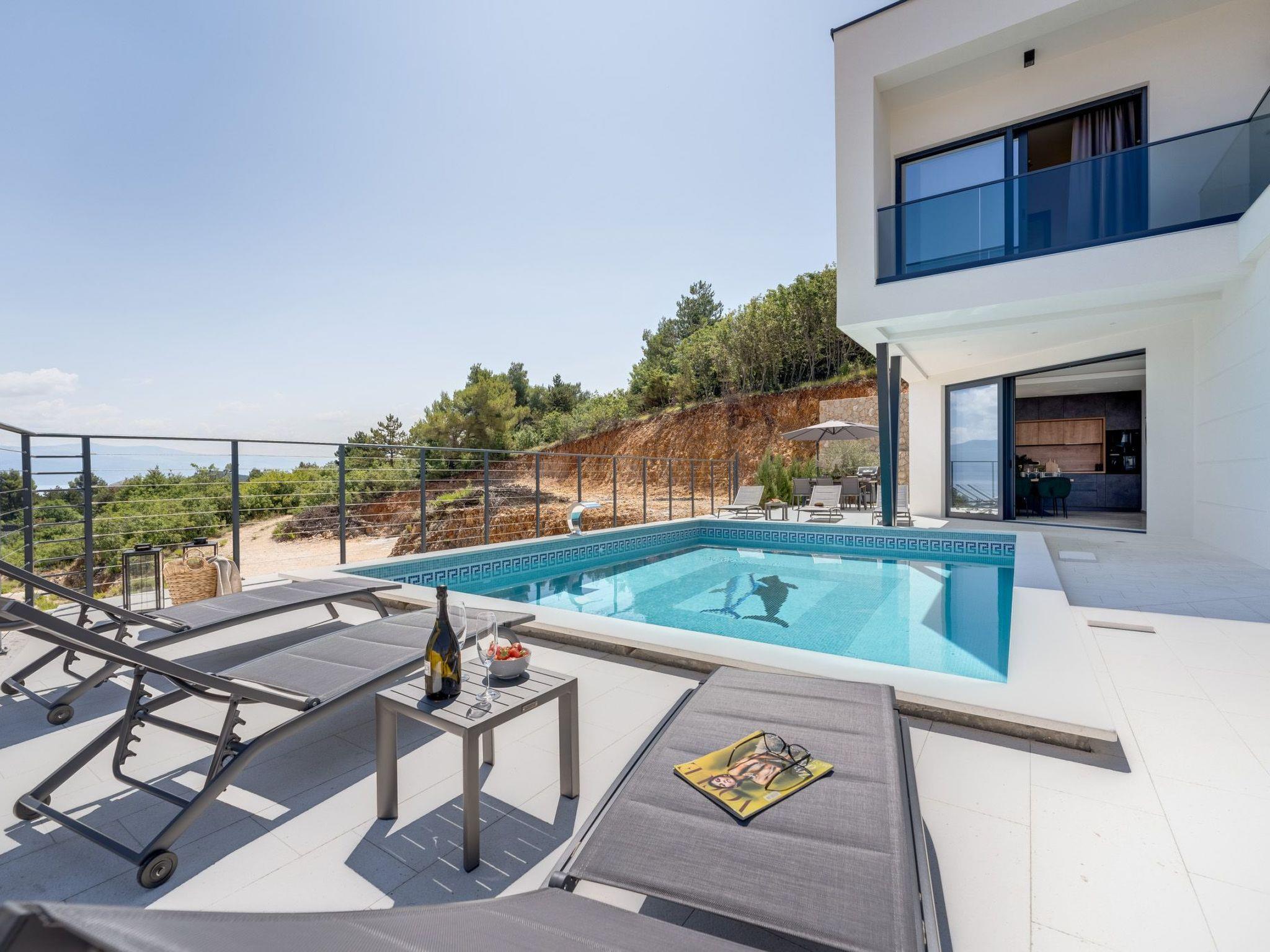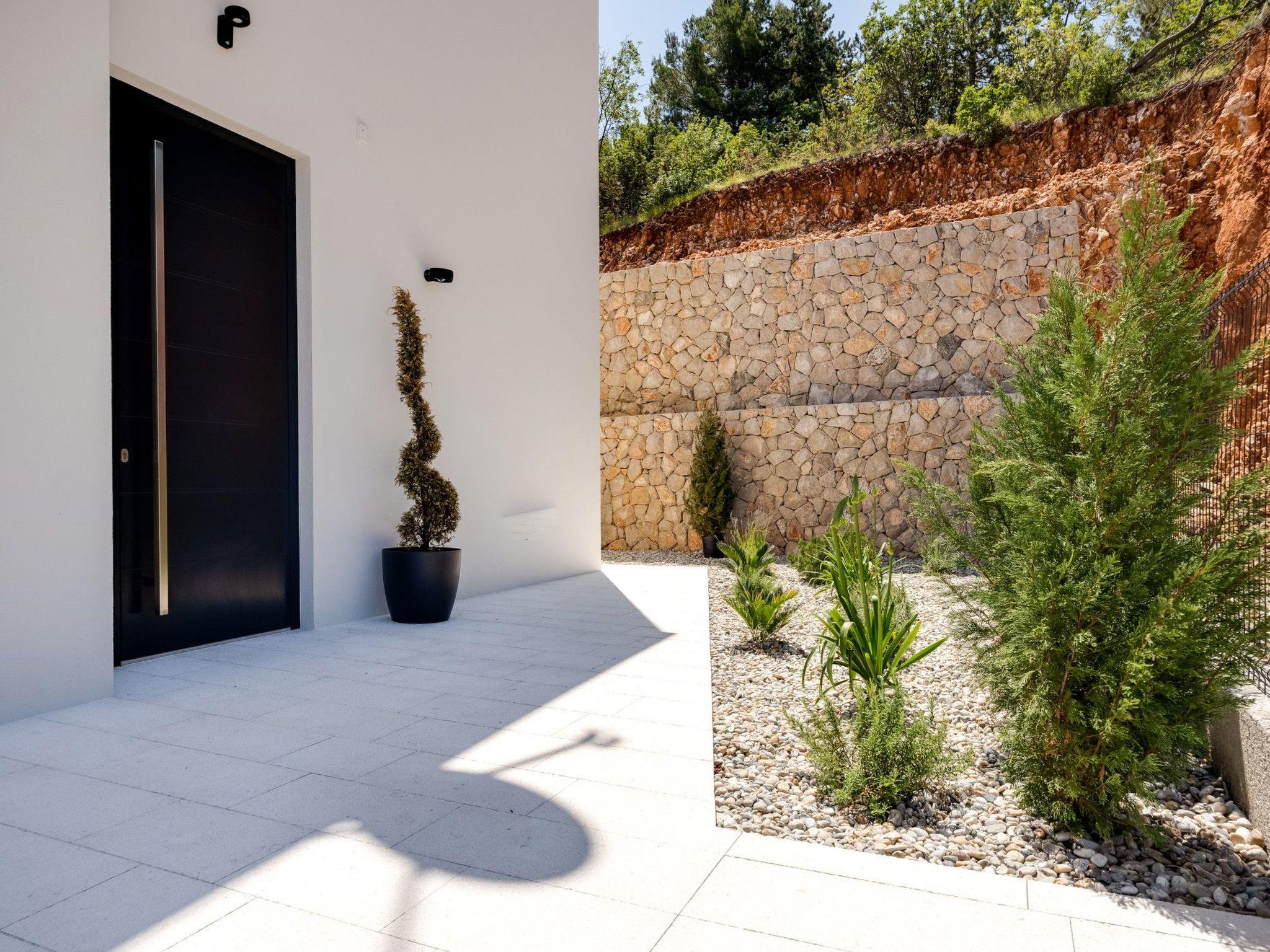 This brand new luxury villa is located on a hill above the romantic town of Vrbnik with spectacular panoramic sea views. The villa has 3 bedrooms and 4 bathrooms. On the ground floor of the villa, which is completely paved with the famous stone of the island of Brac (as is the whole area around the villa), there is a spacious living room, a kitchen with all appliances and a bathroom with a shower. From the living room, guests have direct access to the pool, which offers an unobstructed view of the sea and the greenery. The pool is 38 m2, has massage benches and a waterfall. Around the pool on the terrace there are sun loungers, a seating set with a large parasol, a grill and an outdoor shower. On the first floor of the villa there are three bedrooms, each with its own bathroom. Two rooms have their own large terrace and from all rooms you can enjoy the view of the sea and the old town of Vrbnik when you wake up in the morning. The villa is fully air-conditioned, has free WiFi, two parking spaces and is completely fenced. The nearest beach is 800 m from the villa, shops and restaurants are 500 m away.