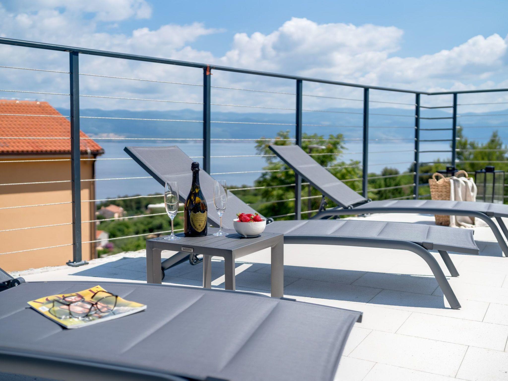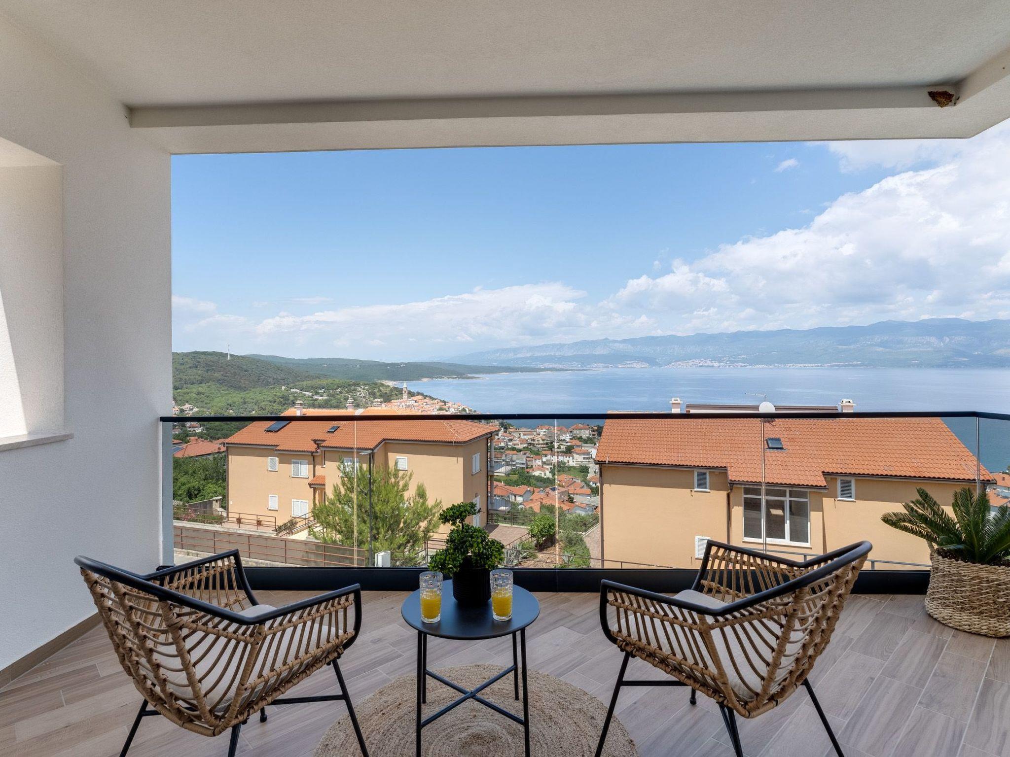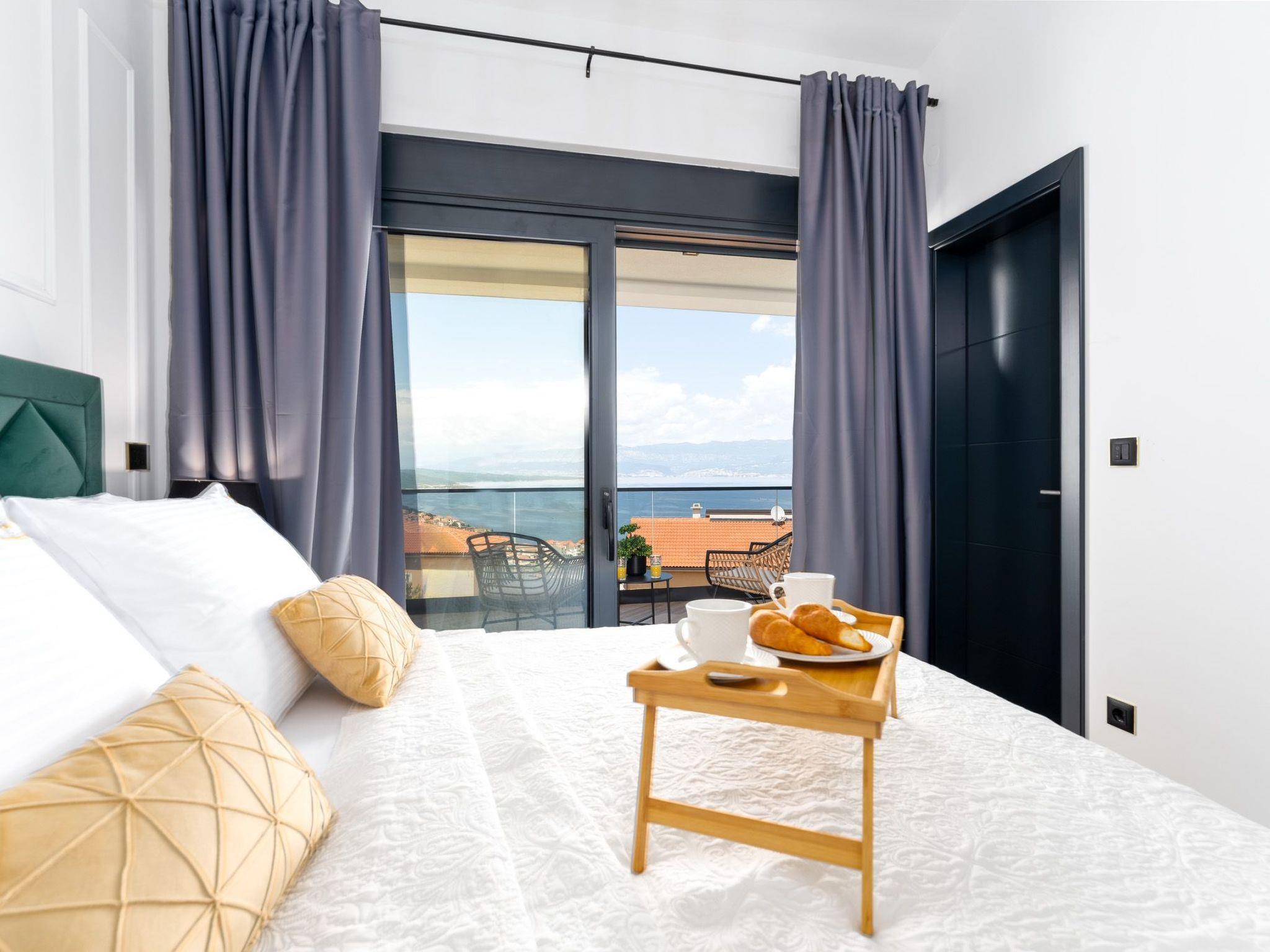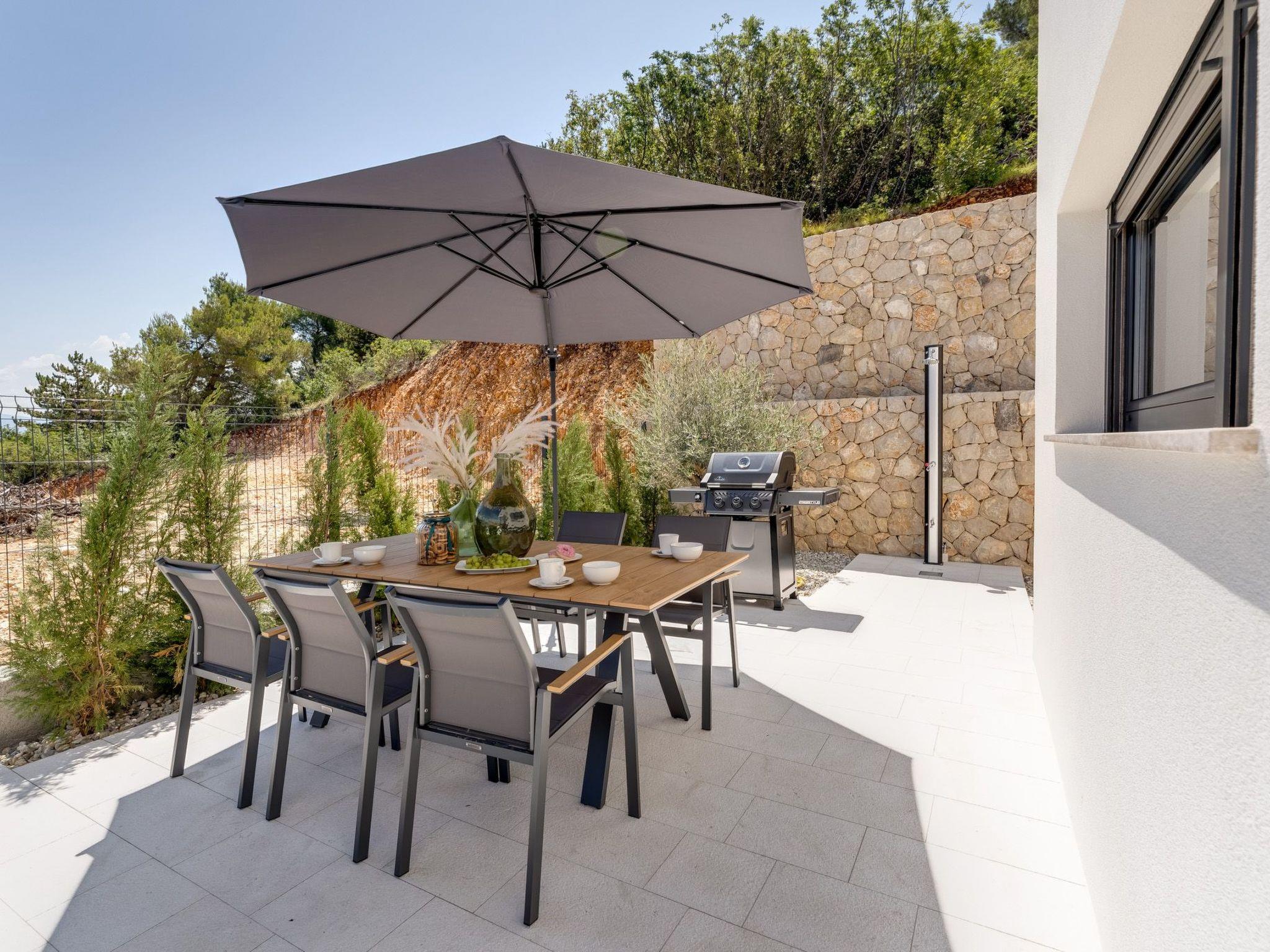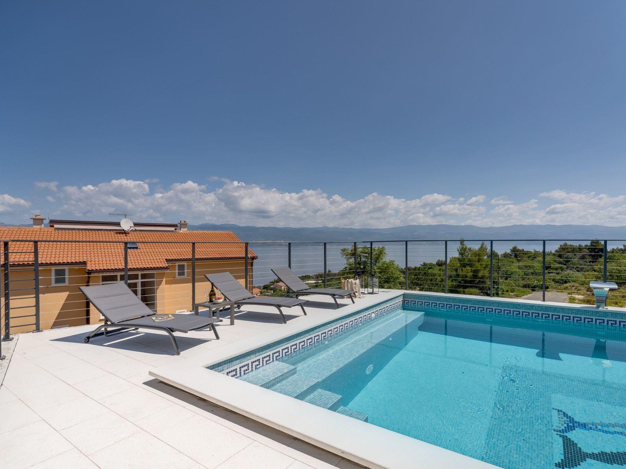 This brand new luxury villa is located on a hill above the romantic town of Vrbnik with spectacular panoramic sea views. The villa has 3 bedrooms and 4 bathrooms. On the ground floor of the villa, which is completely paved with the famous stone of the island of Brac (as is the whole area around the villa), there is a spacious living room, a kitchen with all appliances and a bathroom with a shower. From the living room, guests have direct access to the pool, which offers an unobstructed view of the sea and the greenery. The pool is 38 m2, has massage benches and a waterfall. Around the pool on the terrace there are sun loungers, a seating set with a large parasol, a grill and an outdoor shower. On the first floor of the villa there are three bedrooms, each with its own bathroom. Two rooms have their own large terrace and from all rooms you can enjoy the view of the sea and the old town of Vrbnik when you wake up in the morning. The villa is fully air-conditioned, has free WiFi, two parking spaces and is completely fenced. The nearest beach is 800 m from the villa, shops and restaurants are 500 m away.