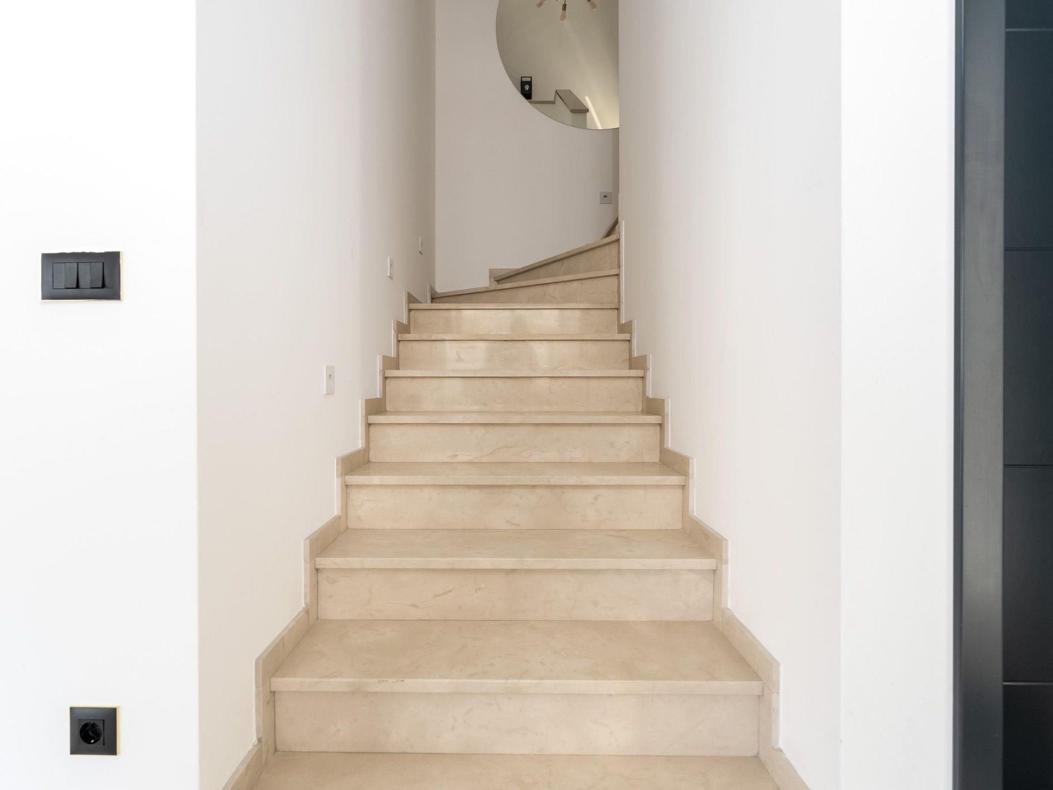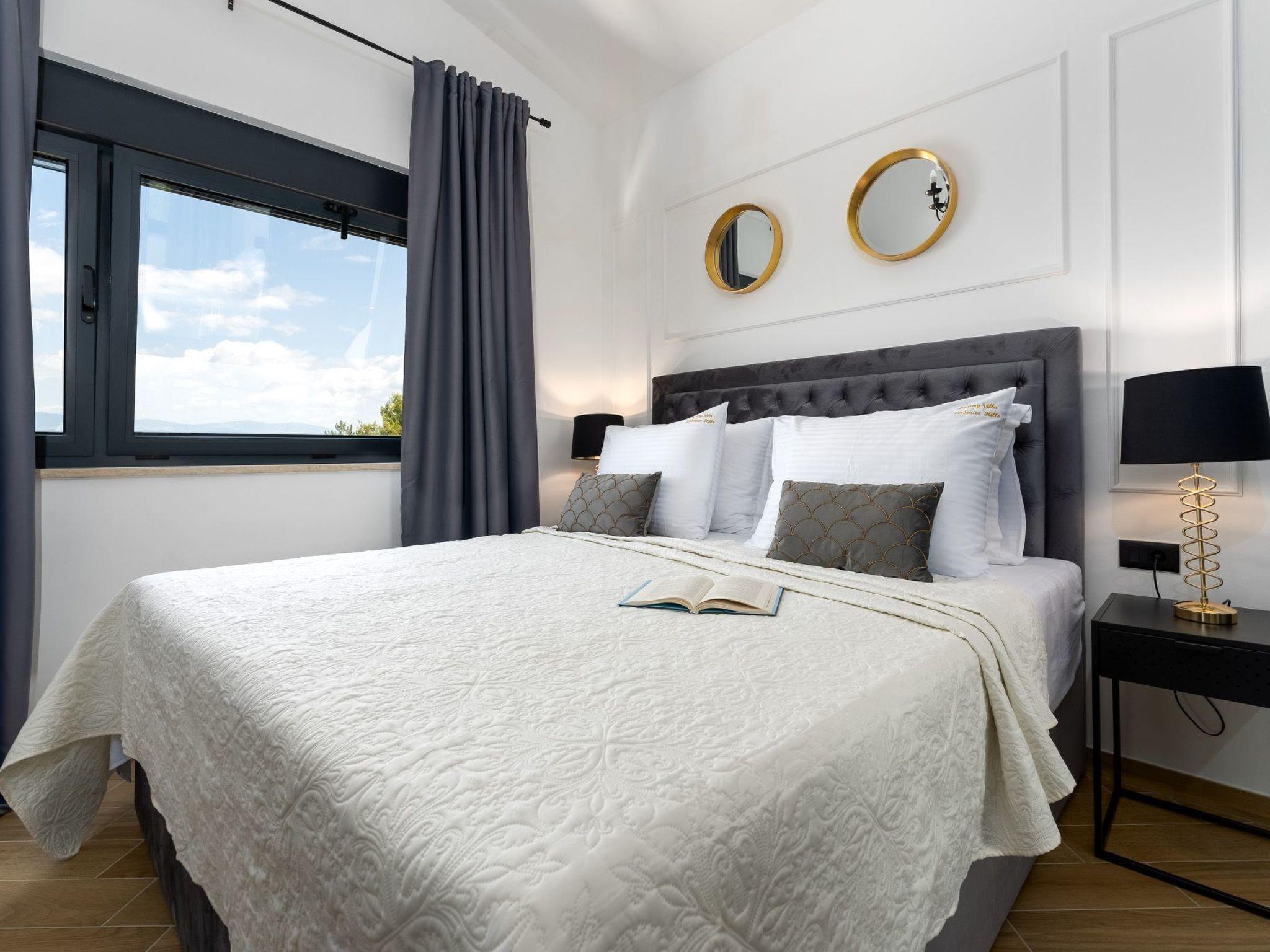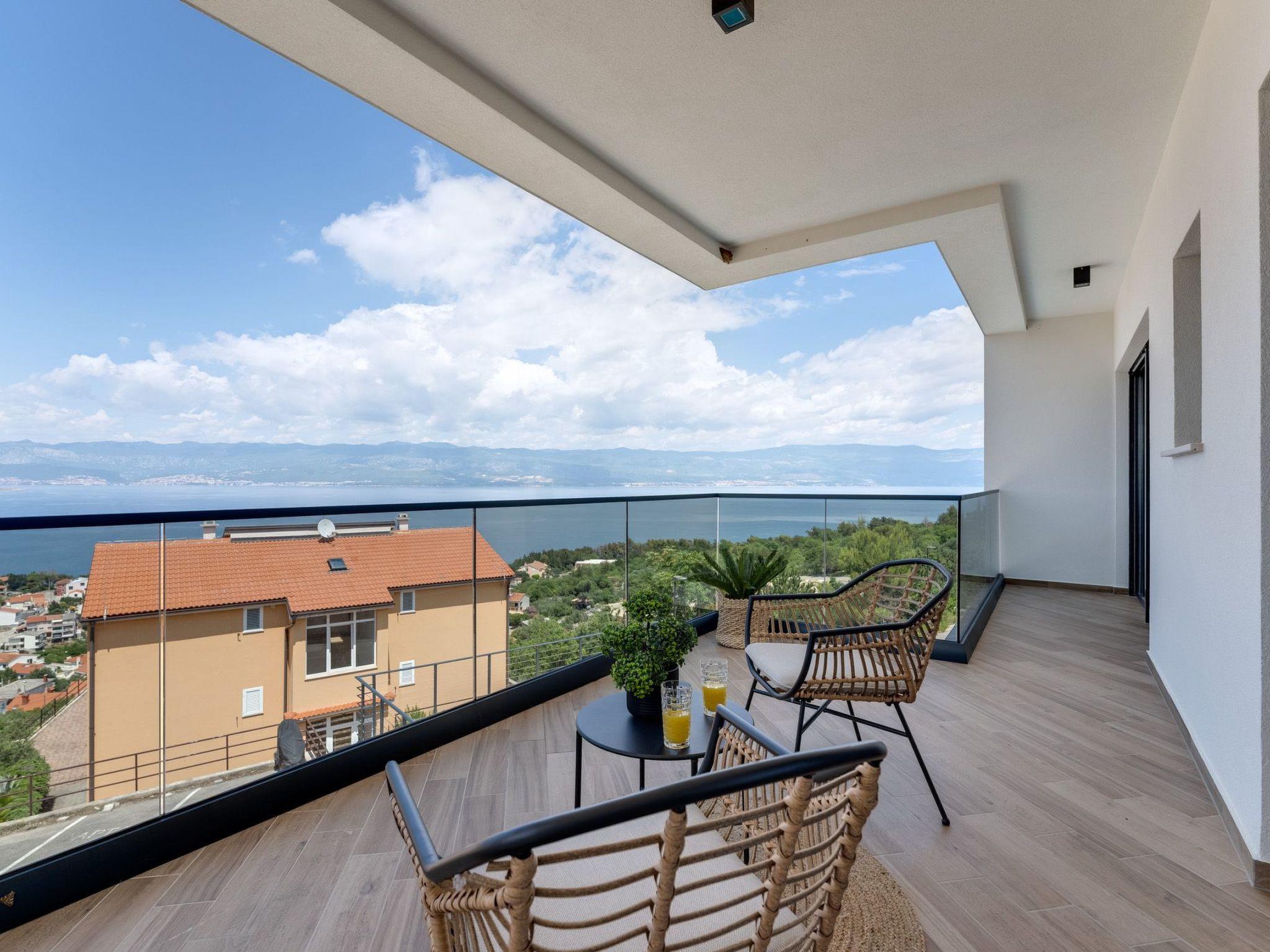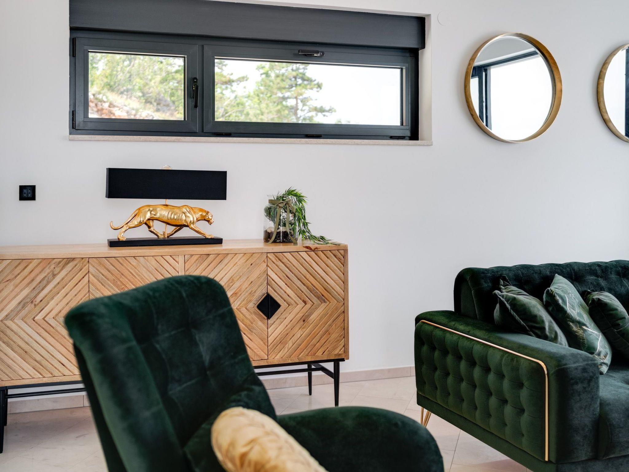 This brand new luxury villa is located on a hill above the romantic town of Vrbnik with spectacular panoramic sea views. The villa has 3 bedrooms and 4 bathrooms. On the ground floor of the villa, which is completely paved with the famous stone of the island of Brac (as is the whole area around the villa), there is a spacious living room, a kitchen with all appliances and a bathroom with a shower. From the living room, guests have direct access to the pool, which offers an unobstructed view of the sea and the greenery. The pool is 38 m2, has massage benches and a waterfall. Around the pool on the terrace there are sun loungers, a seating set with a large parasol, a grill and an outdoor shower. On the first floor of the villa there are three bedrooms, each with its own bathroom. Two rooms have their own large terrace and from all rooms you can enjoy the view of the sea and the old town of Vrbnik when you wake up in the morning. The villa is fully air-conditioned, has free WiFi, two parking spaces and is completely fenced. The nearest beach is 800 m from the villa, shops and restaurants are 500 m away.
