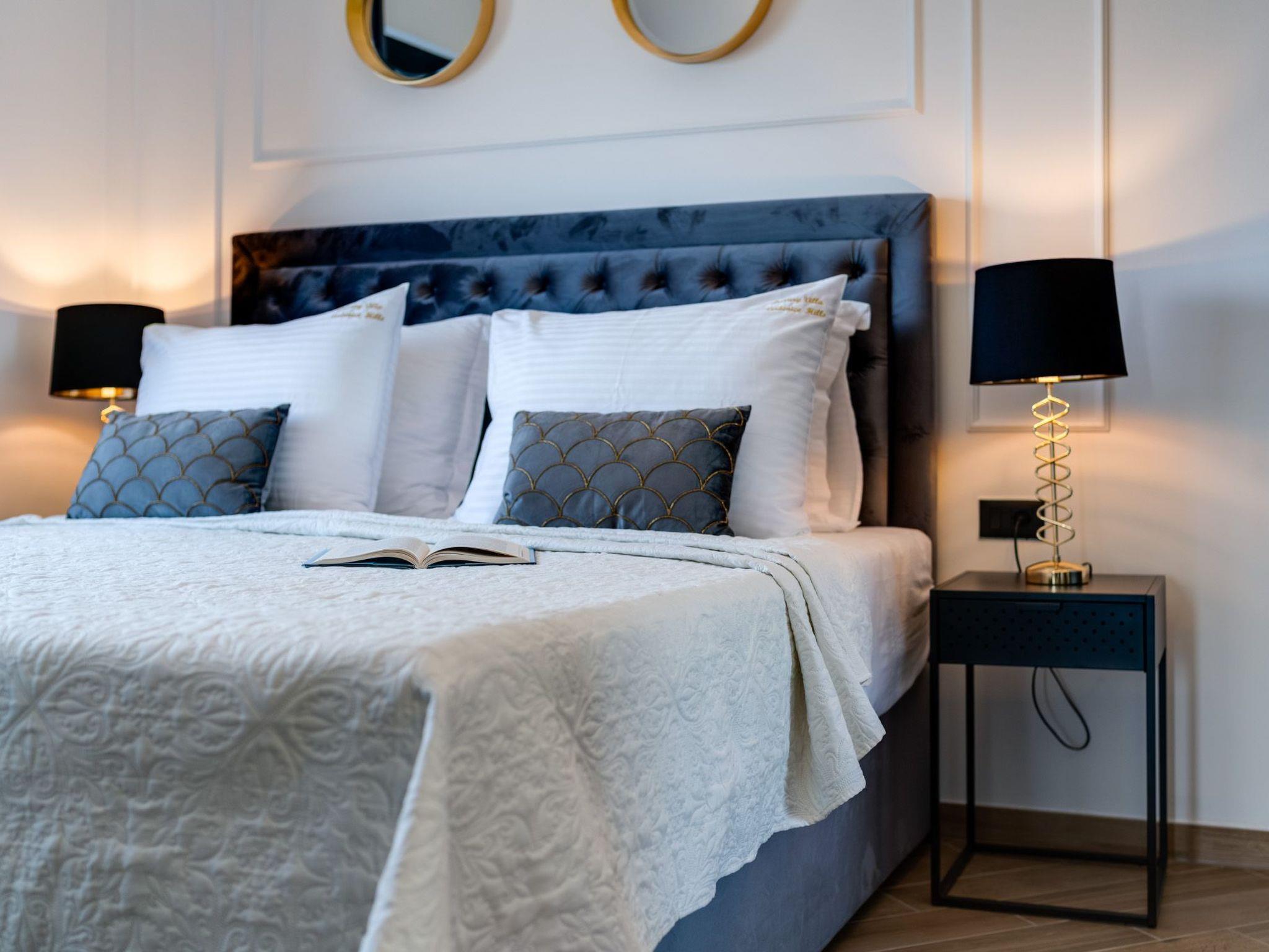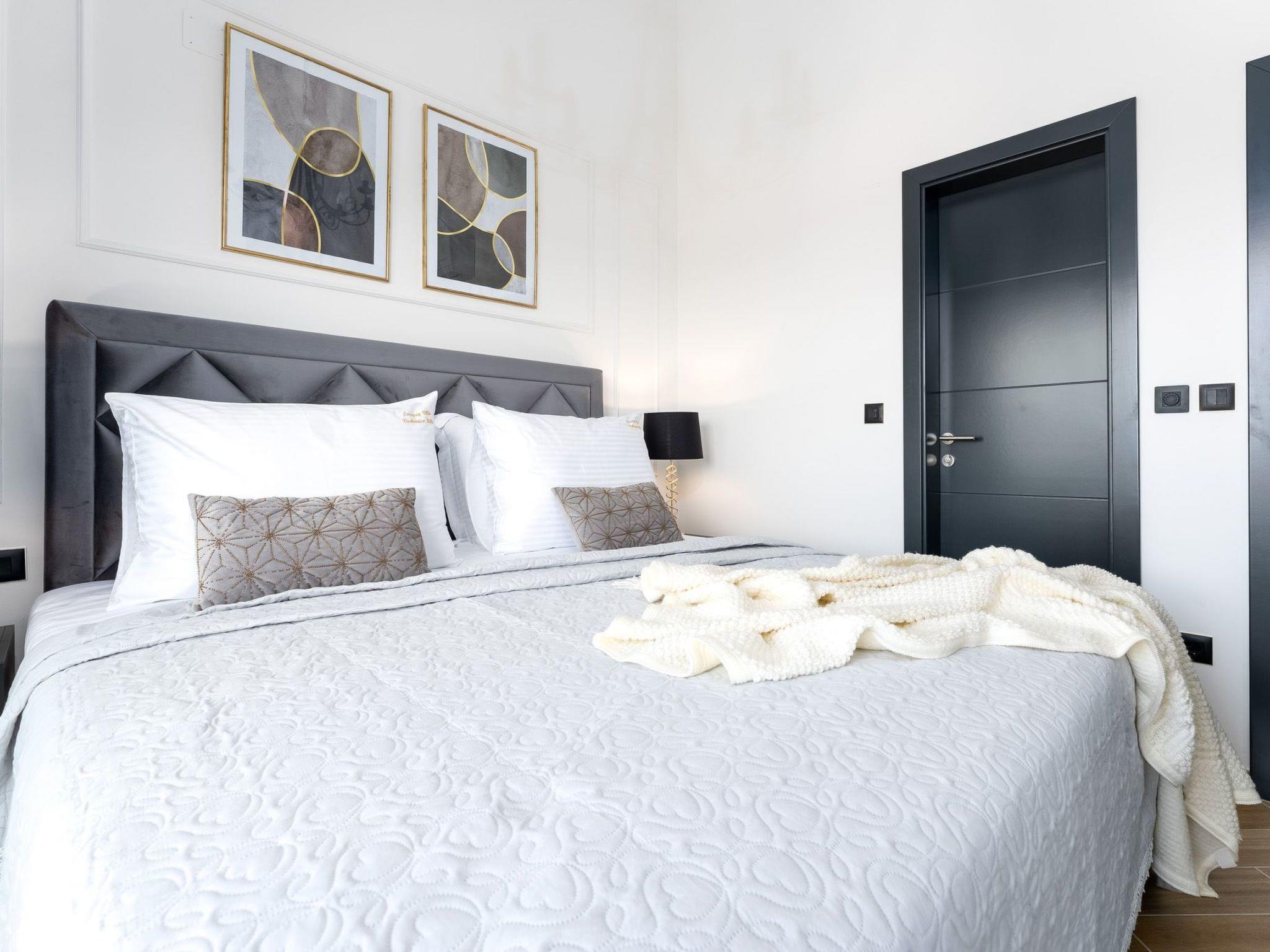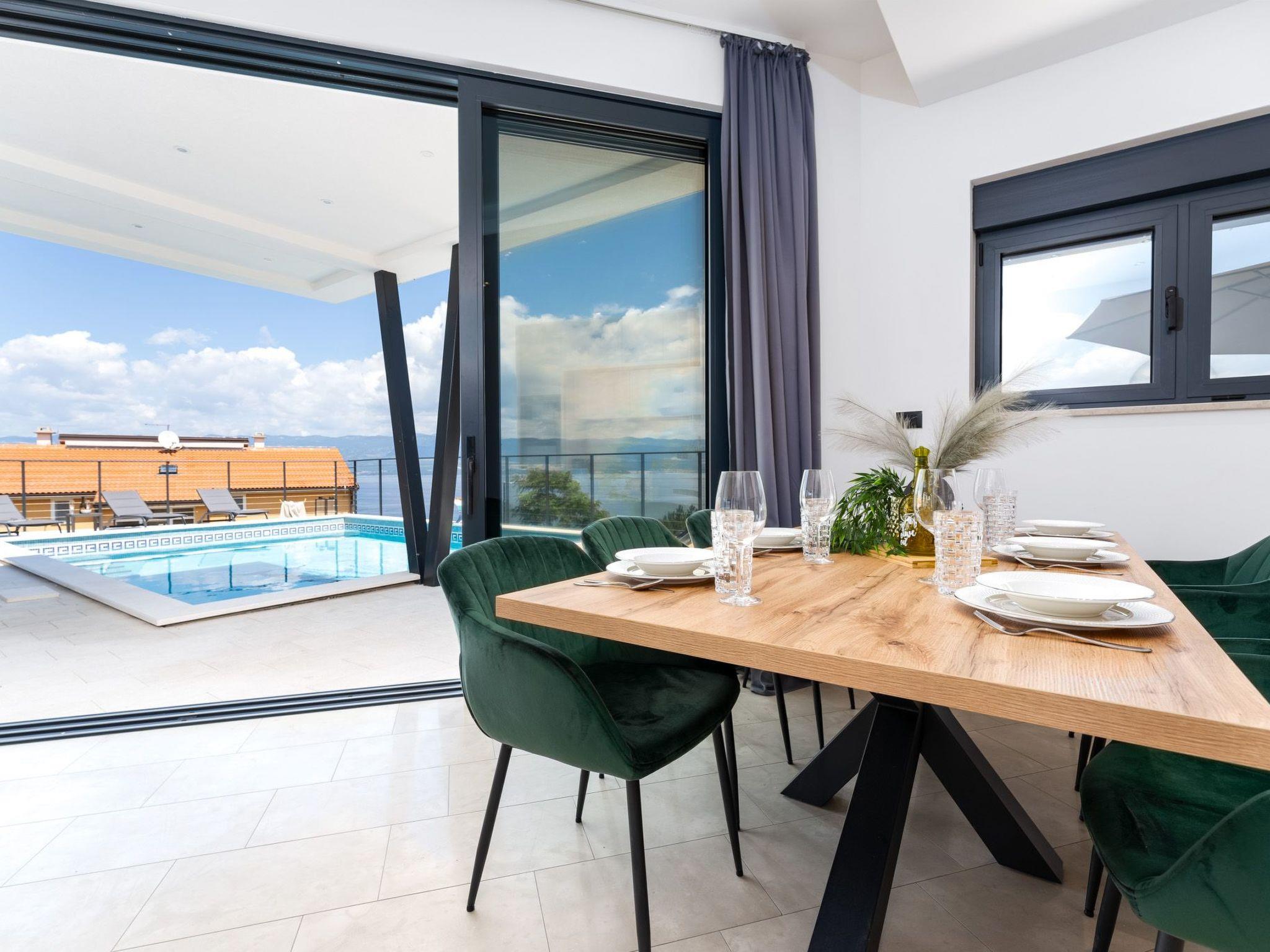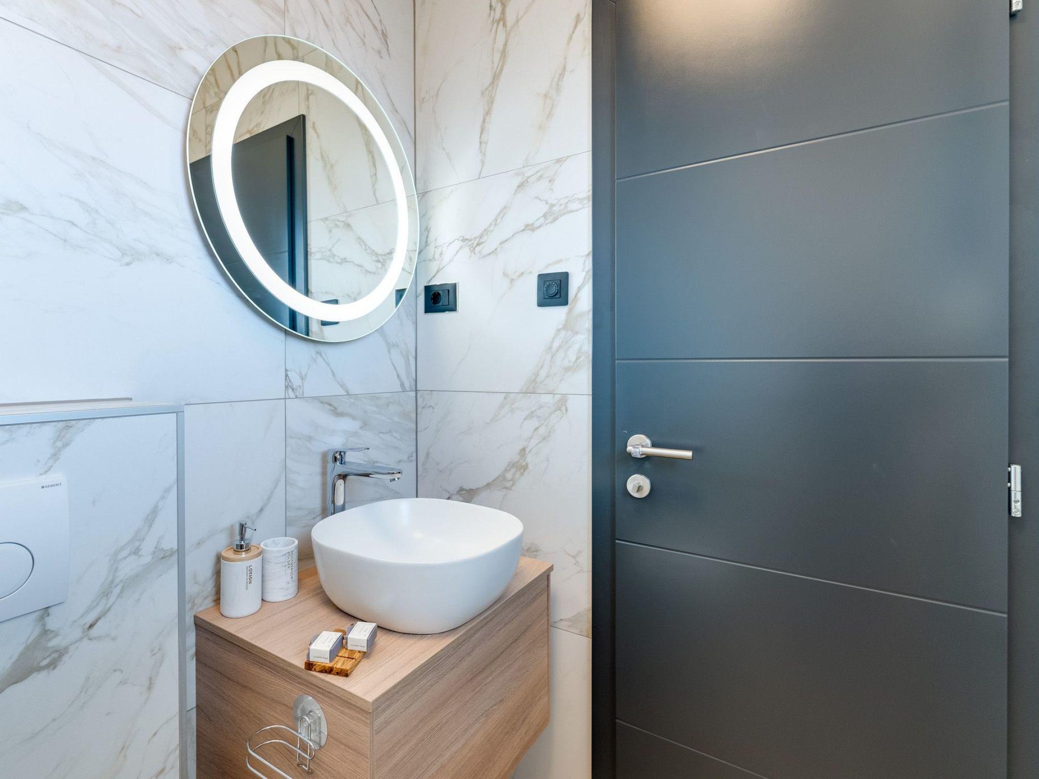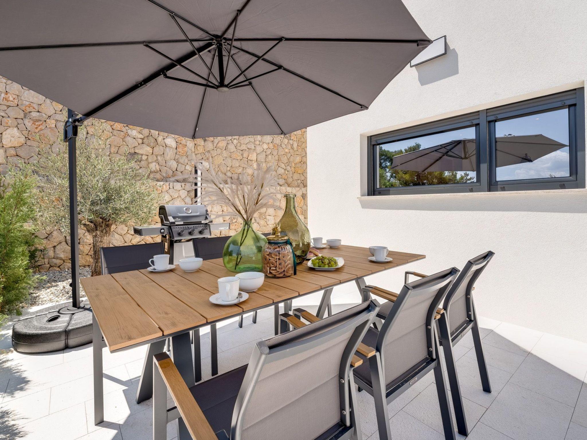 This brand new luxury villa is located on a hill above the romantic town of Vrbnik with spectacular panoramic sea views. The villa has 3 bedrooms and 4 bathrooms. On the ground floor of the villa, which is completely paved with the famous stone of the island of Brac (as is the whole area around the villa), there is a spacious living room, a kitchen with all appliances and a bathroom with a shower. From the living room, guests have direct access to the pool, which offers an unobstructed view of the sea and the greenery. The pool is 38 m2, has massage benches and a waterfall. Around the pool on the terrace there are sun loungers, a seating set with a large parasol, a grill and an outdoor shower. On the first floor of the villa there are three bedrooms, each with its own bathroom. Two rooms have their own large terrace and from all rooms you can enjoy the view of the sea and the old town of Vrbnik when you wake up in the morning. The villa is fully air-conditioned, has free WiFi, two parking spaces and is completely fenced. The nearest beach is 800 m from the villa, shops and restaurants are 500 m away.