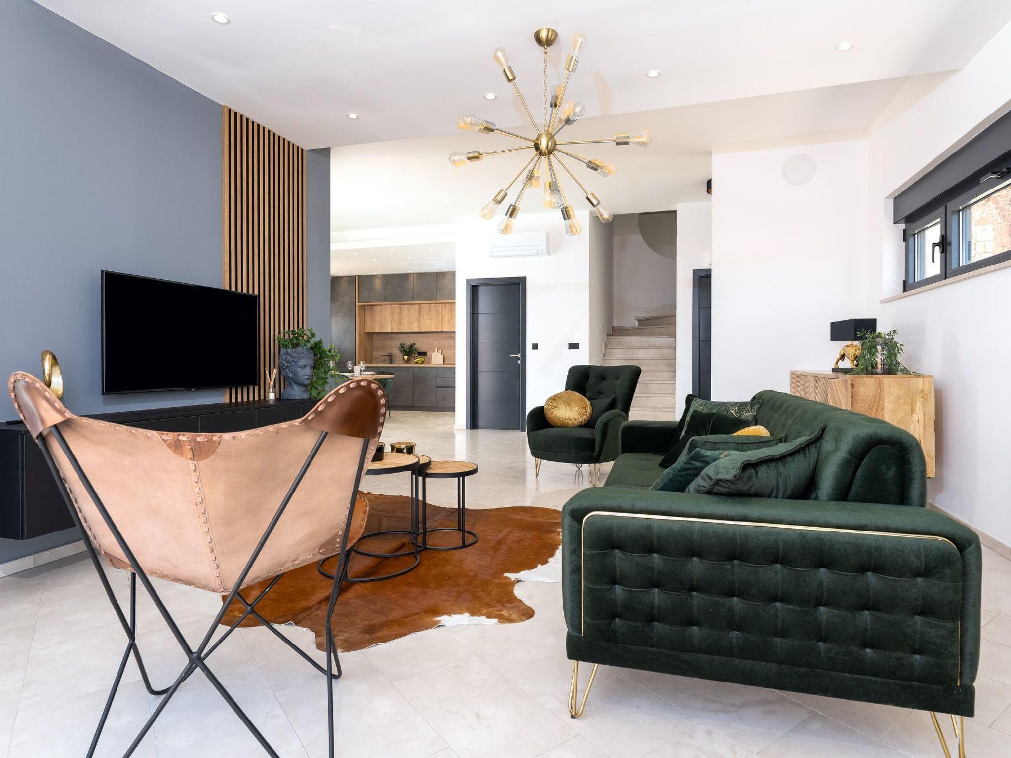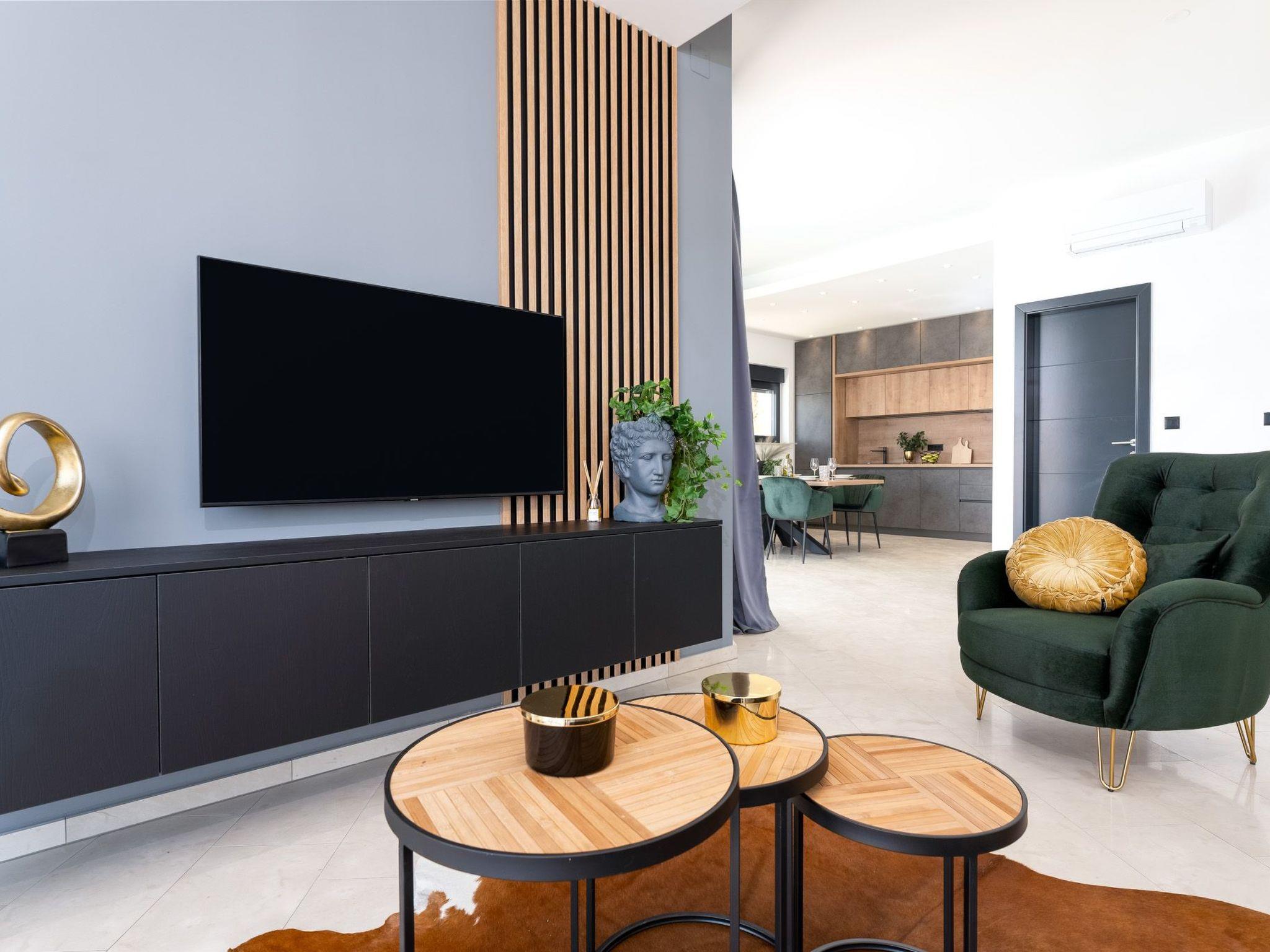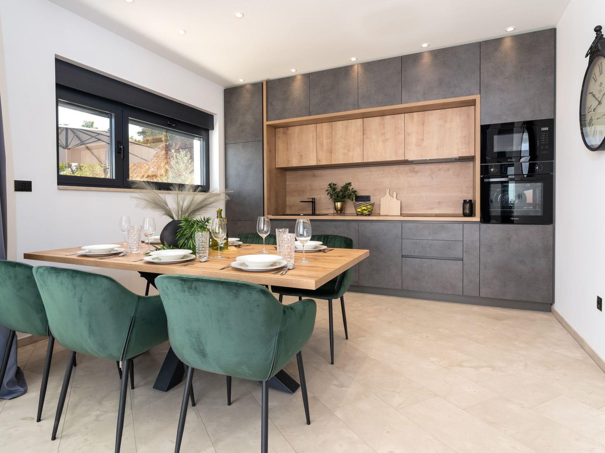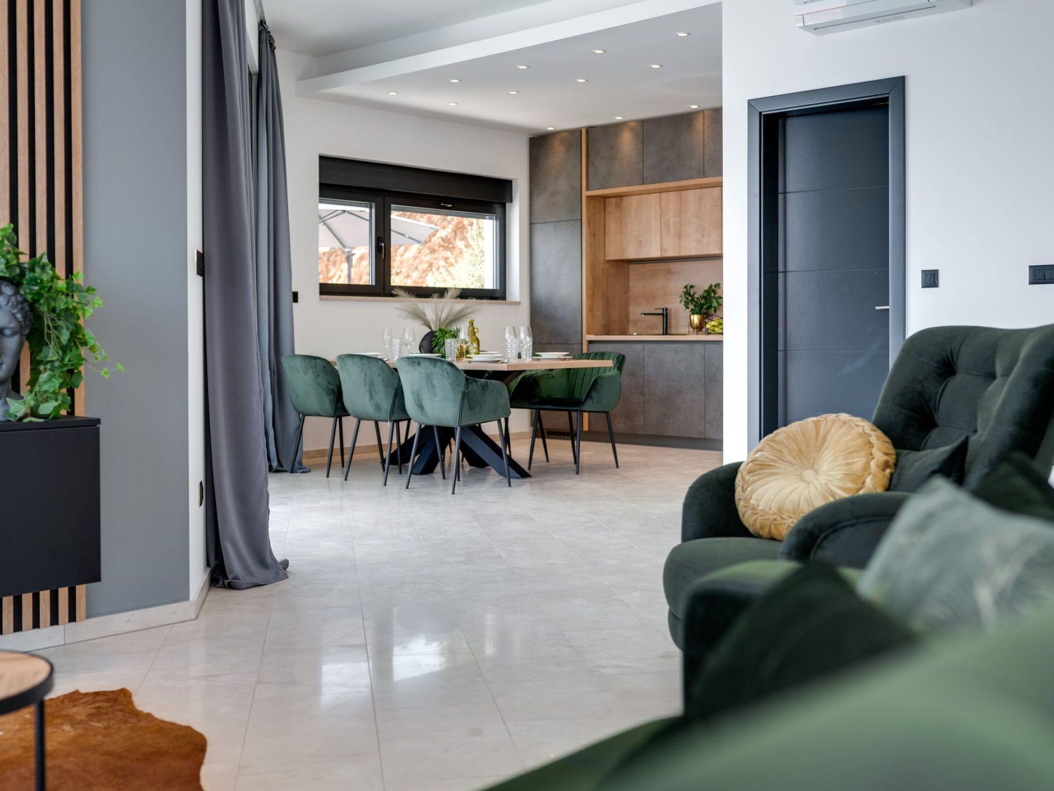 This brand new luxury villa is located on a hill above the romantic town of Vrbnik with spectacular panoramic sea views. The villa has 3 bedrooms and 4 bathrooms. On the ground floor of the villa, which is completely paved with the famous stone of the island of Brac (as is the whole area around the villa), there is a spacious living room, a kitchen with all appliances and a bathroom with a shower. From the living room, guests have direct access to the pool, which offers an unobstructed view of the sea and the greenery. The pool is 38 m2, has massage benches and a waterfall. Around the pool on the terrace there are sun loungers, a seating set with a large parasol, a grill and an outdoor shower. On the first floor of the villa there are three bedrooms, each with its own bathroom. Two rooms have their own large terrace and from all rooms you can enjoy the view of the sea and the old town of Vrbnik when you wake up in the morning. The villa is fully air-conditioned, has free WiFi, two parking spaces and is completely fenced. The nearest beach is 800 m from the villa, shops and restaurants are 500 m away.