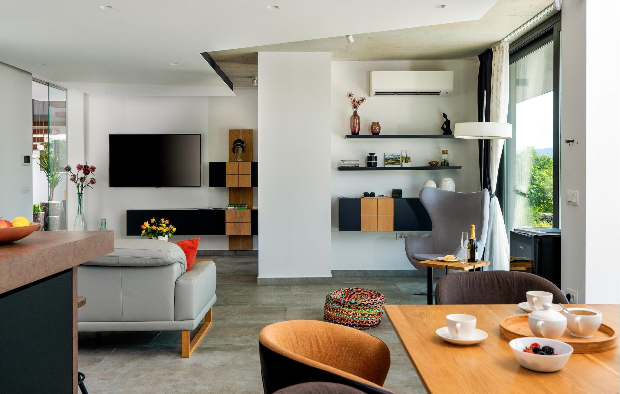 Dette skønne feriehus har en fantastisk udsigt til landskabet, og længere ude kan man skimte havet. Huset er hyggeligt indrettet med flotte stilvalg og smarte detaljer, så her får I en god ramme om jeres feriedage. Glæd jer til fælles måltider rundt om det store spisebord med udsigt til poolen og hyggelige aftener i sofahjørnet.