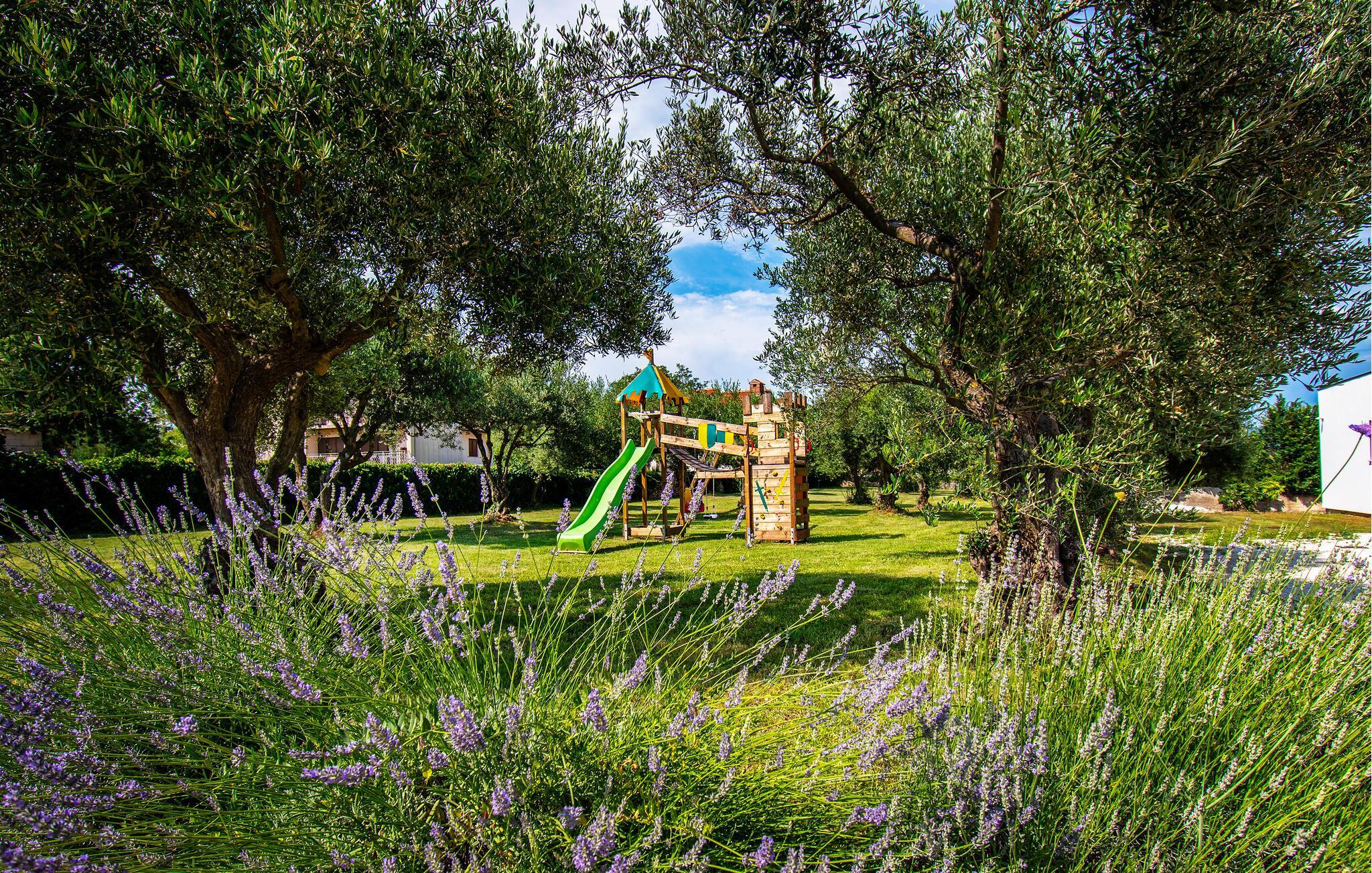 På grunden, som ligger idyllisk indlejret i landskabet, kan I læne jer tilbage i de behagelige liggestole eller svømme et par runder i poolen. Senere kan hele familien samles til en lækker grillmiddag og lade en skøn feriedag slutte i det fri.