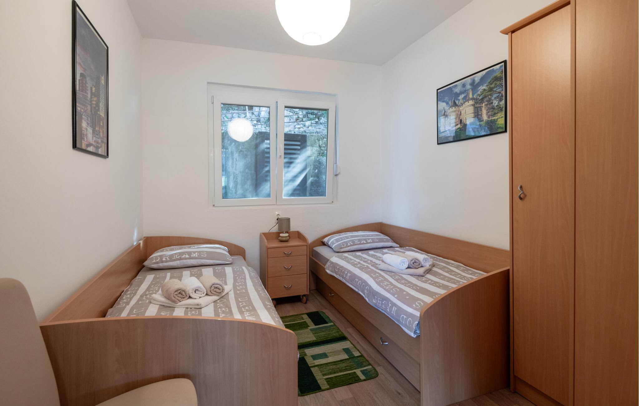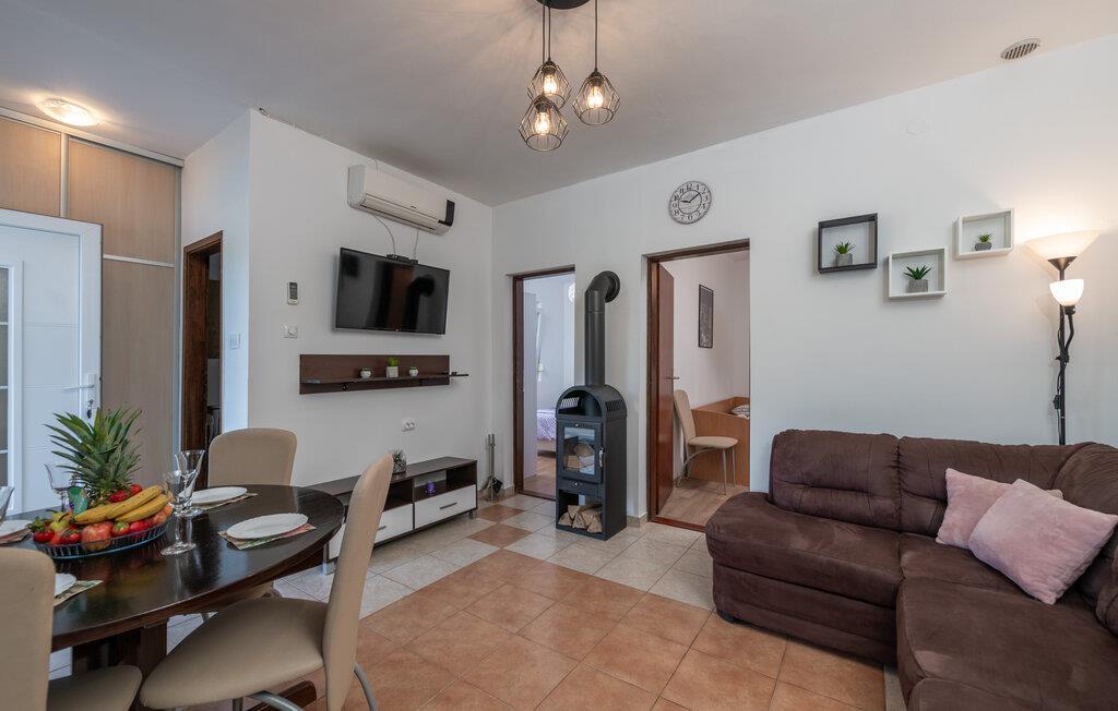 I den lille fiskerby Krnica, omgivet af mediterran natur og meget tæt på havet, ligger denne særlige ferielejlighed. Boligen har to soveværelse, dagligstue, køkken og badeværelse samt to terrasser med fantastisk havudsigt. Her kan i begynde dagen med en kop kaffe og nyde udsigten over bugten. I Krnica finder I ro og afslapning, langt fra menneskemænger med utallige små strande, der venter på jer. Der er trapper ned til de klippefyldte strande, som ligger ca. 20 m (luftlinje) herfra. Nyd panoramaudsigten på havet og den smukke bugt i Krnica.