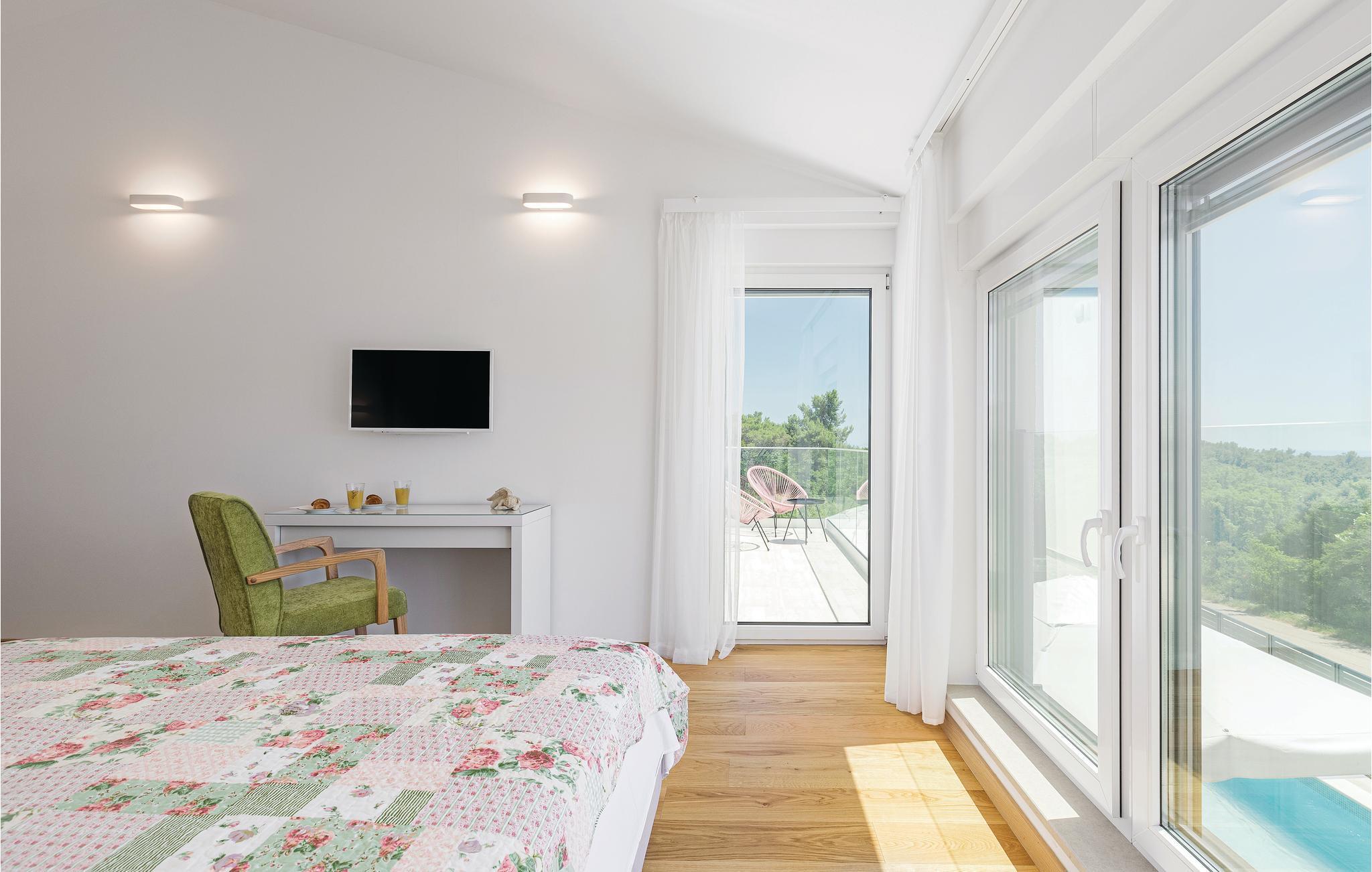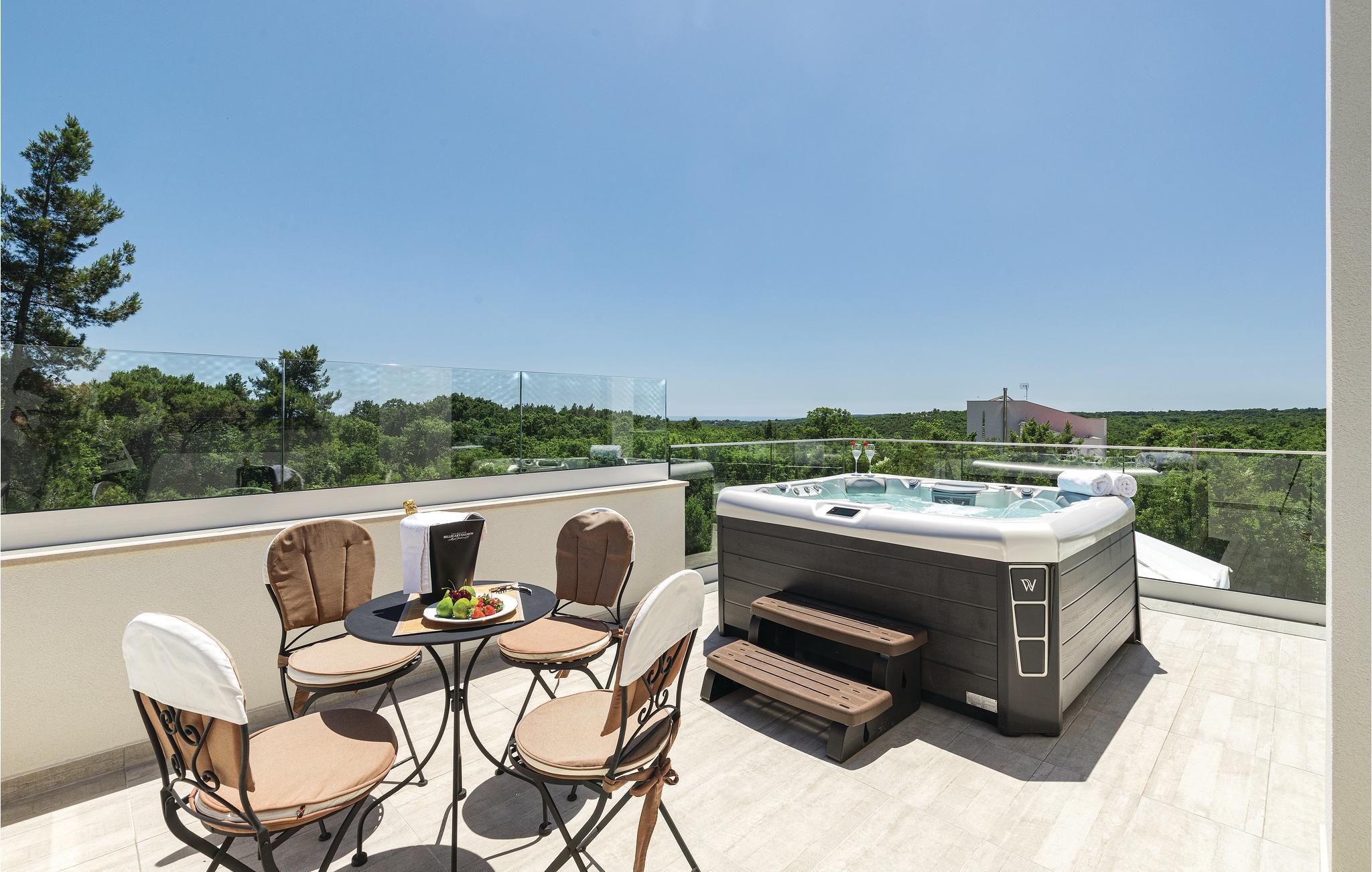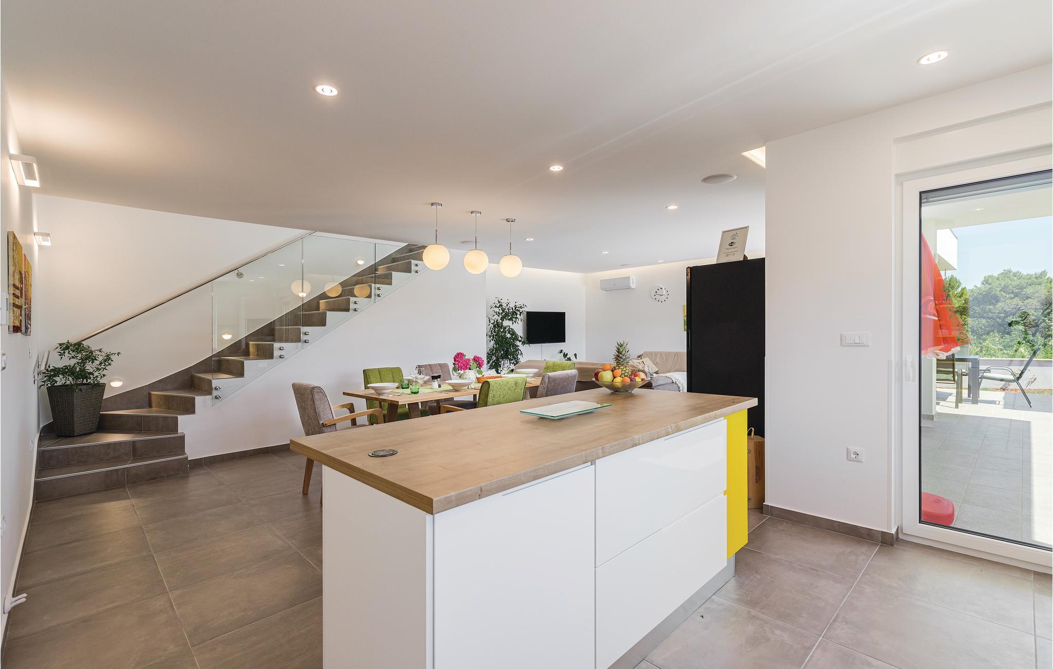 Nyd jeres ferie i denne skønne, komfortable og stilfuldt indrettede villa. Den rummelige opholdsstue i stueetagen har adgang direkte til verandaen og solområdet med pool, hvor der kan vente mange timers sjov med leg i det friske vand. Der er et soveværelse ligger i stueetagen og to yderligere på første sal, hvor der også er en terrasse med udendørs whirlpool. Udsigten fra terrassen til havet er betagende, men I kan også køre ned til strandene i Krnicki Porat og Rakalj på få minutter, hvis I gerne vil have lidt afveksling fra jeres egen pool i den indhegnede have.