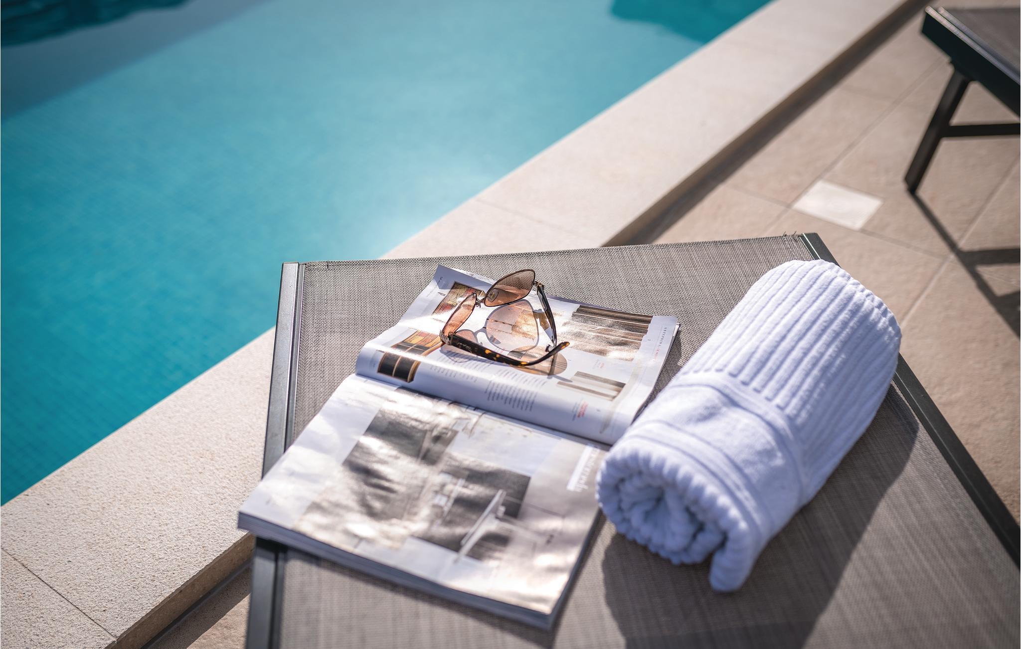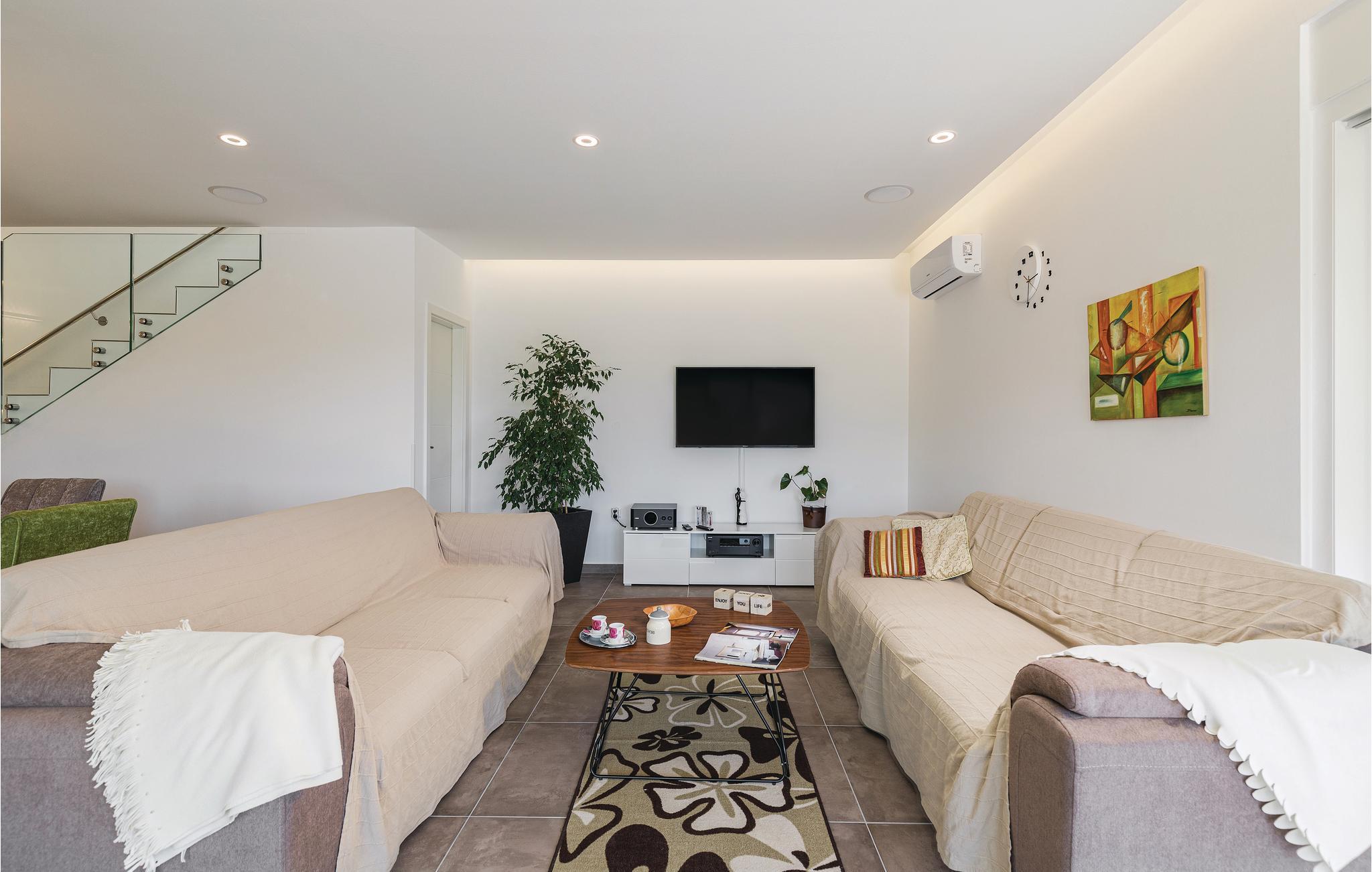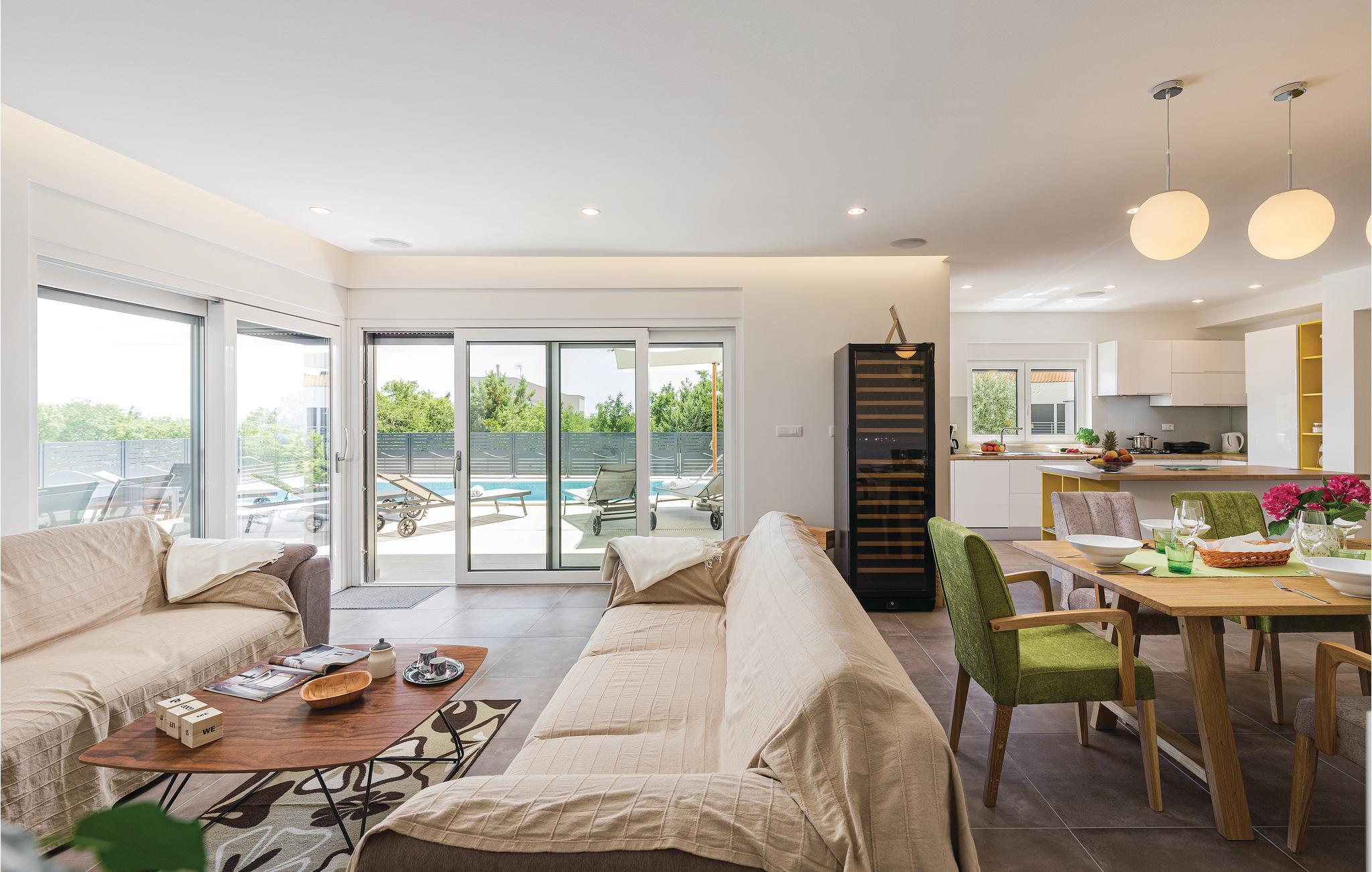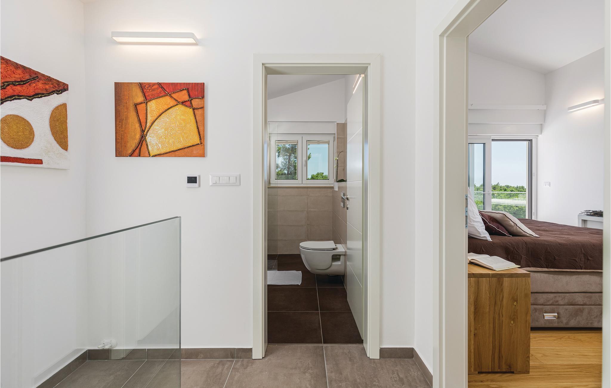 Nyd jeres ferie i denne skønne, komfortable og stilfuldt indrettede villa. Den rummelige opholdsstue i stueetagen har adgang direkte til verandaen og solområdet med pool, hvor der kan vente mange timers sjov med leg i det friske vand. Der er et soveværelse ligger i stueetagen og to yderligere på første sal, hvor der også er en terrasse med udendørs whirlpool. Udsigten fra terrassen til havet er betagende, men I kan også køre ned til strandene i Krnicki Porat og Rakalj på få minutter, hvis I gerne vil have lidt afveksling fra jeres egen pool i den indhegnede have.