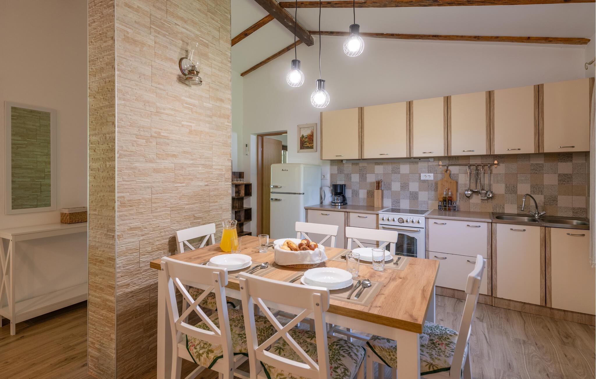 Velkommen til jeres hyggelige feriehus i Krnica, der byder på en smuk indretning og en indbydende atmosfære med lyse, venlige rum og komfortable møbler. Hyg jeres sammen i jeres ferie med madlavning, fælles middage og afslapning, og brug også udendørsarealerne.